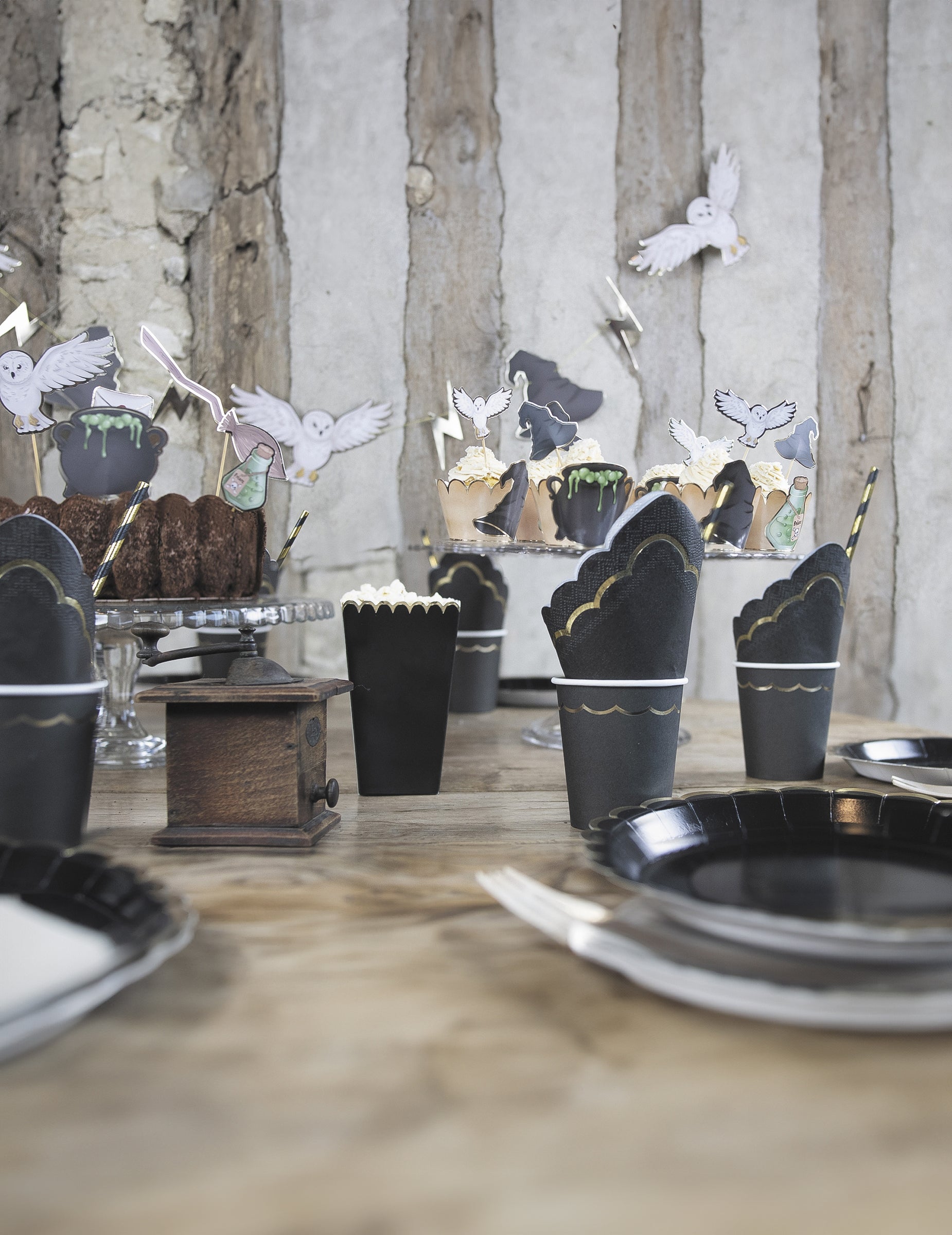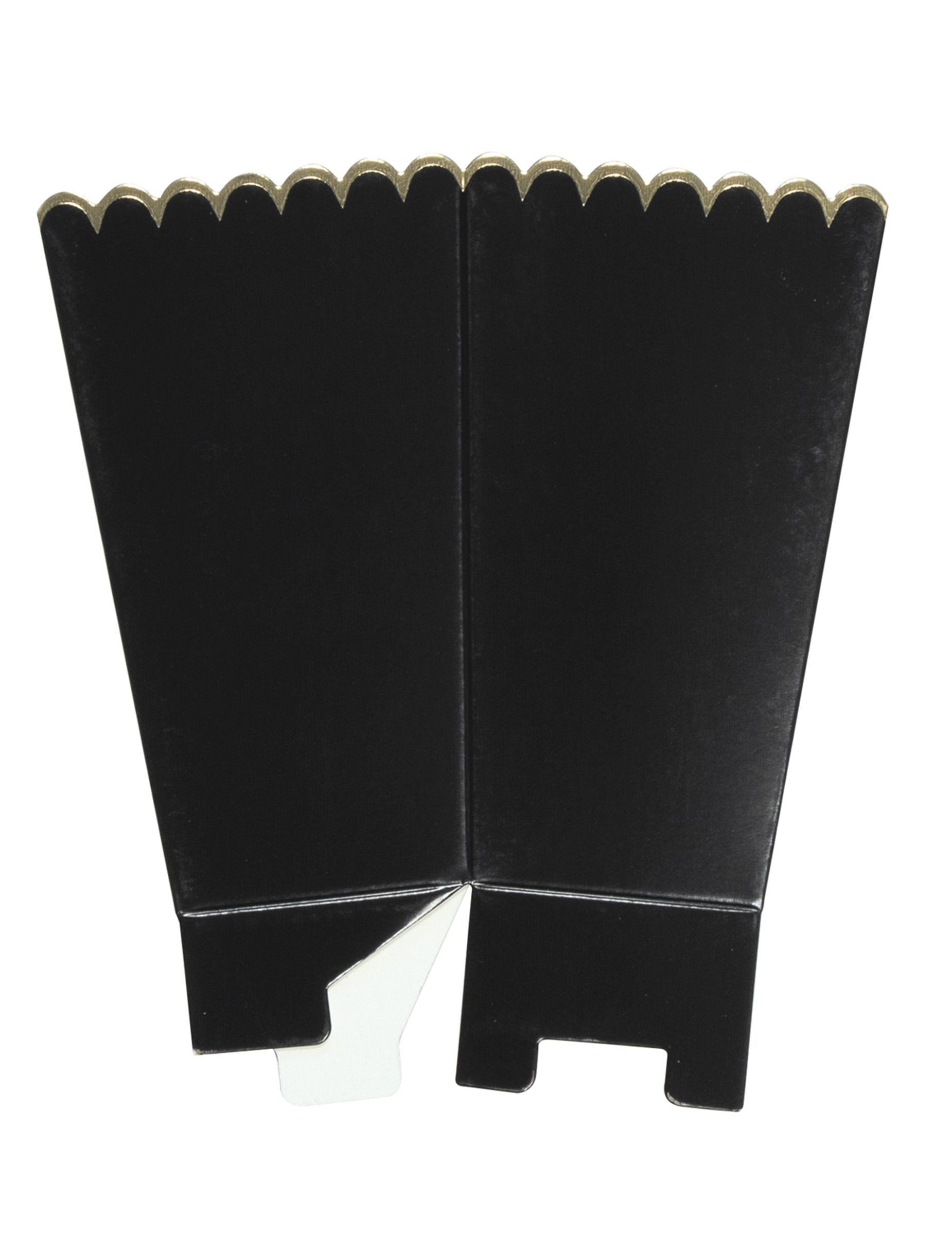 Ce lot comprend 8 boîtes à pop-corn en carton d'une taille de 12,5 x 7 cm. Leur coloris noir est mis en valeur par des bordures dorées au style festonné. Ces contenants sont parfaits pour accueillir des friandises ou des cadeaux lors d'un goûter d'anniversaire ou pour célébrer Halloween.