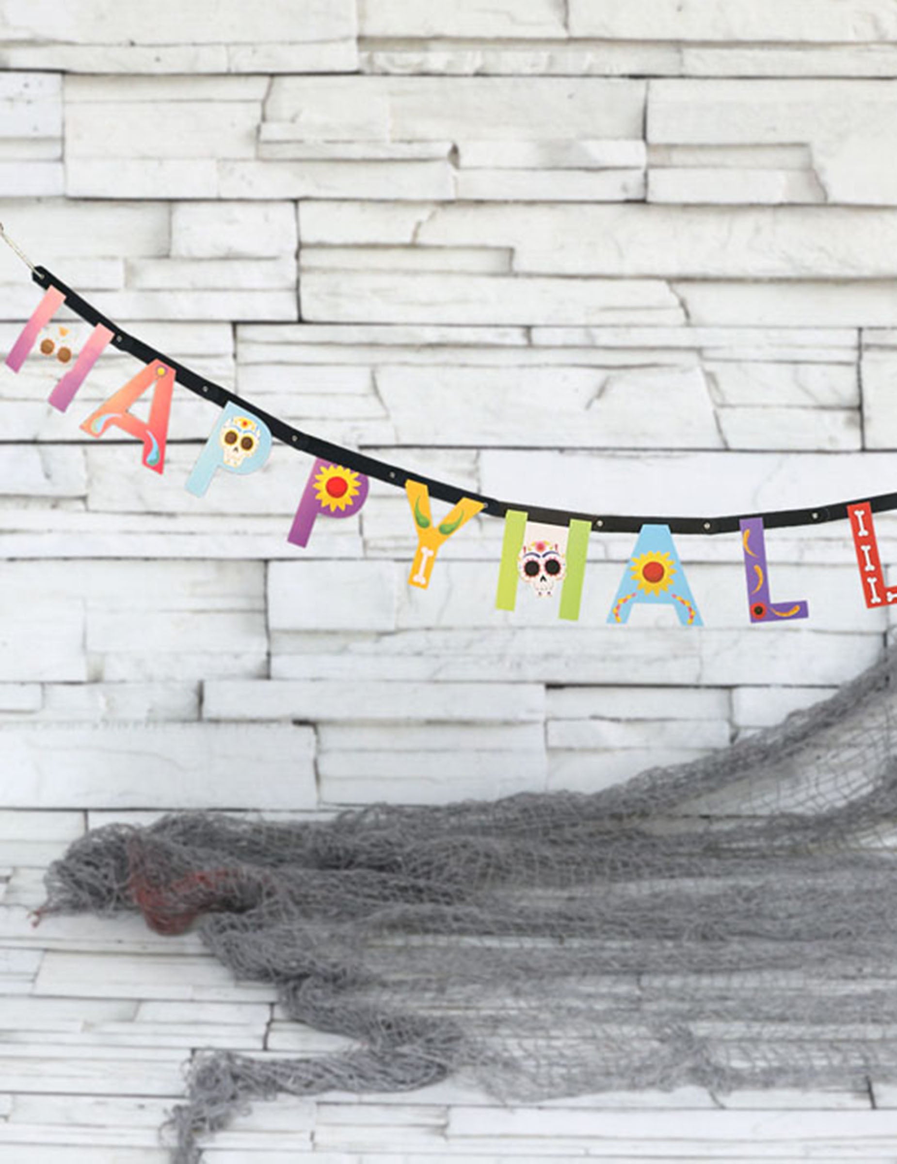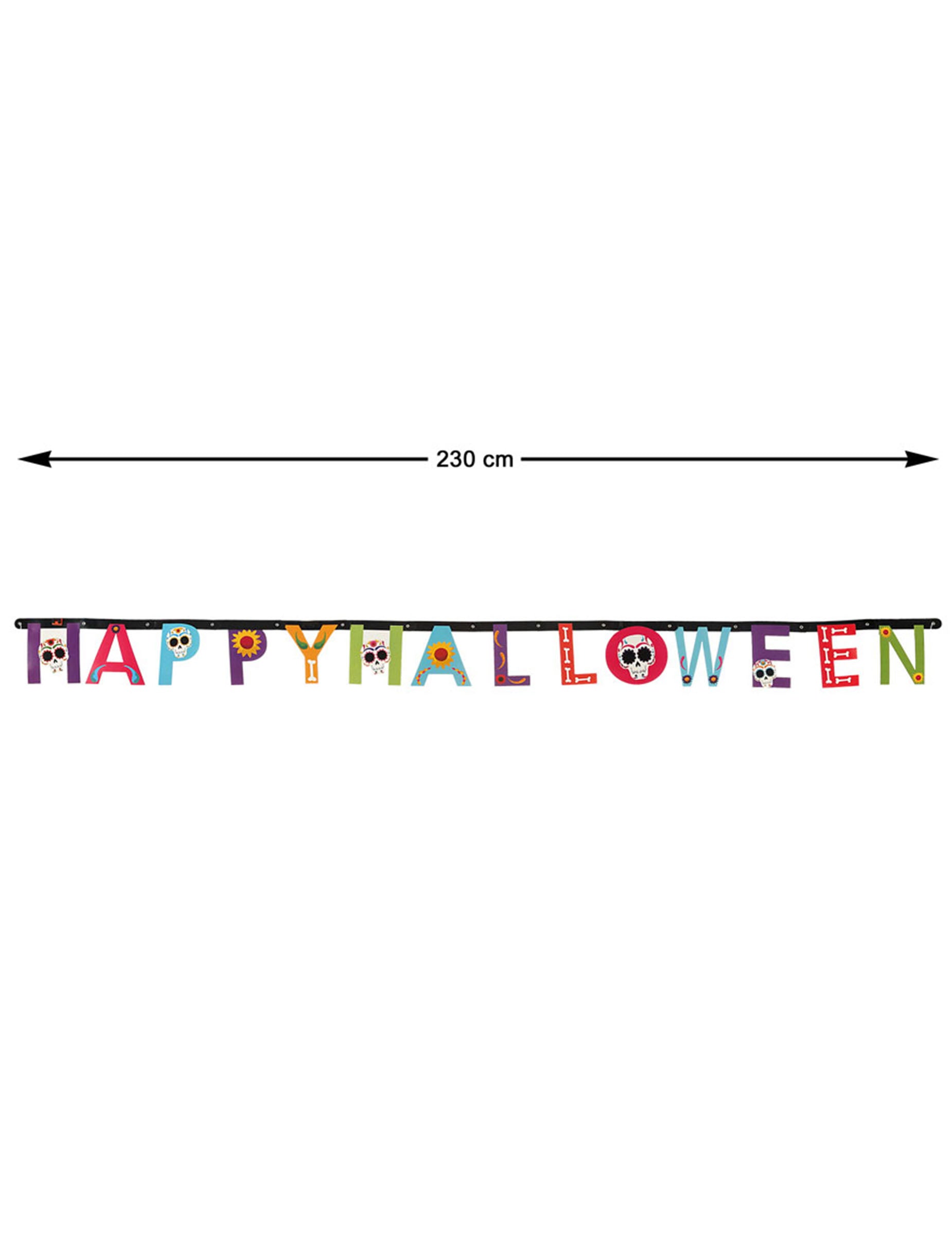 Această ghirlandă colorată poartă mesajul „Happy Halloween”. Măsoară aproximativ 230 cm lungime. Scrisorile sunt decorate și capetele de moarte sunt tipărite pe ele. Puteți să -l suspendați prin șirurile furnizate pe capete. Această ghirlandă va fi perfectă pentru a -ți completa decorarea camerei pentru Halloween sau pentru o seară deghizată!