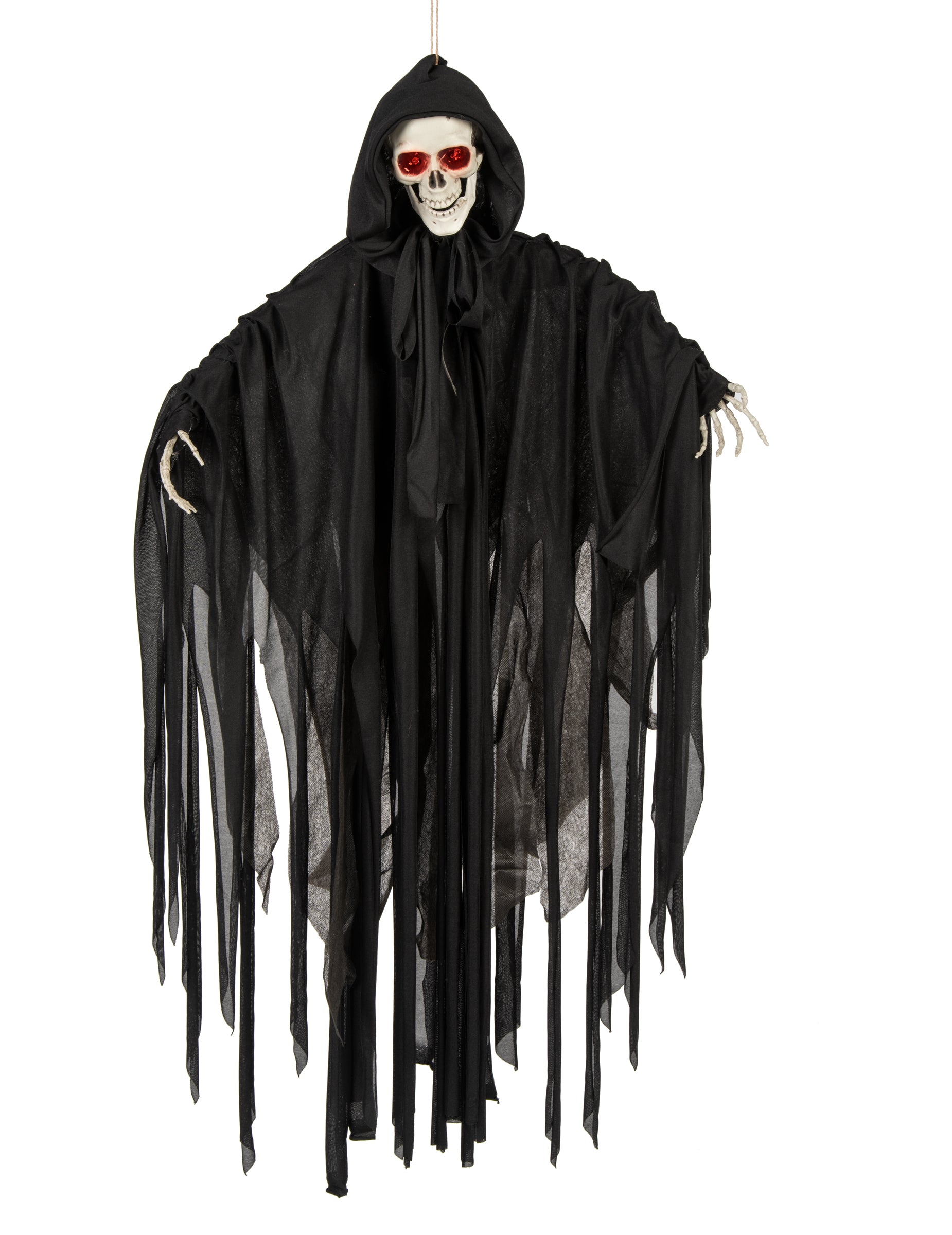 Acest schelet luminos, sunet și animat de Halloween măsoară aproximativ 90 cm înălțime. Această decorare, îmbrăcată în negru, are o mască de tip schelet, cu ochi roșii și mâini de schelet. Țesătura cu efect sfâșiat, adaugă și mai neplăcut întreg, îl puteți agăța cu ușurință oriunde doriți să folosiți un cablu situat deasupra capului de plastic al scheletului. Când fantoma aude sunetul în apropiere, va începe să se miște și să sune pentru realismul uluitor! Va fi necesar să aduceți 3 baterii AA pentru a vă pune în funcțiune decorarea. Această suspendare va fi de circumstanță pentru a stabili tonul pentru seara ta de groază în timpul petrecerii tale de Halloween!