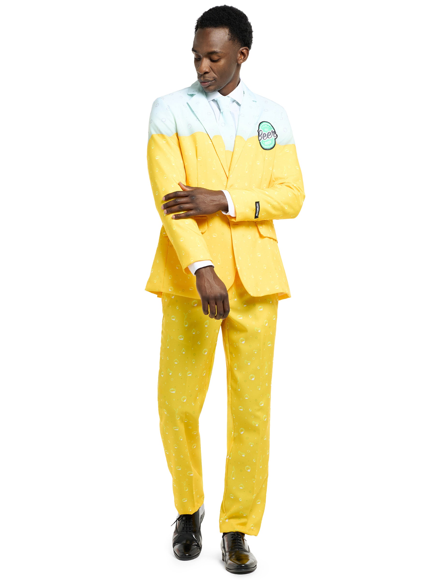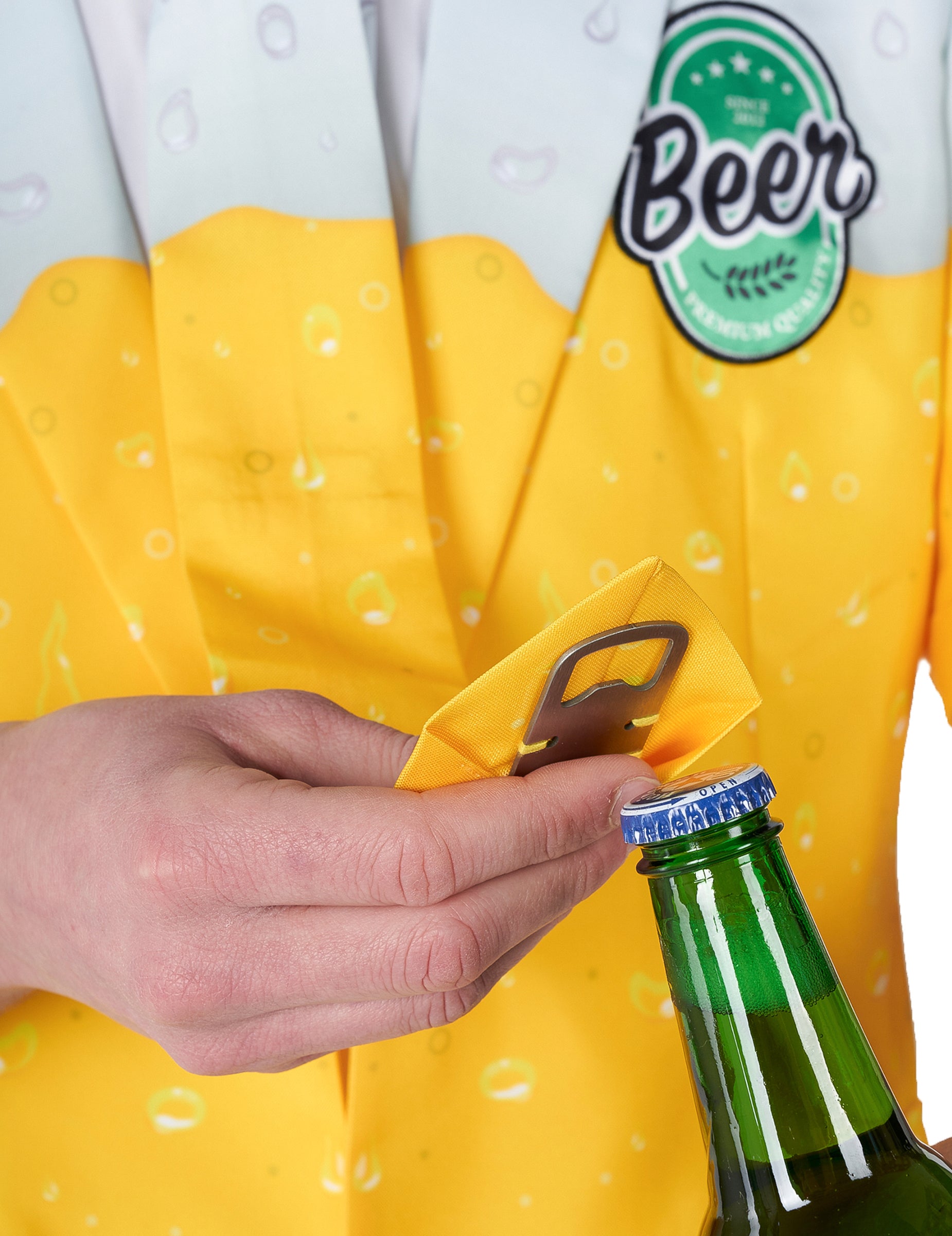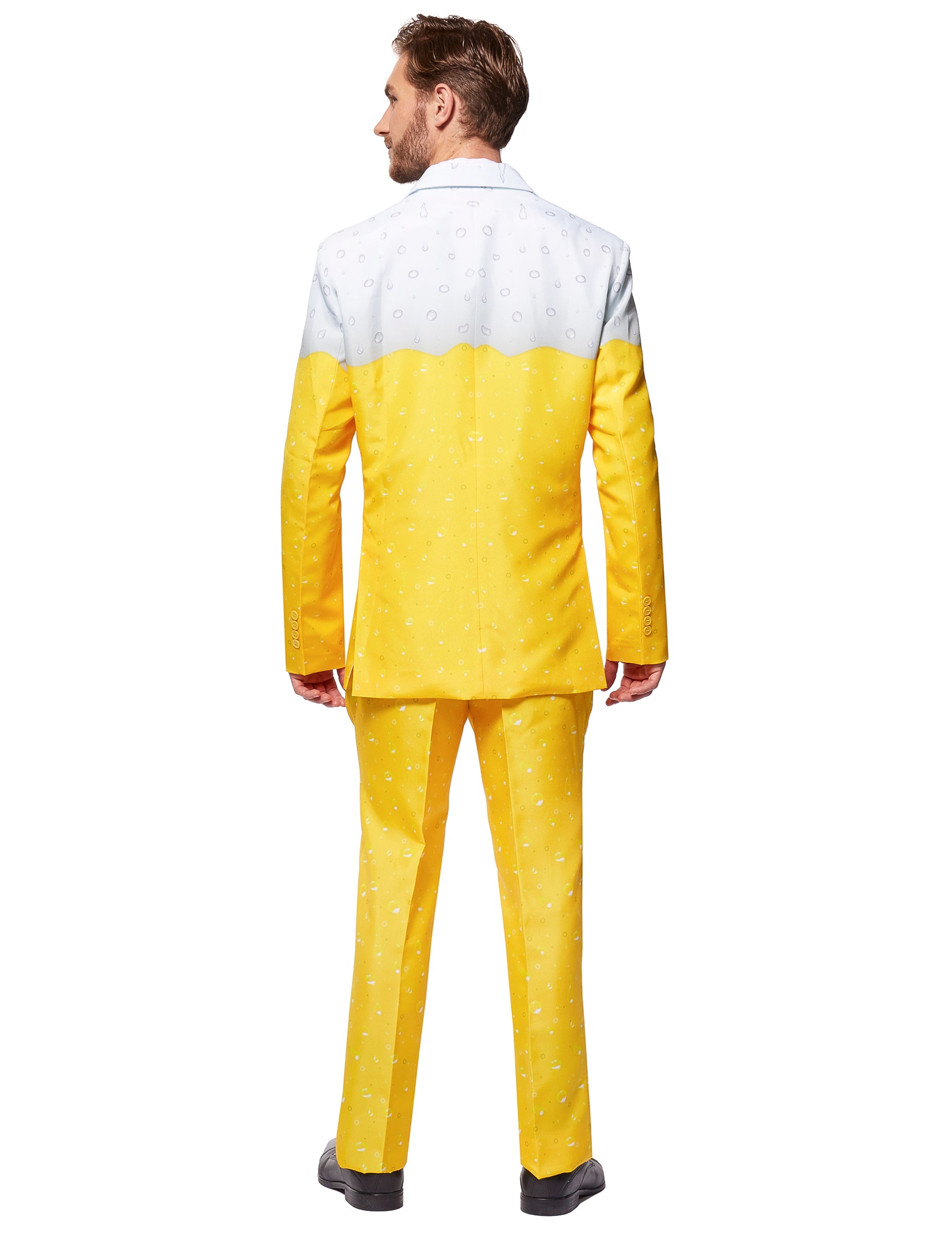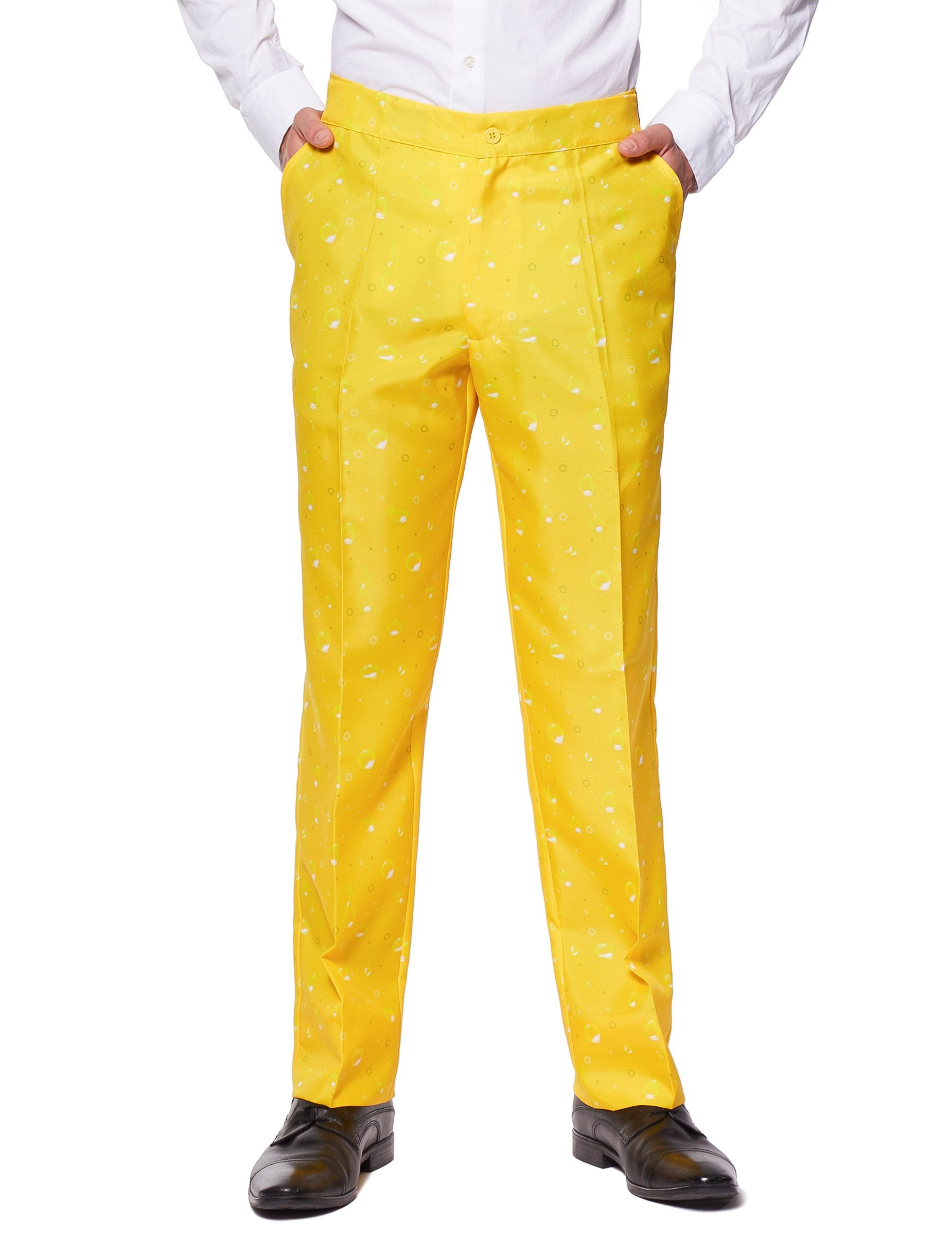 Acest costum de bere galben este pentru adulți. Este format dintr -un sacou, pantaloni și o cravată sponsor. Întregul costum are gusturi ușoare de apă pentru a imita picăturile de băut, acestea sunt imprimate direct în general. Această mică atingere suplimentară și subtilă va face toată diferența! Geaca de costum are culoare galbenă și albă. Are două butoane de plastic galbene ca atașament central, precum și un logo „bere” desenat în verde, scris pe partea stângă. Sunt prezente și două buzunare false. În ceea ce privește pantalonii, este de culoare galbenă simplă, cu două buzunare laterale. O egalitate de potrivire va completa acest costum. Ca gadget, este inclus un mic decapalator în cadrul cravatei! Îl puteți folosi discret și puteți crea un climat de gelozie în jurul vostru! Sărbătoriți Sfântul Patrick într -un costum elegant și elegant, scoateți jocul mare pentru o seară de temă!