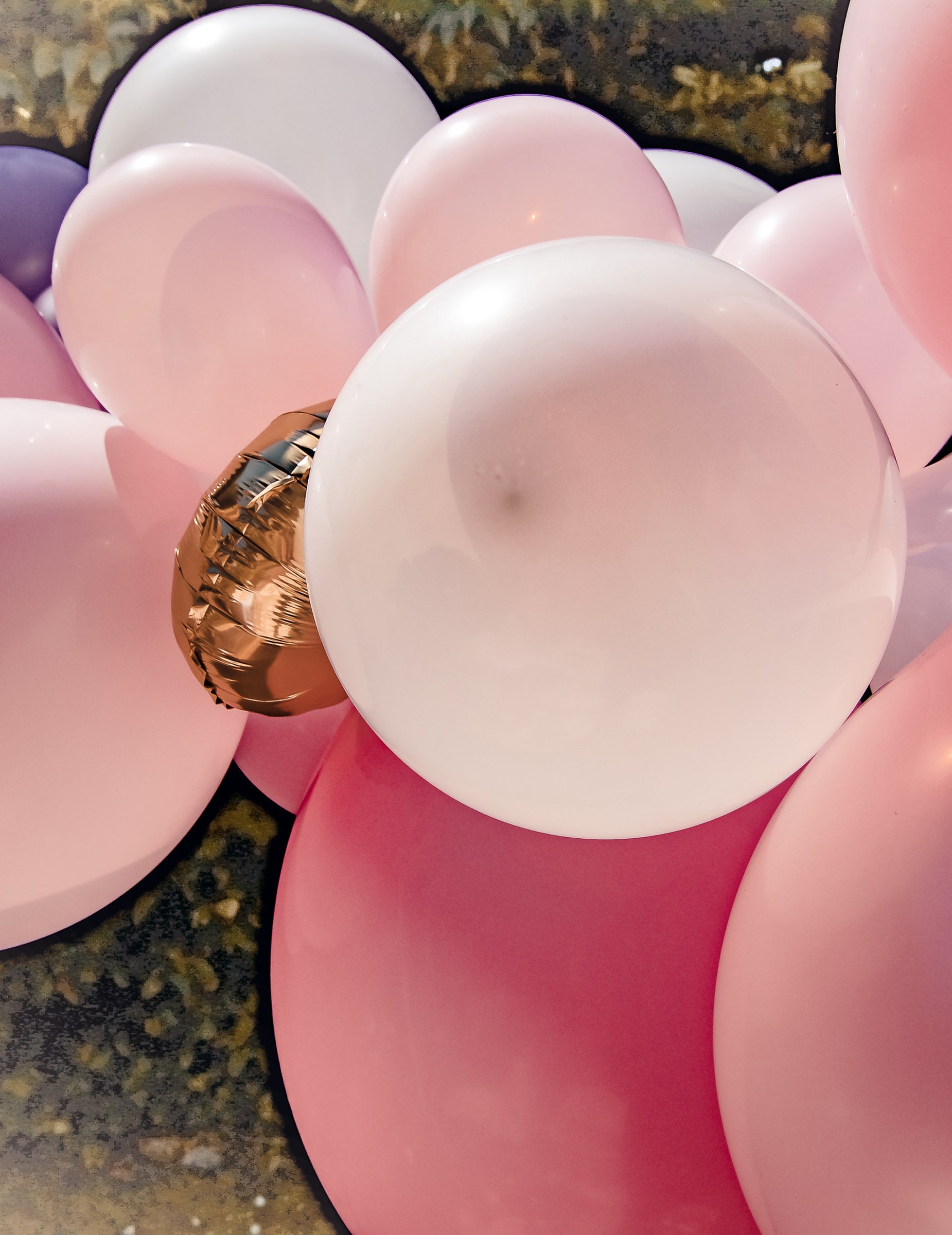 Set arcadă cu 57 de baloane roz, alb și auriu