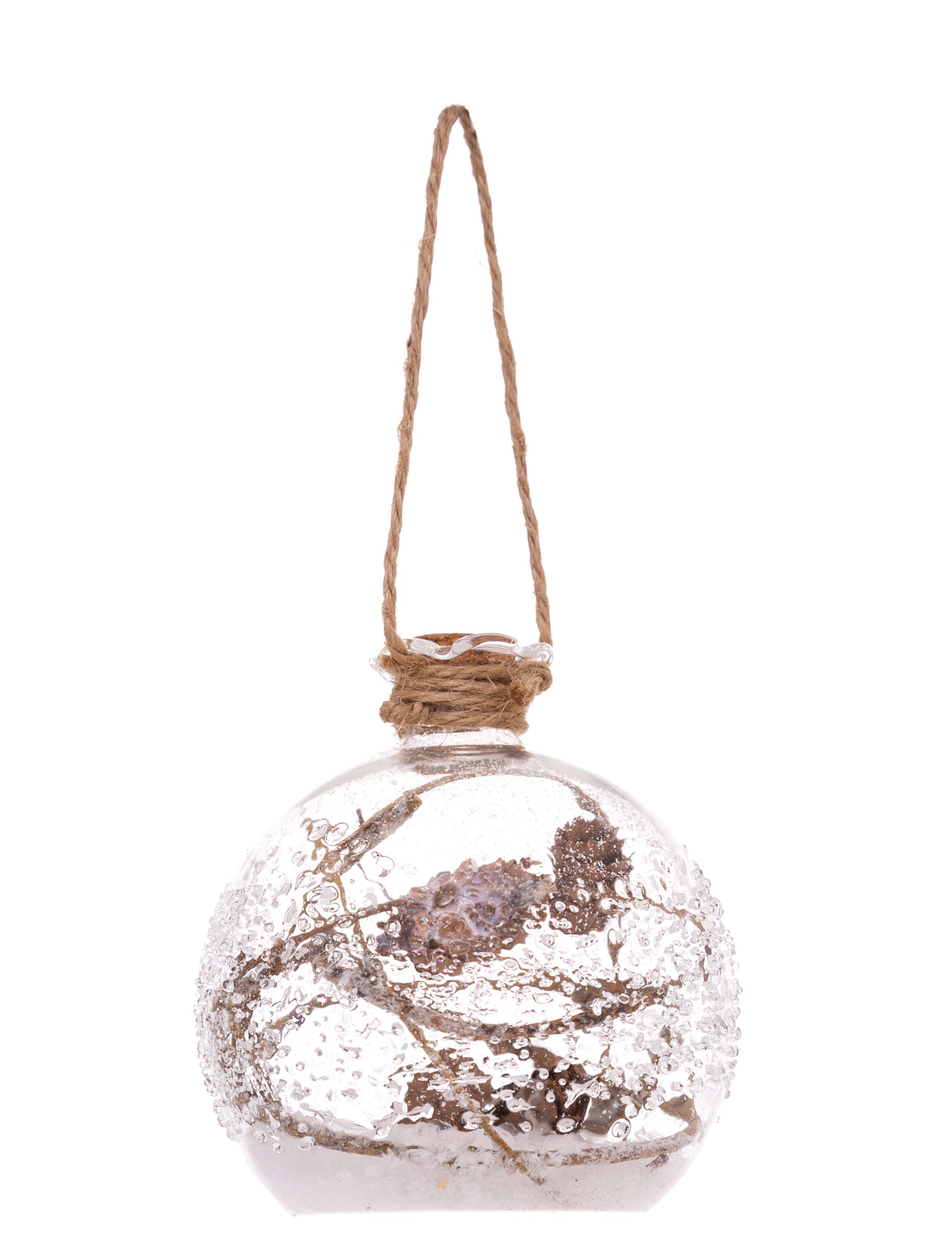 Această minge de Crăciun este din sticlă și are un diametru de aproximativ 9 cm. Reprezintă un mic flacon înghețat care conține ramuri și zăpadă artificială. Un șir îi permite să fie suspendat cu ușurință. Acest flacon destul de natural acoperit cu zăpadă este complementul ideal pentru decorarea copacilor de Crăciun!