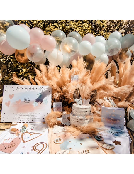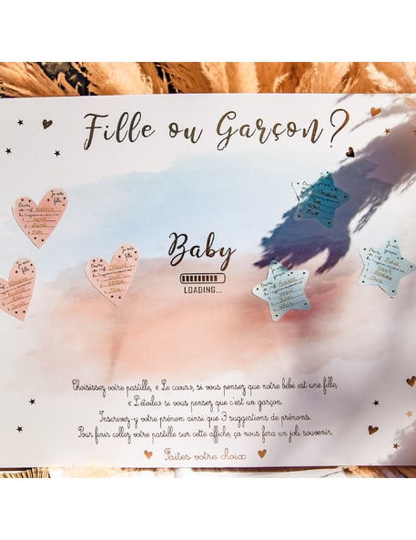 Înviorează-ți petrecerea cu asta tablă de joc interactiv 56 x 43 cm. Prezentarea întrebării "Fată sau băiat?„Cu litere aurii pe un fundal gradient roz și albastru, acest kit include 32 de autocolante în formă de inimă și stea. Fiecare invitat își alege culoarea, își scrie numele și predicțiile înainte de a lipi autocolantul pe poster. Suspansul durează până la...” revelația de gen al copilului. Perfect pentru un petrecere de dezvăluire a genuluiAcest accesoriu distractiv vă permite să păstrați o amintire frumoasă a acestui moment unic.