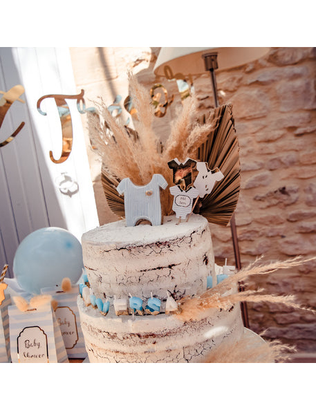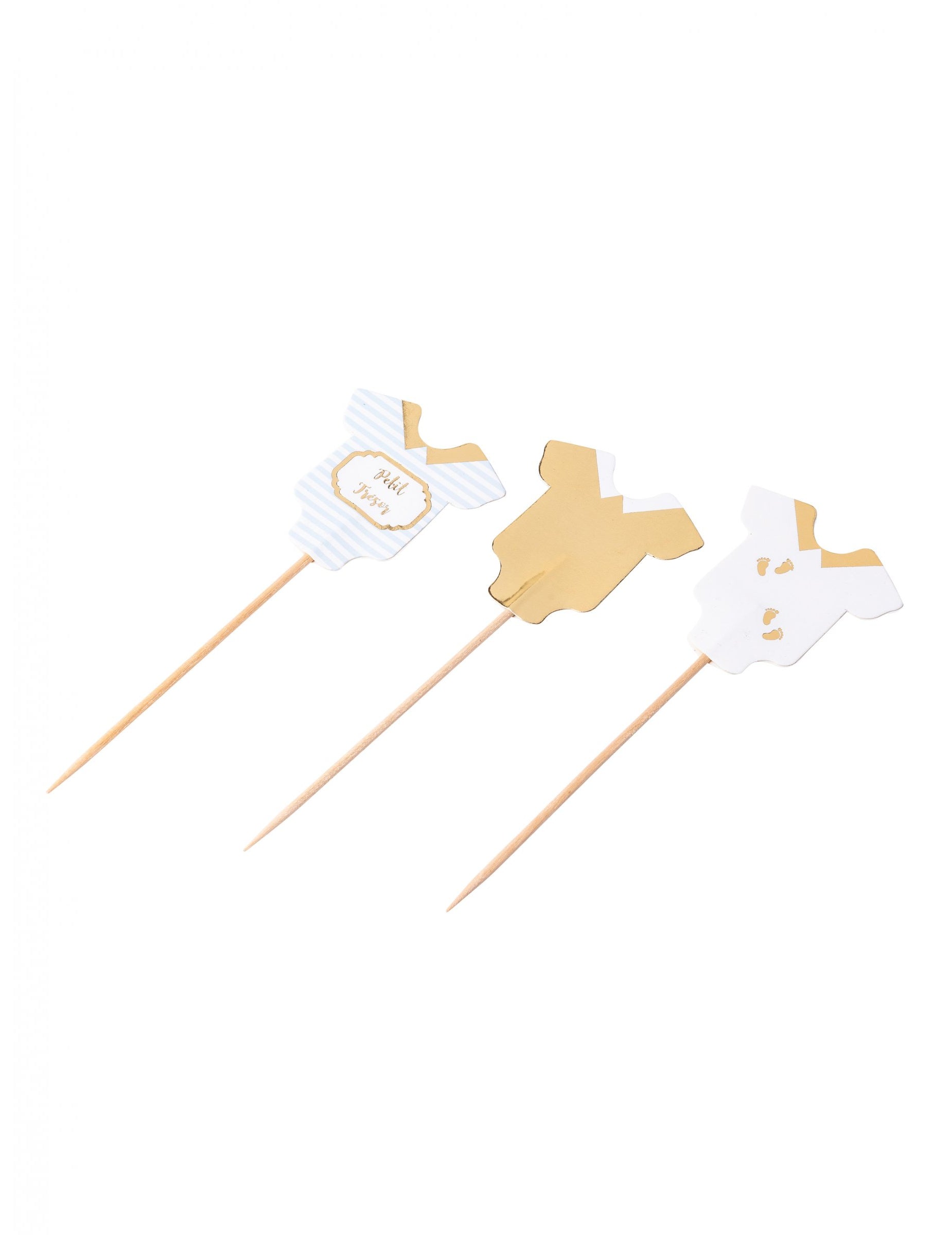 Adăugați o notă de dulceață bufetului dvs. cu acest set de 12 frigărui de lemn măsurând 12 cm. Fiecare frigăruie este acoperită cu un decor din carton reprezentând un corp în nuanțe de albastru, alb și auriu. Unele modele prezintă piciorușe drăguțe, în timp ce altele poartă mesajul mică comoarăAceste accesorii sunt aliații ideali pentru a vă îmbunătăți brioșele și produsele de patiserie în timpul unei petrecere pentru bebeluși sau pentru a sărbători o Prima aniversare.