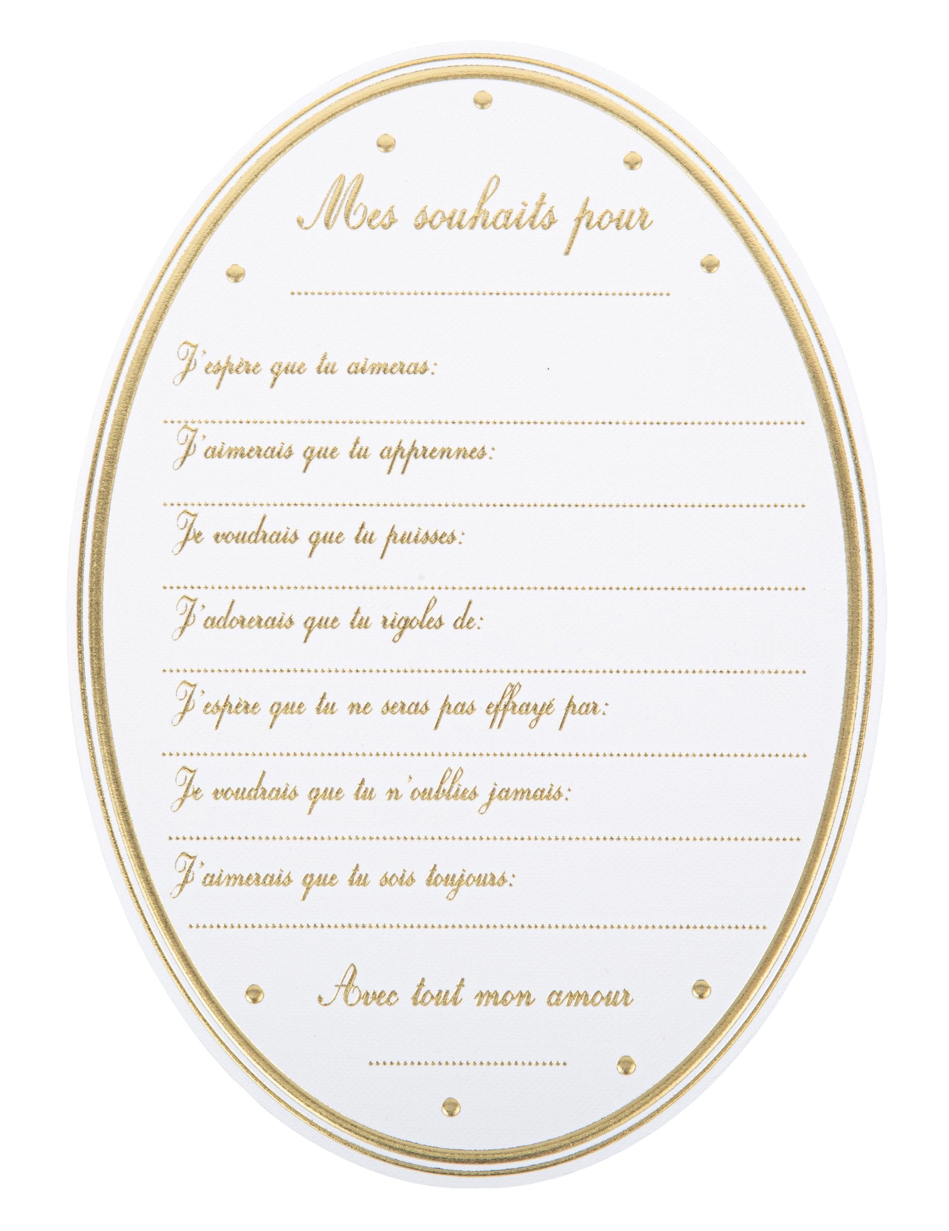 Acest set include 8 felicitări Cu designul lor alb și auriu, aceste felicitări în formă de medalion îi invită pe cei dragi să completeze fraze tandre precum „Aș vrea să înveți...” sau „Aș vrea să nu uiți niciodată...”. felicitări vă va permite să păstrați amintiri prețioase în timpul unei petrecere pentru bebeluși sau pentru a sărbători Prima aniversare al copilului dumneavoastră.