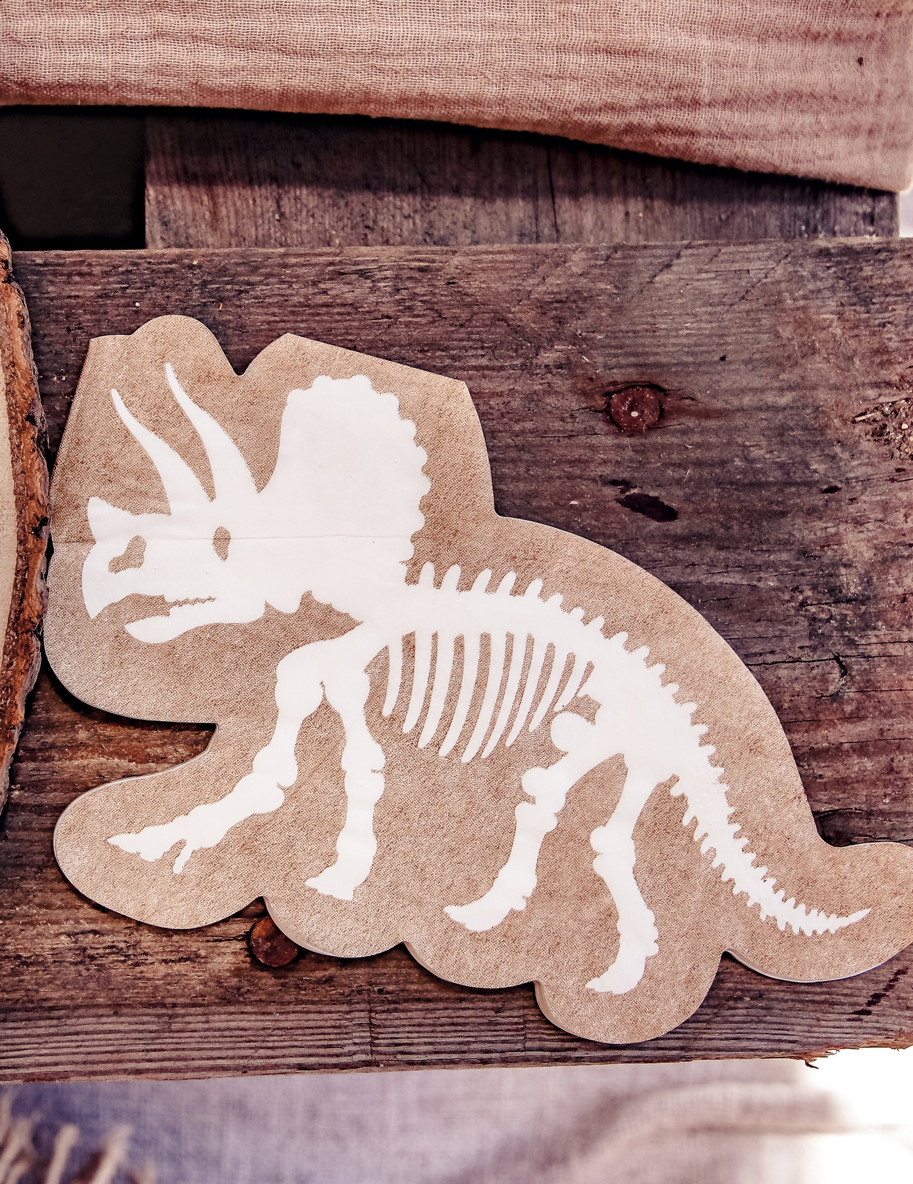 Acest lot conține 16 prosoape de unică folosință, cu dimensiunile de 33 x 20 cm când sunt desfășurate. Fabricate din hârtie kraft, sunt decorate cu un model alb reprezentând un schelet de triceratopsAceste articole de petrecere vor fi perfecte pentru a completa decorațiunile tale. ziua de naștere pe Temă dinozauri.
