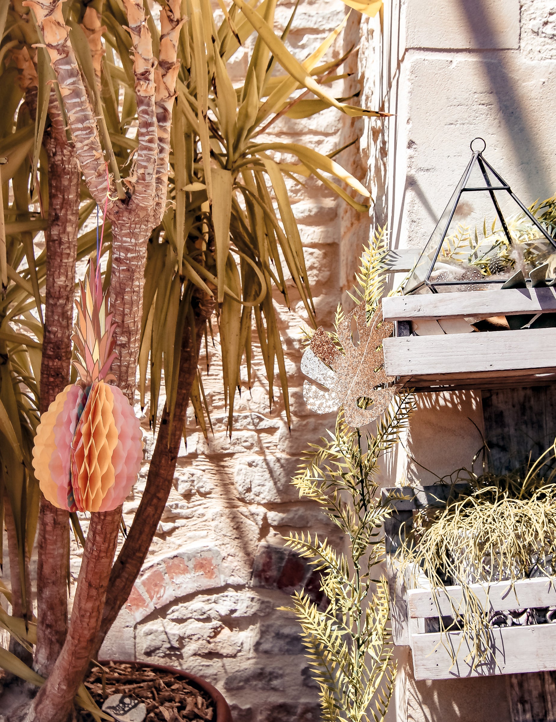 Această frumoasă ananas Nuanțele de roz și galben prezintă foi de carton colorate cu finisaje aurii elegante.