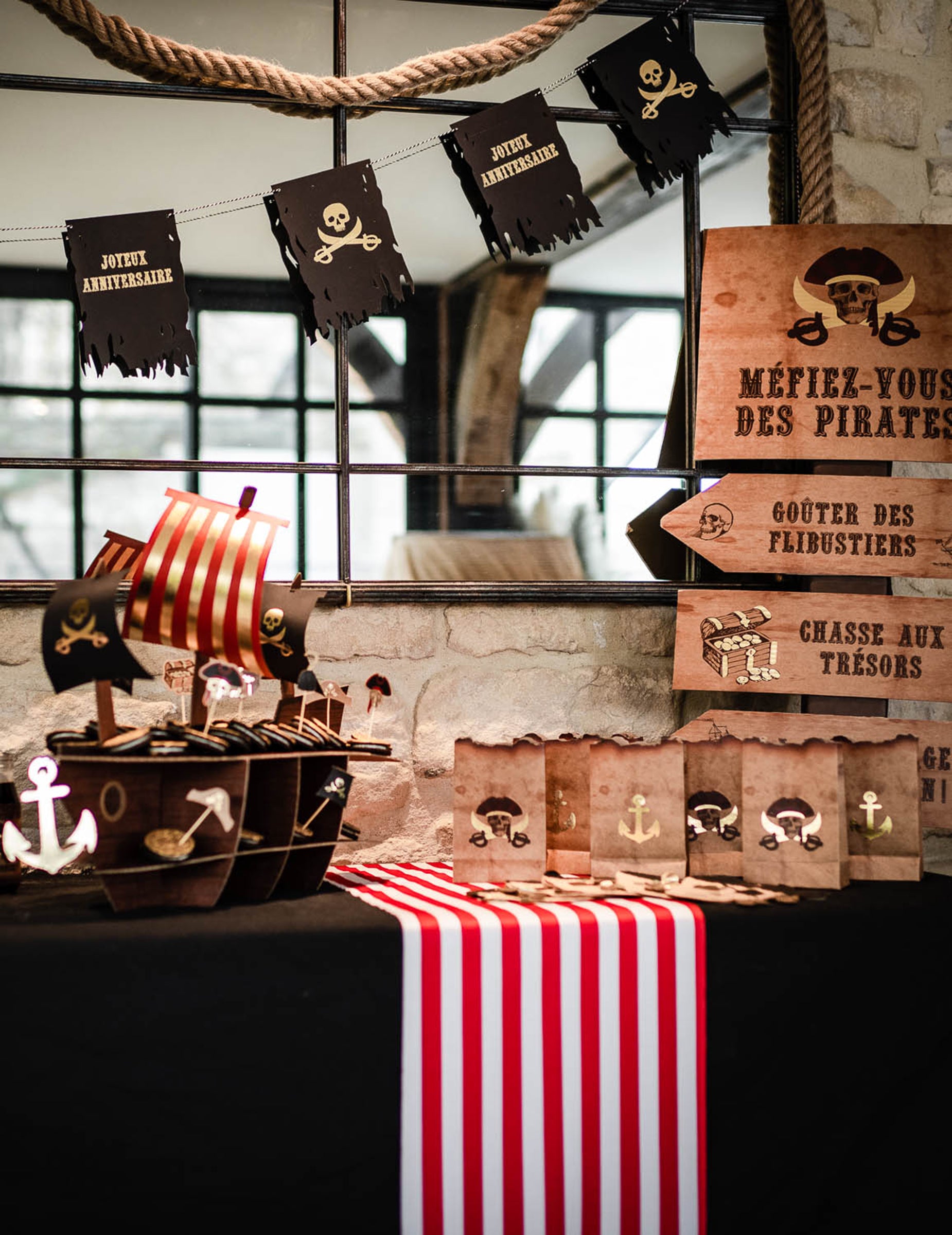 Acest panou include 4 săgeți de semnare în Kraft și măsoară aproximativ 75 x 40 cm. El are diverse modele de pirați: barcă, craniu și comoară, precum și inscripții care vor ghida pirații în devenire. Cuvintele „Ferește -te de pirații” sunt depășite de un craniu pirat. Acest panou direcțional va fi ideal pentru completarea decorației dvs. pe tema piratului și pentru a indica drumul către Moussaillons!