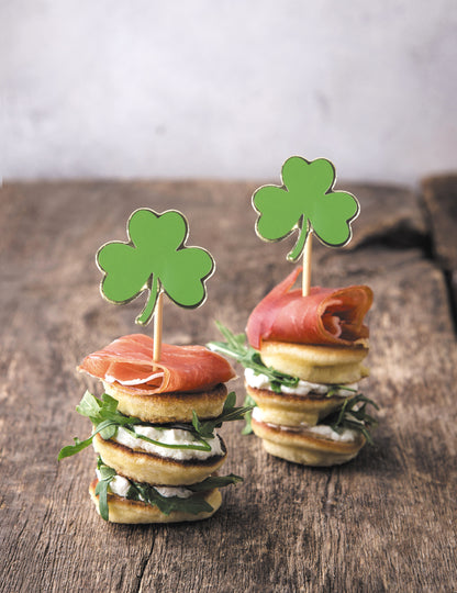 Aceste vârfuri de lemn de trifoi sunt vândute cu 10. Sunt aproximativ 8 x 5 cm și reprezintă un trifoi verde. Decorați -vă prăjiturile și aperitele cu aceste vârfuri cu ocazia Sfântului Patrick!