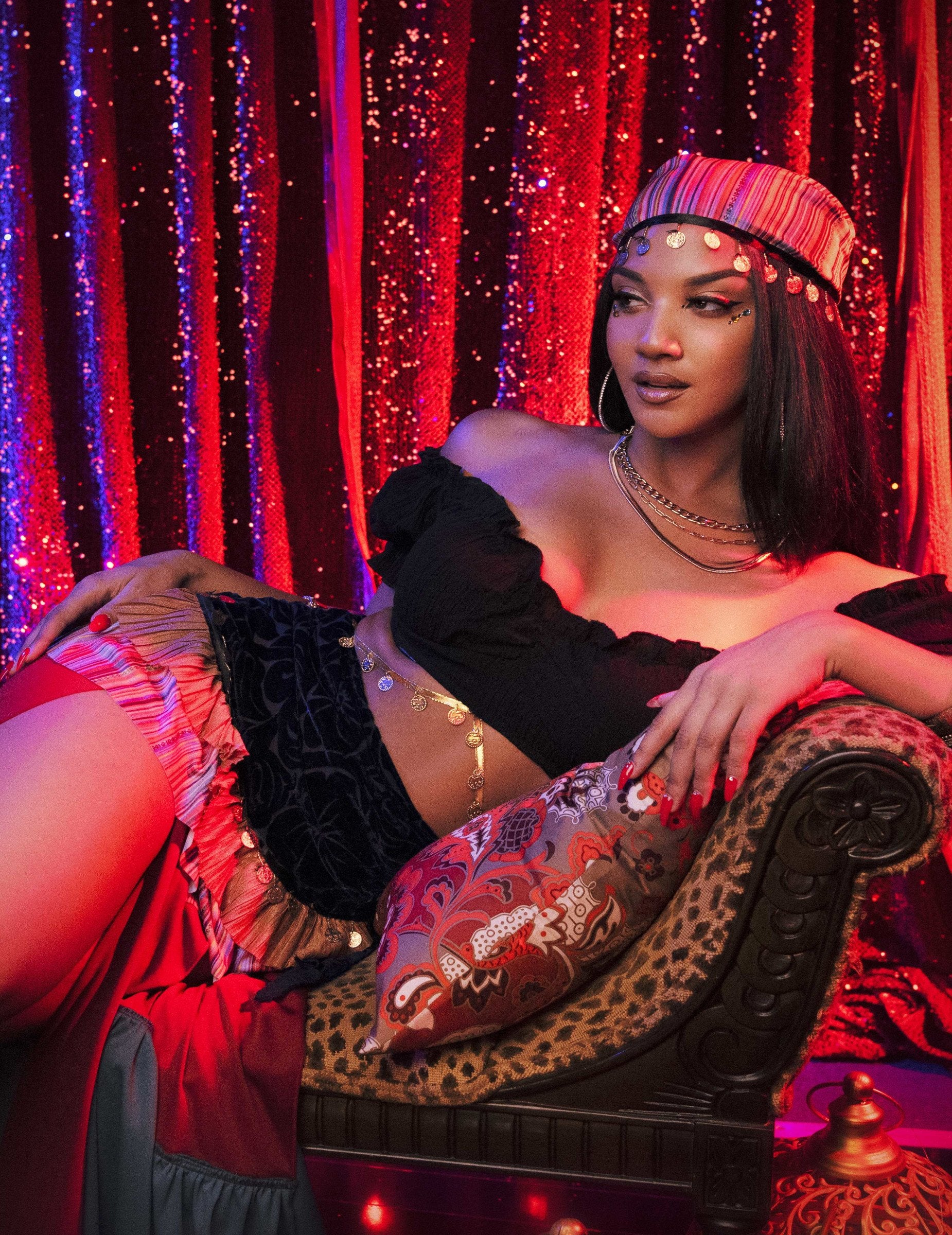 Accesorii incluse: Crop Top, Fustă despărțită cu eșarfă de catifea, coafură