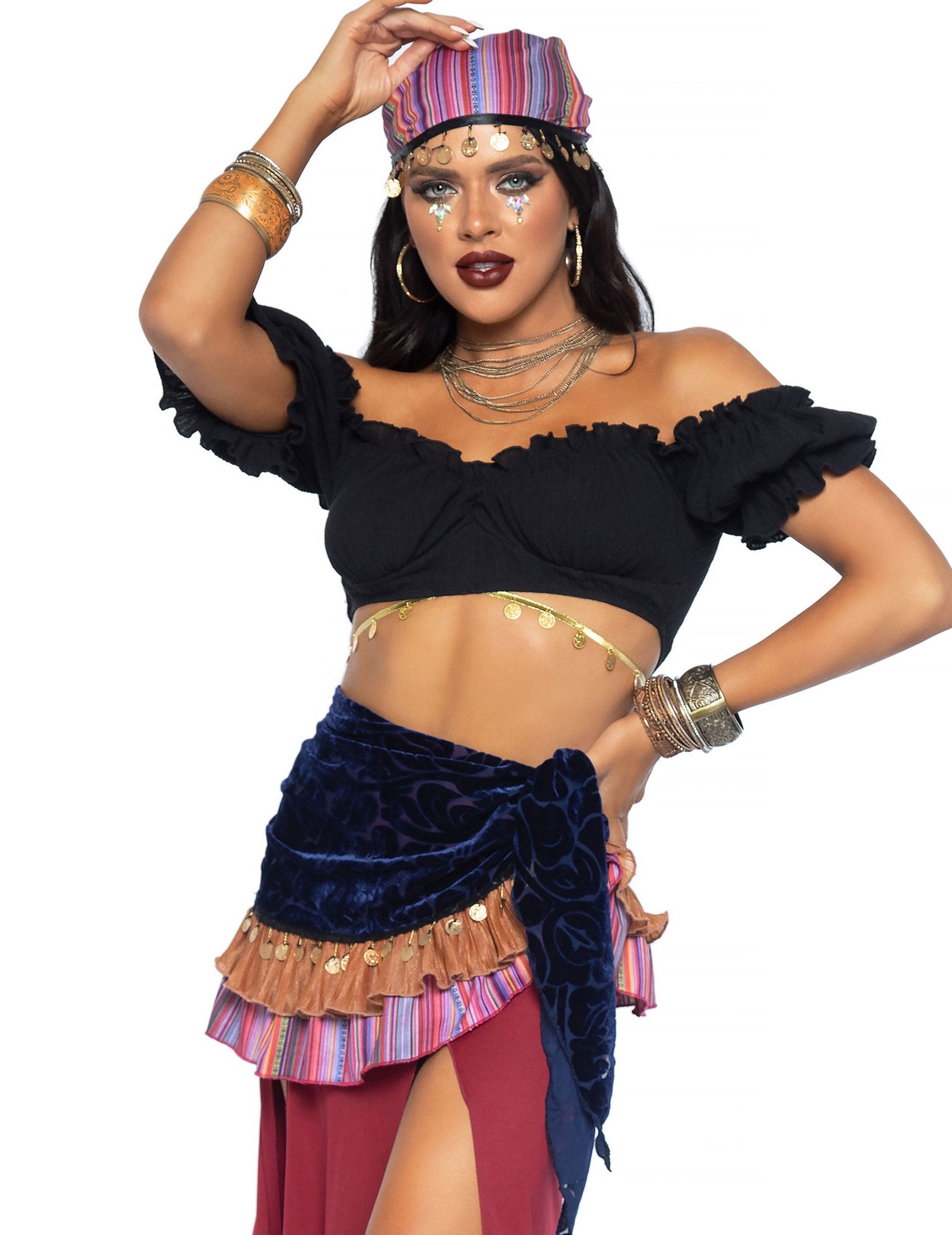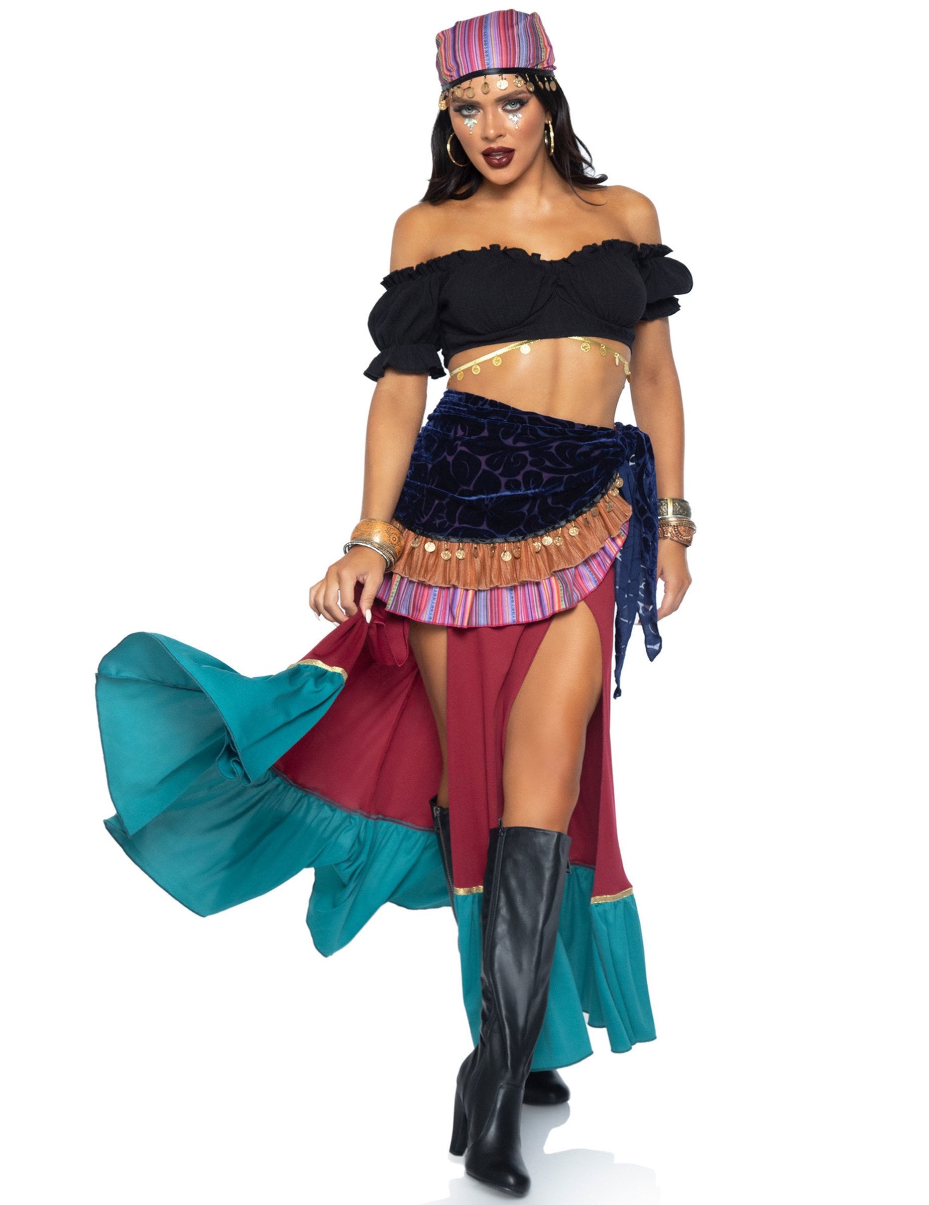 Acest costum boem de lux este destinat femeilor. El include un top de cultură, o fustă cu eșarfă și o șapcă. Partea de sus a deghizării este de culoare neagră, împodobită cu culori aurii. Fusta de culoare roșie și albastră este lungă și deschisă în mai multe părți, pentru a avea o parte din picioare în aer liber. Într -un aspect împărțit, are o eșarfă de catifea. În cele din urmă, va fi disponibilă o plafonă asortată întregului. De asemenea, conține camere de aur. Acest costum boem va fi perfect pentru ținuta ta în timpul unui eveniment deghizat în carnaval sau pentru noul an!