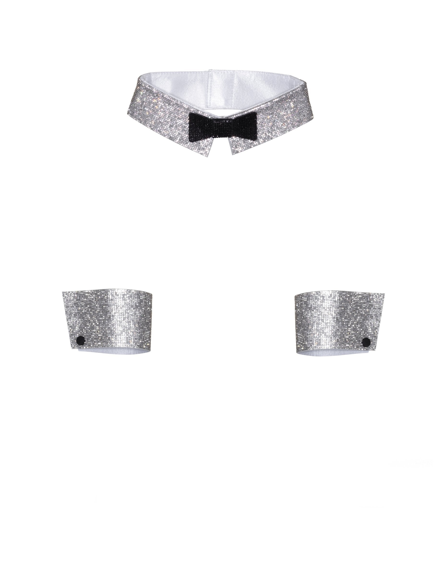 Acest kit de femeie include un guler și o pereche de manșete. Kit -ul are o culoare argintie cu strasuri. Gulerul este decorat cu un nod de fluture negru și manșete de butoane false. Manșetele se închid folosind zgârieturi. Aduceți o notă sexy deghizată cu acest guler și kit cu manșetă cu ocazia Zilei Îndrăgostiților sau în timpul serii de Revelion!