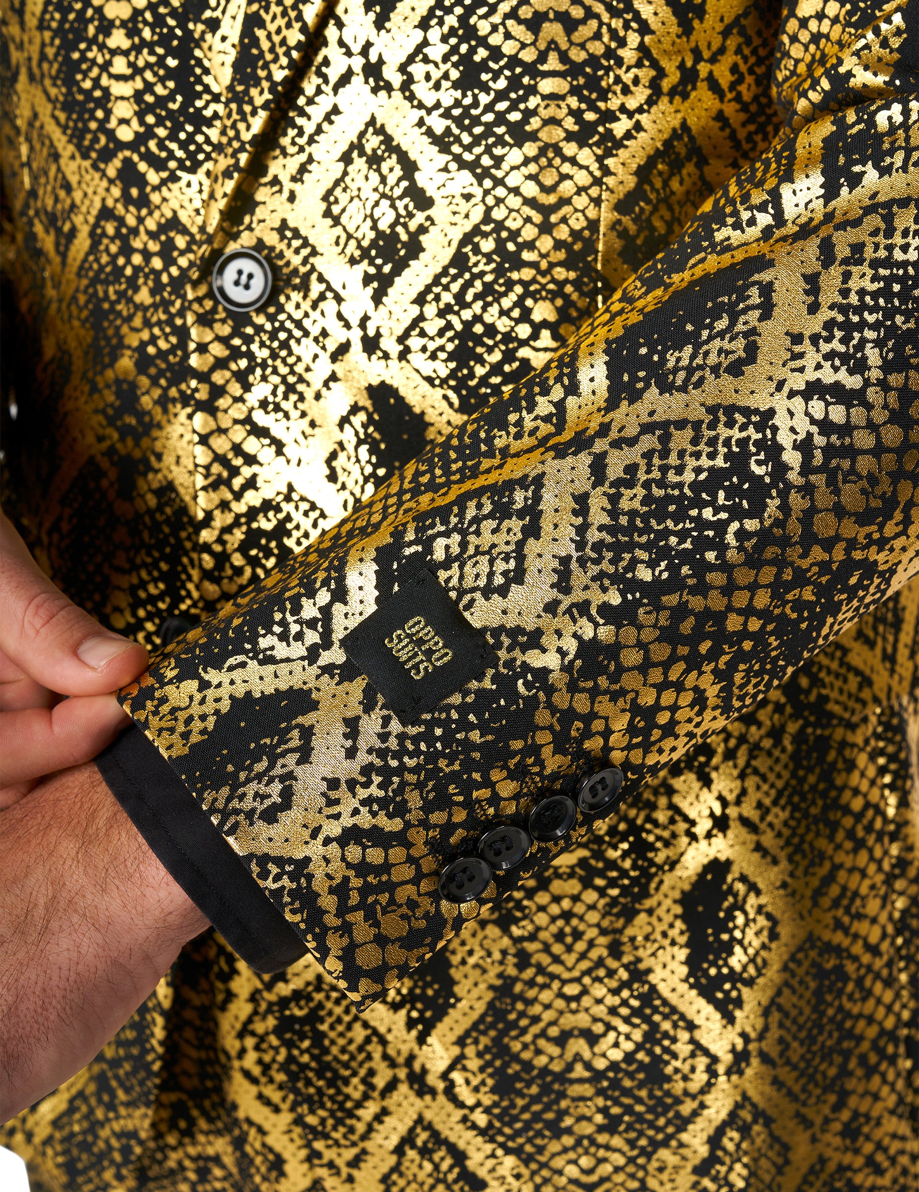 Întregul costum este confecționat din material de bună calitate, cu imprimeuri. cântare culoare asemănătoare șarpelui negru Şi aur strălucitor.