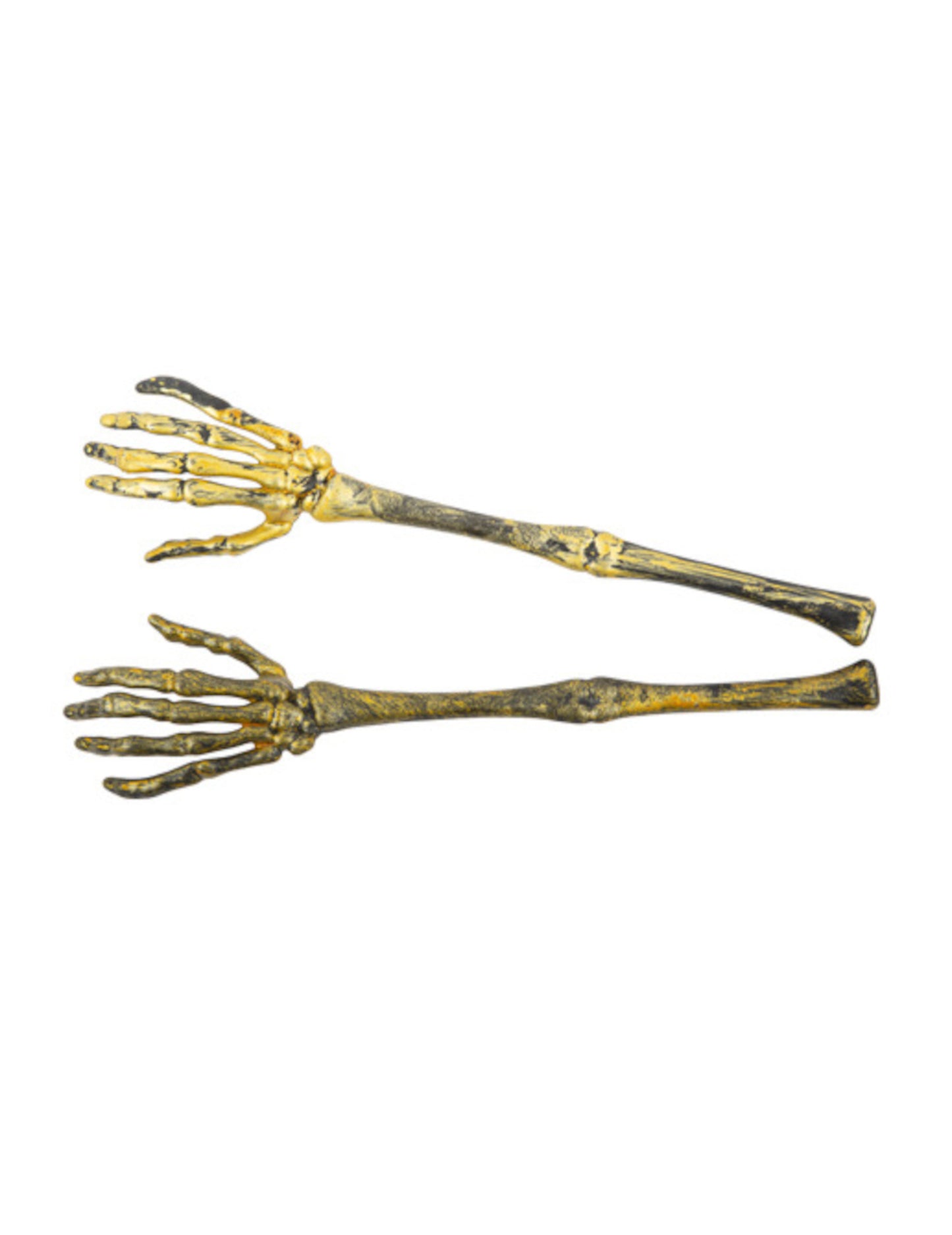 Aceste 2 brațe ale scheletelor au măsurarea de aproximativ 31 cm lungime. În plastic și o culoare aurie îmbătrânită, aceste două brațe corespund unui aspect scheletic. Această decorare va fi perfectă pentru completarea camerei sau în aer liber în timpul unui eveniment deghizat ca Halloween!
