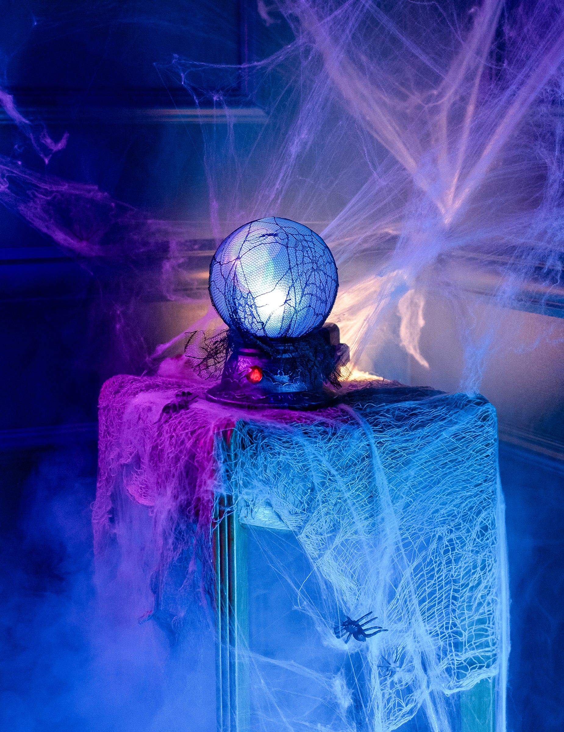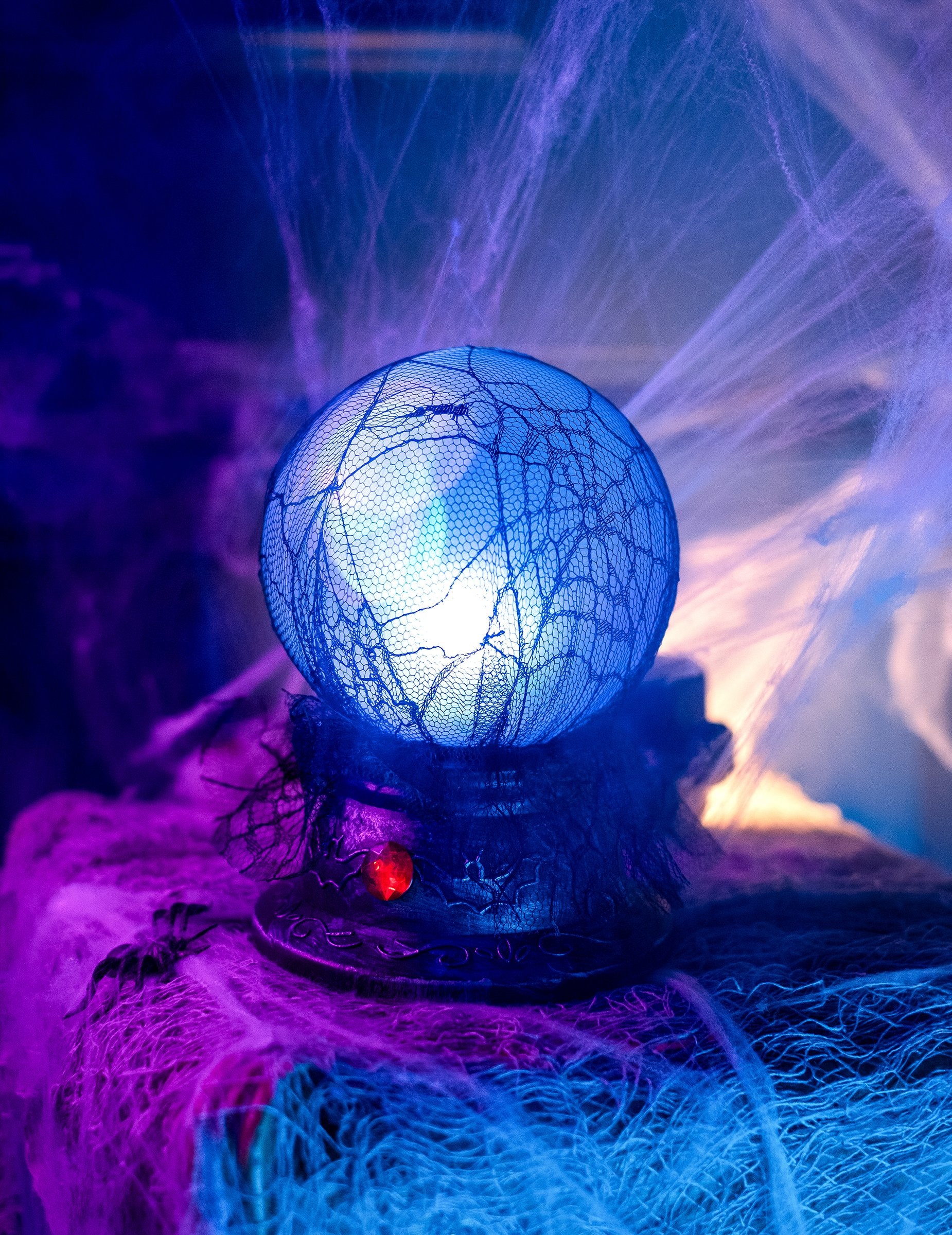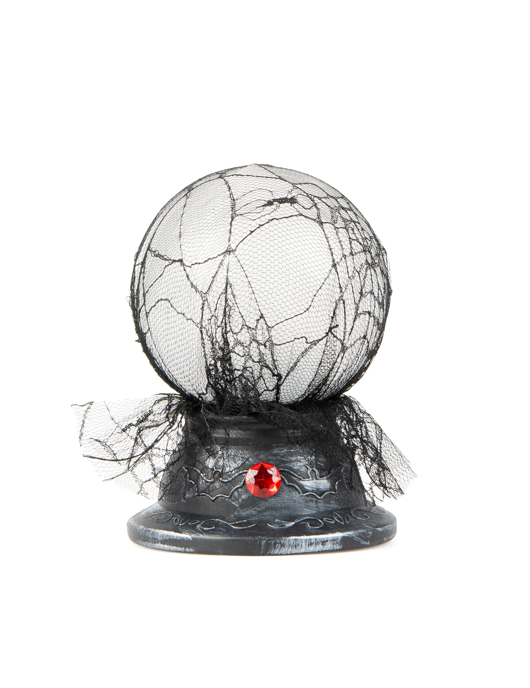 Această bilă luminoasă și sonoră măsoară aproximativ 19 x 13 cm. Acest decor animat are o bază de aspect din metal argintiu în vârstă decorată cu un diamant roșu fals. De asemenea, este împodobit cu un voal transparent negru. Ea se va aprinde cu o culoare albastră, apoi albă și va emite sunete înspăimântătoare care îți vor oferi gâscă de gâscă ...! Această bilă de cristal va fi ideală pentru perfecționarea unui decor interior în timpul serii tale de Halloween!