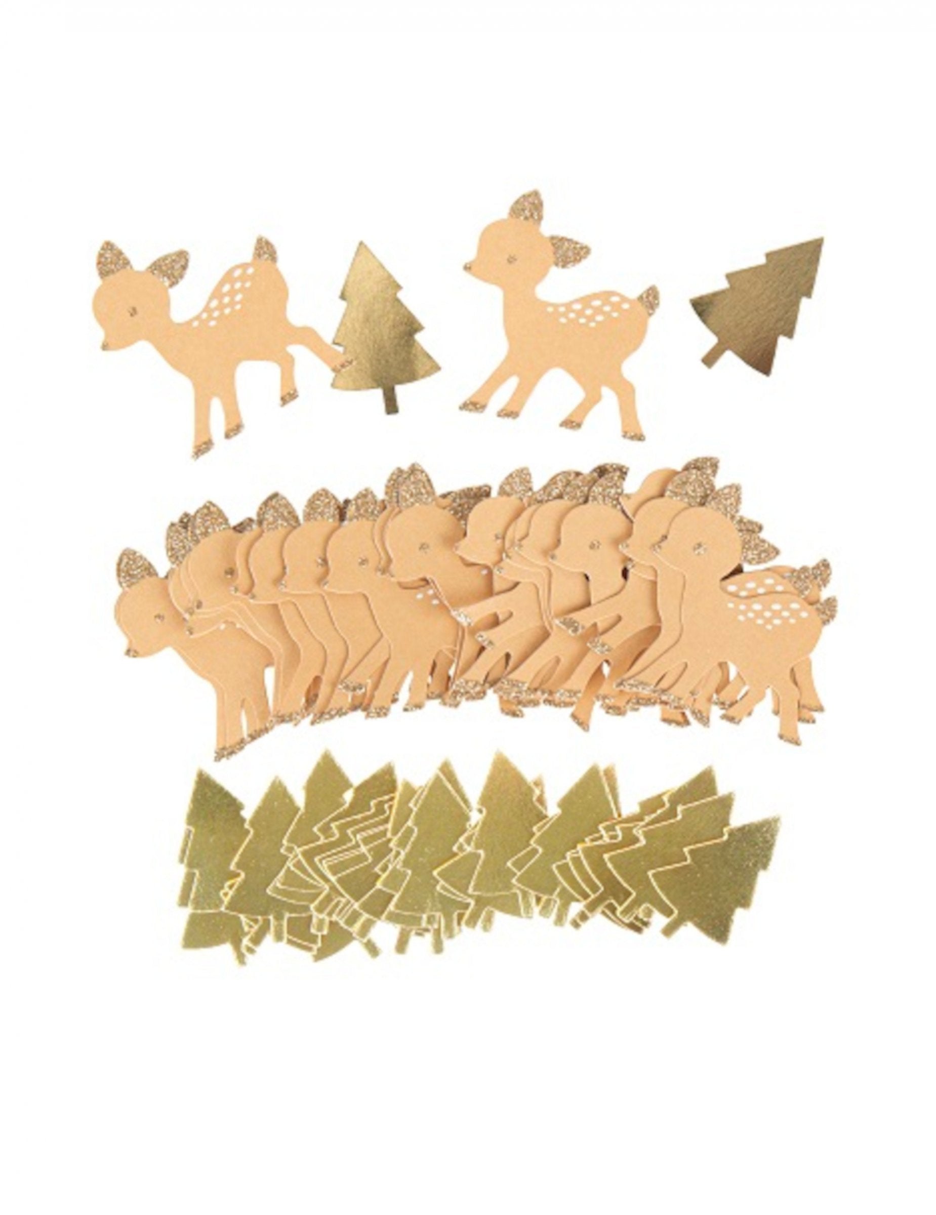 Adaugă o notă de dulceață evenimentului tău cu această pungă de 80 confeti masă în diferite dimensiuni de la 2,5 la 5 cm. Acest amestec delicat ilustrează drăgălășenia căprioare în tonuri de bej, însoțite de magnifice brazi cu reflexii aurii. Aceste elemente decorative sunt ideale pentru a înfrumuseța recepția sau sărbătoarea de Revelion. Crăciun cu eleganță.