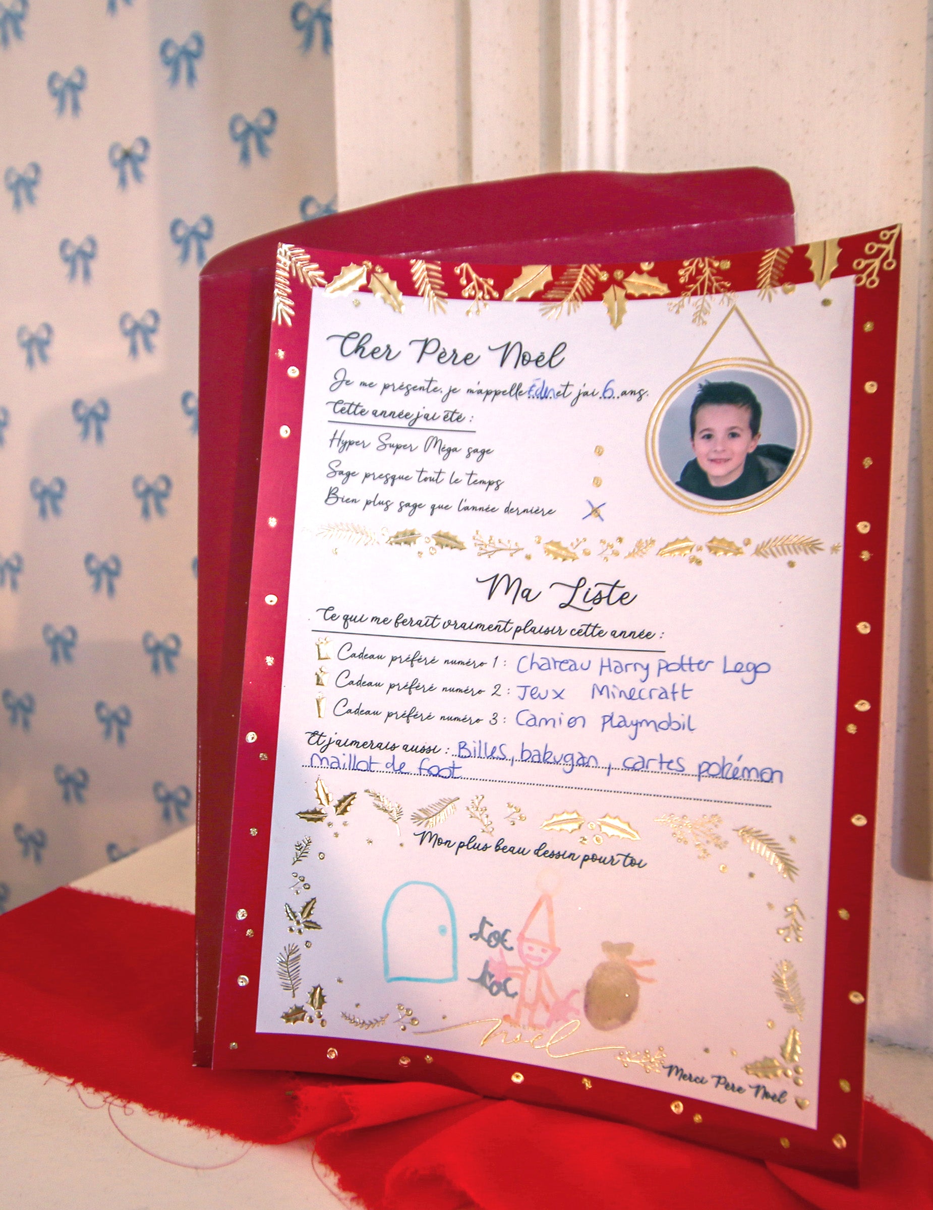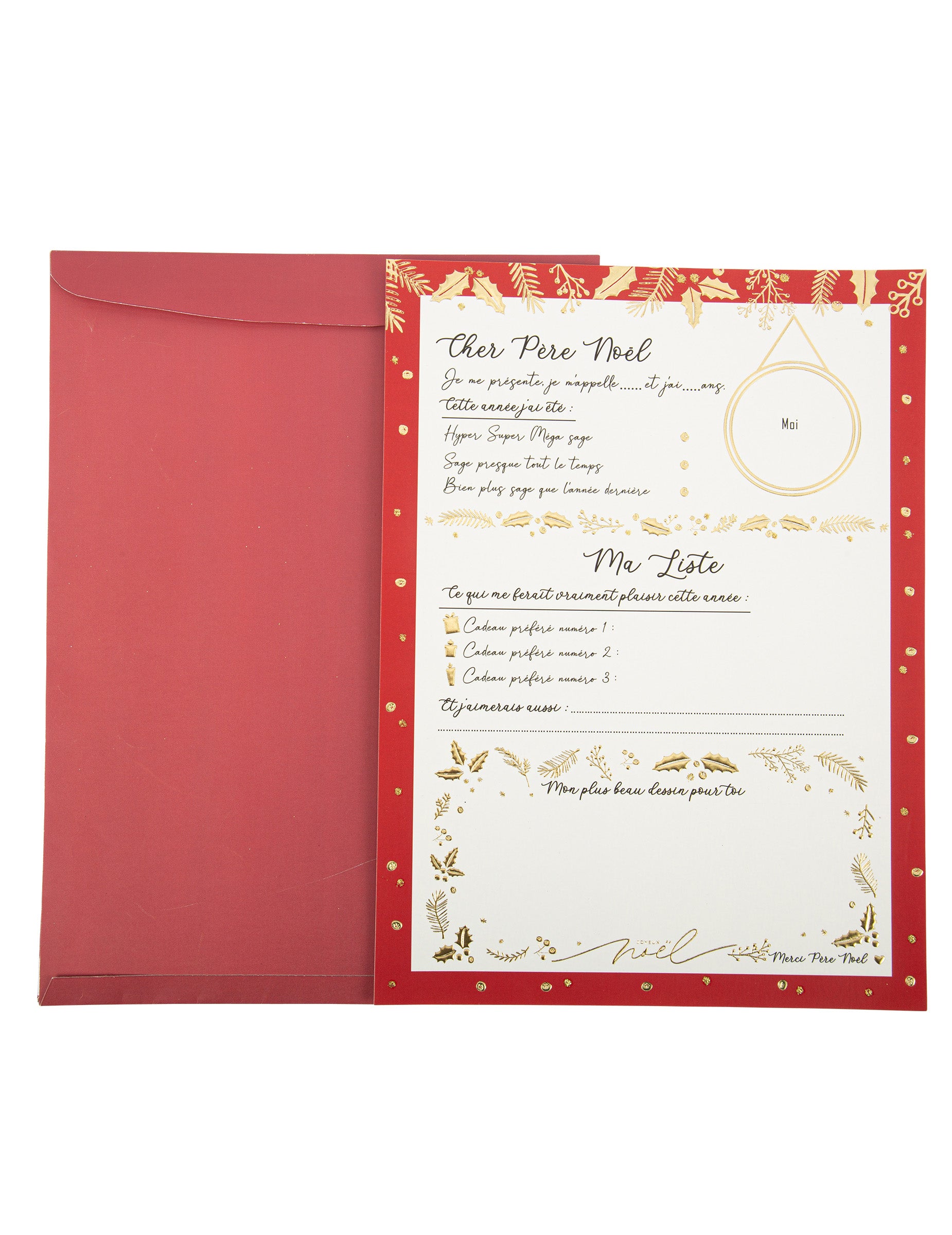 Acest kit festiv include o scrisoare lungă către Moș Crăciun însoțită de ea Plic de Crăciun cu Holly coordonat. Setul are dimensiuni generoase de 21 x 28,5 cm. Cu un design rafinat în nuanțe de vișiniu și alb, suportul este împodobit cu delicate foițe de aur pe margini. O formă internă este special concepută pentru a nota dorințe și liste de cadouri. Acest set este instrumentul perfect pentru... Copiii pot face o listă frumoasă de Crăciun cu entuziasm.