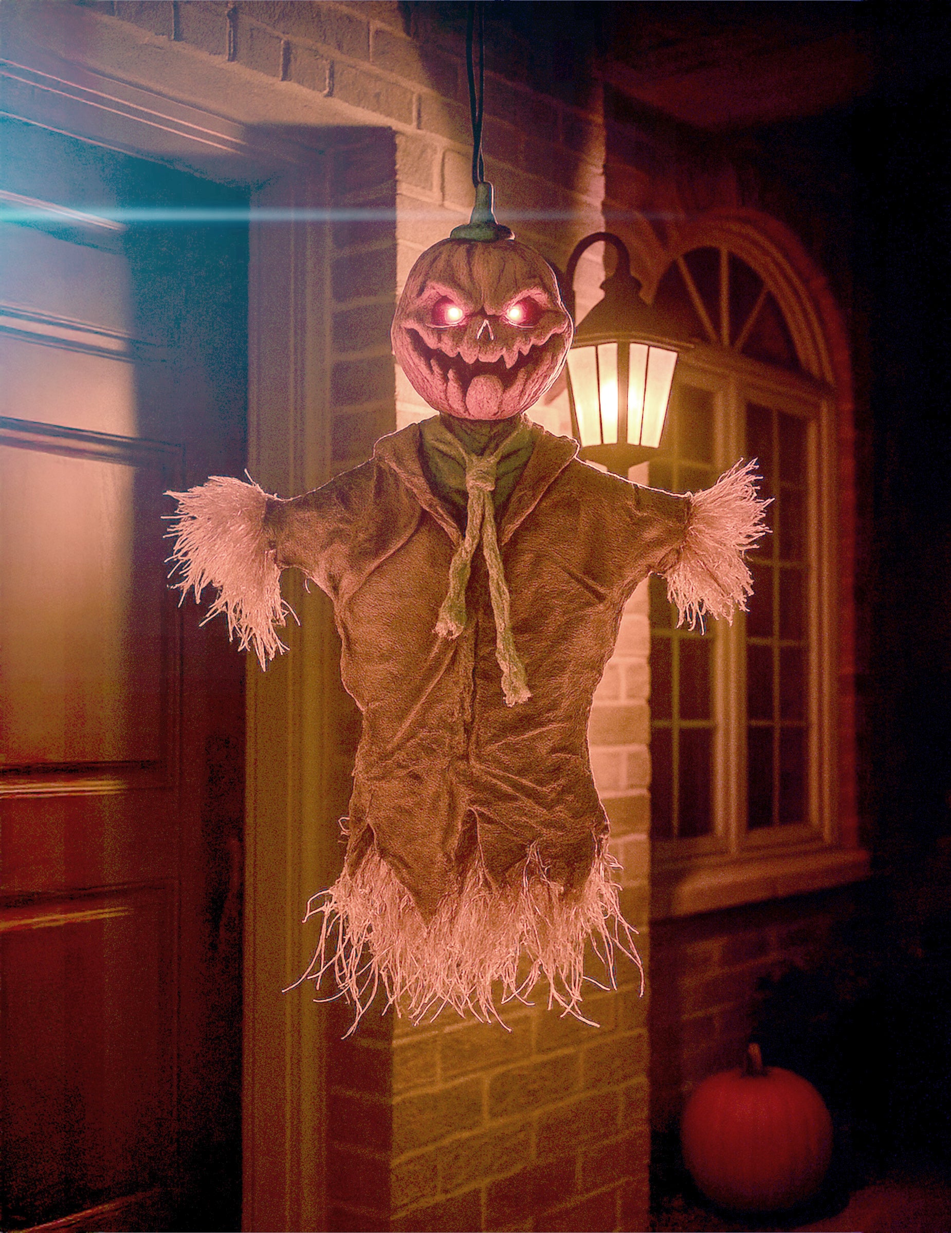 Înfățișează o sperietoare cu cap de dovleac și ochi roșii înspăimântători.