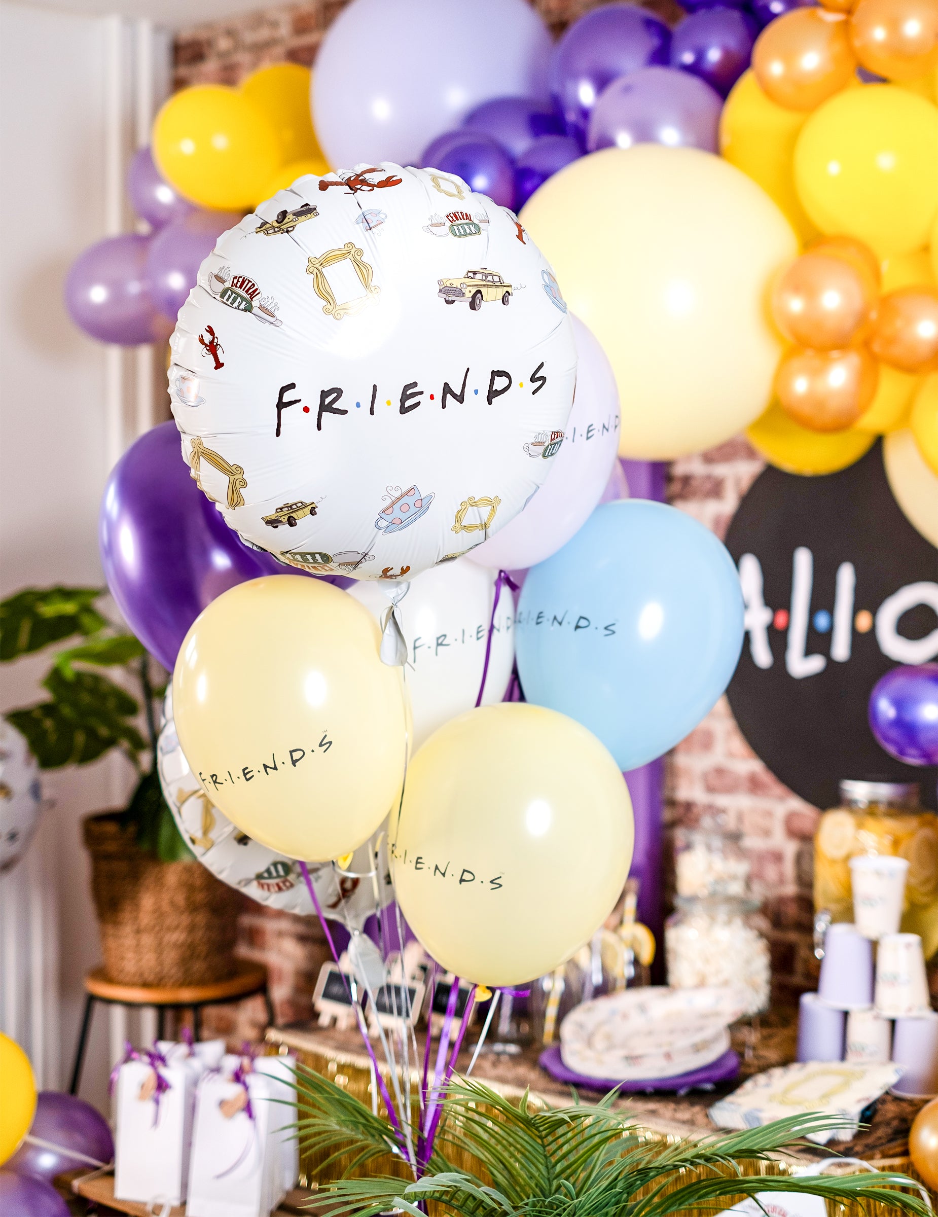 Această minge este sub licență oficială a prietenilor. Măsoară aproximativ 45 cm în diametru. Este alb și decorat cu simbolurile universului prietenilor. Această minge este perfectă pentru a vă decora camera în timpul unei seri pe tema prietenilor!