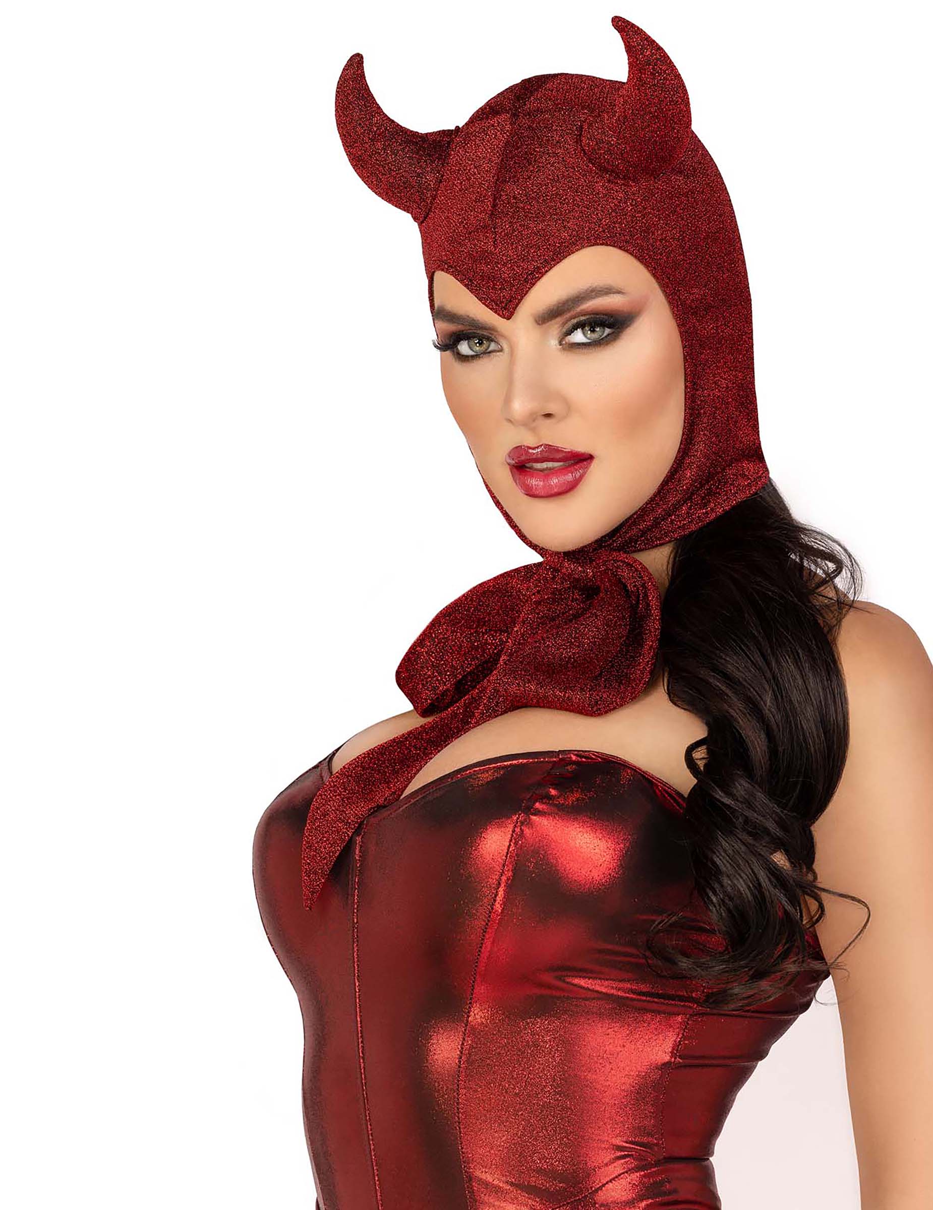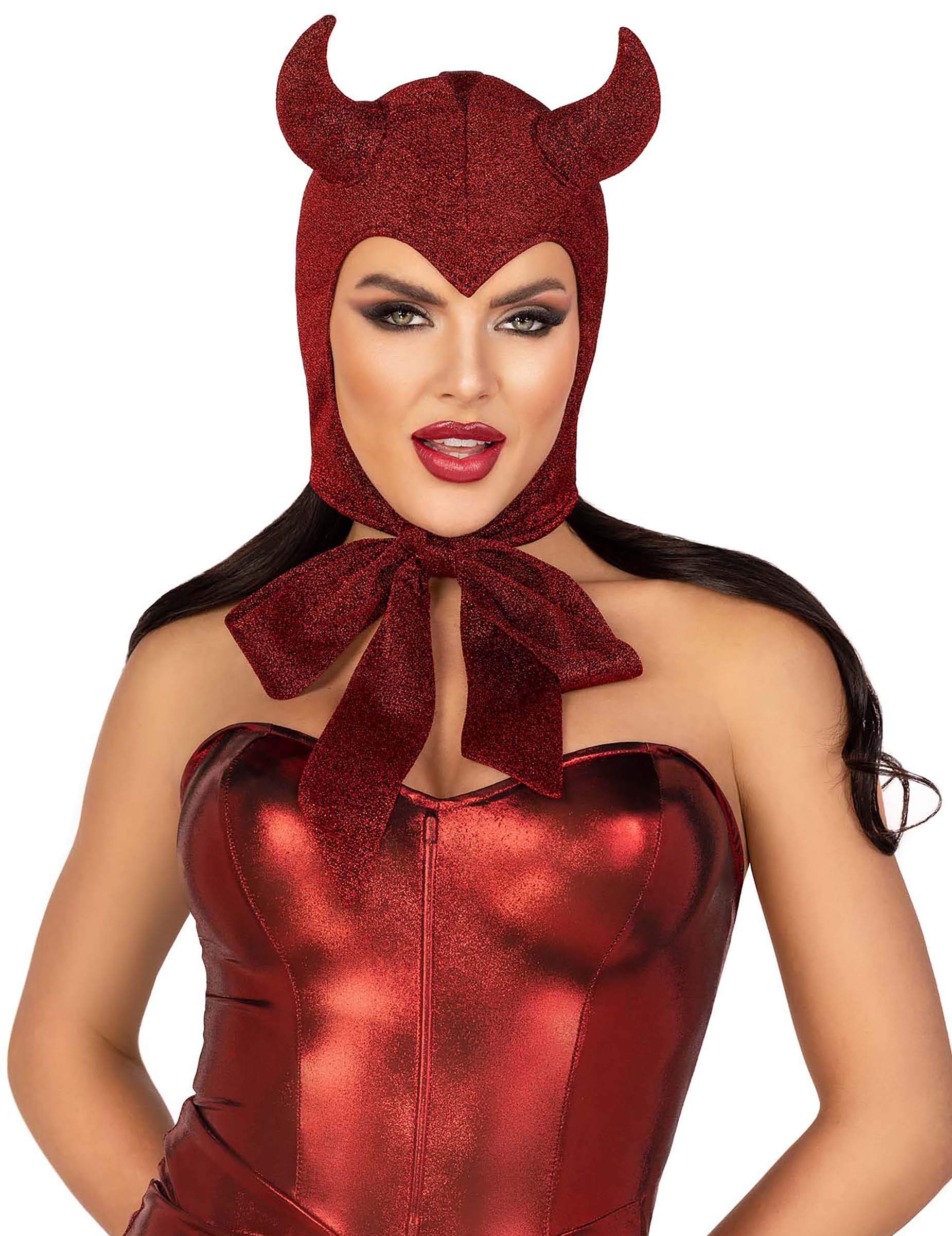 Este roșu închis și prevăzută cu două coarne. Țesătura cagulei are un efect sclipitor. O puteți strânge făcând noduri.