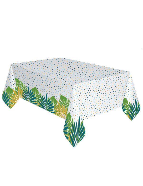 Această masă măsoară aproximativ 120 cm x 180 cm. În hârtie, este decorat cu frunze albastre, aurii și verzi și frunze tropicale de aceeași culoare. Călătorește pentru ziua ta de naștere cu această masă tropicală!