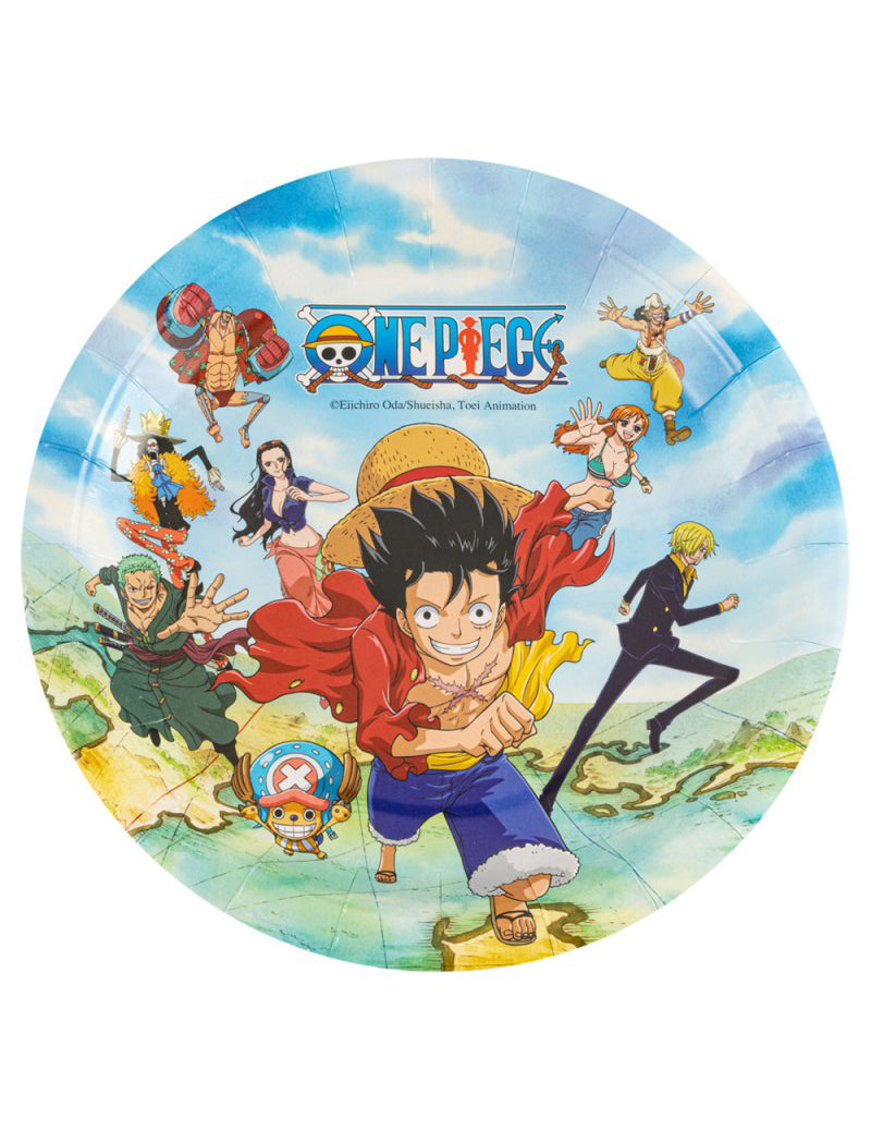 Aceste plăci de carton sunt sub licență oficială One Piece. Sunt vândute cu 8 și măsoară aproximativ 23 cm în diametru. Sunt decorați cu membrii echipei Monkey D. Luffy formate din Zoro, Francky, Sanji, Chopper, Usopp, Nami, Brook și Robin. Decorul este un cer albastru tulbure și un sol cu ​​efect ondulat. Acest lot va fi perfect pentru a crea o masă frumoasă de la o zi de naștere pe tema manga!