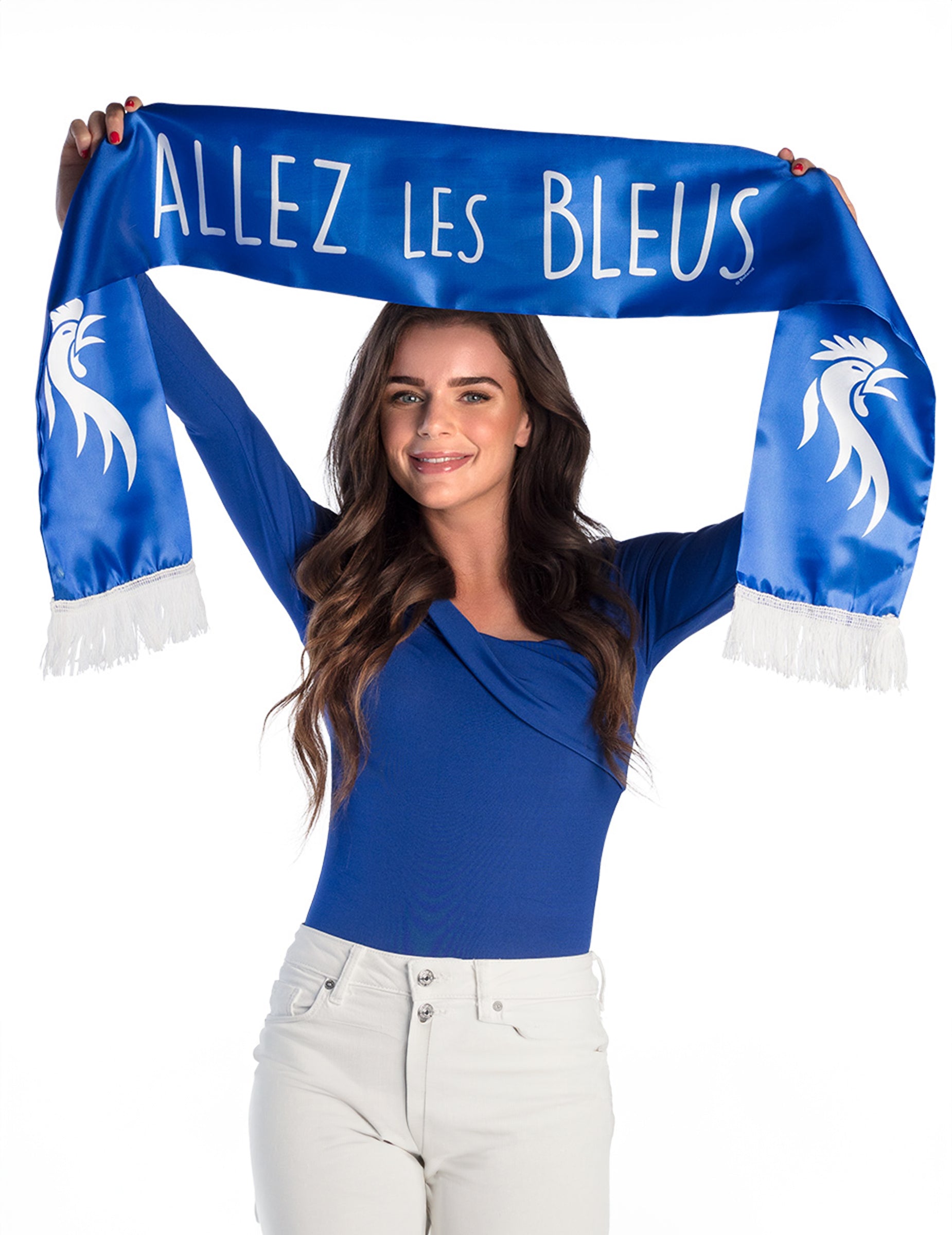 Această eșarfă de susținere este destinată adulților. Are culoare albastră cu franjuri albe. Ea poartă inscripția „Haide on the Blues” și este decorată cu celebrul cocoș francez. Această eșarfă va fi perfectă pentru a încuraja echipa franceză în timpul Cupei Mondiale de Fotbal sau a altor competiții sportive!