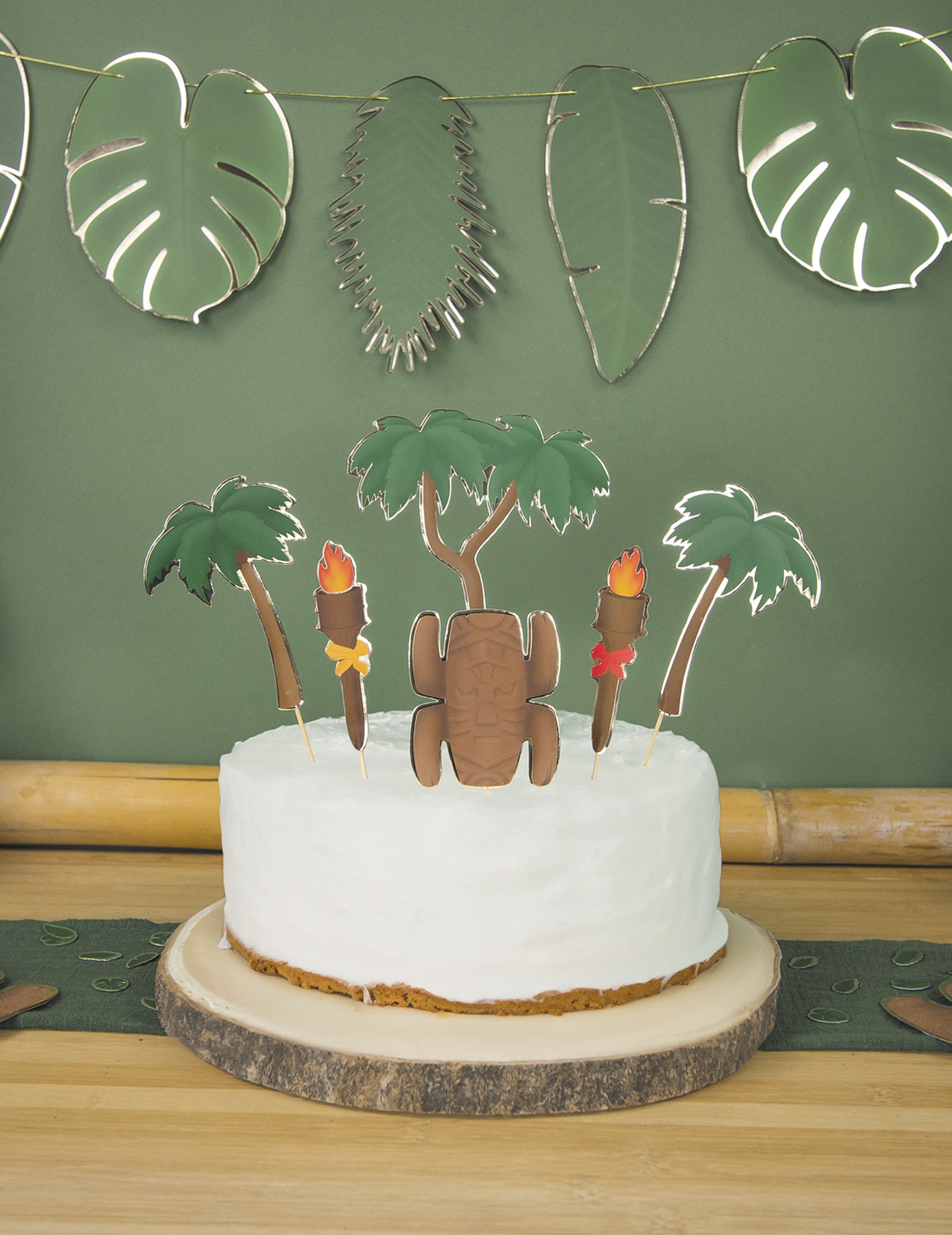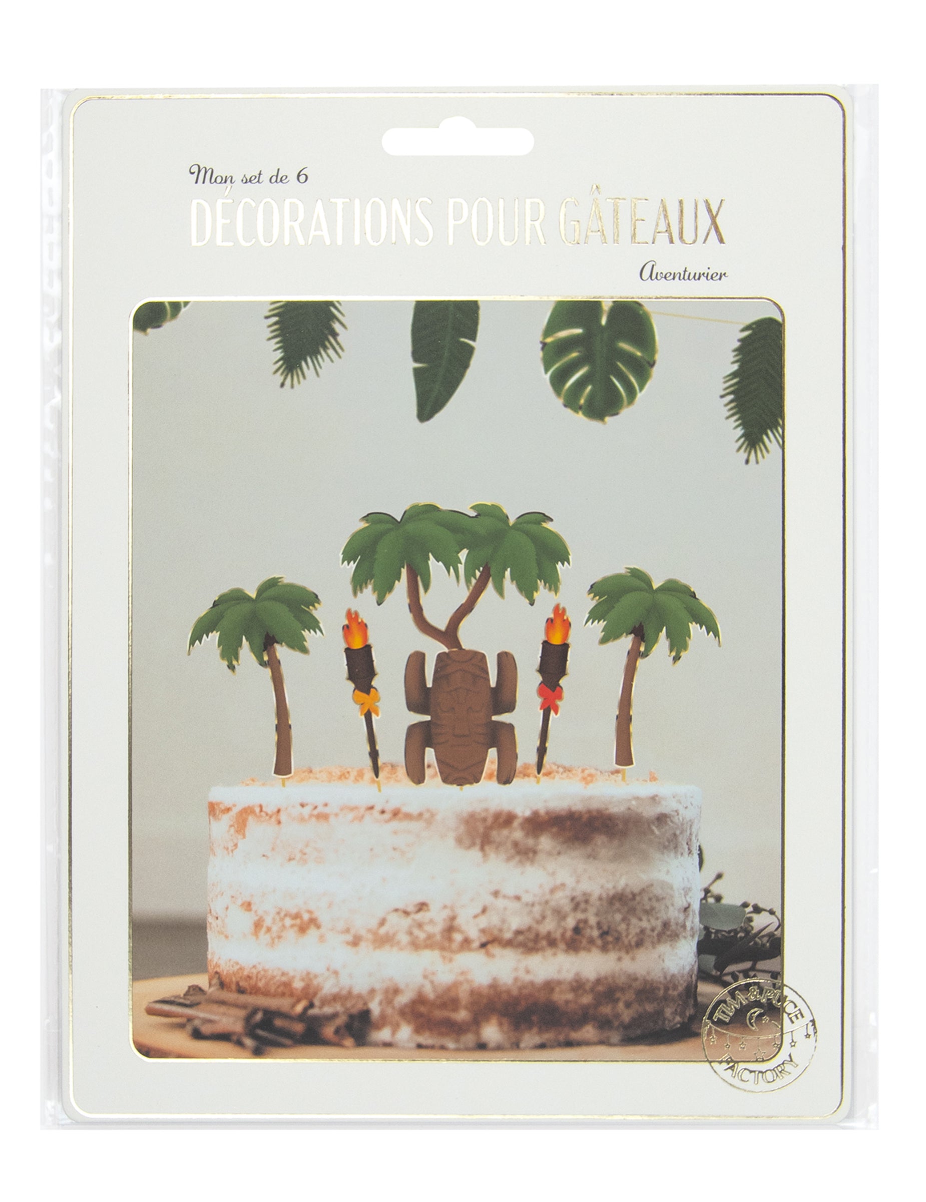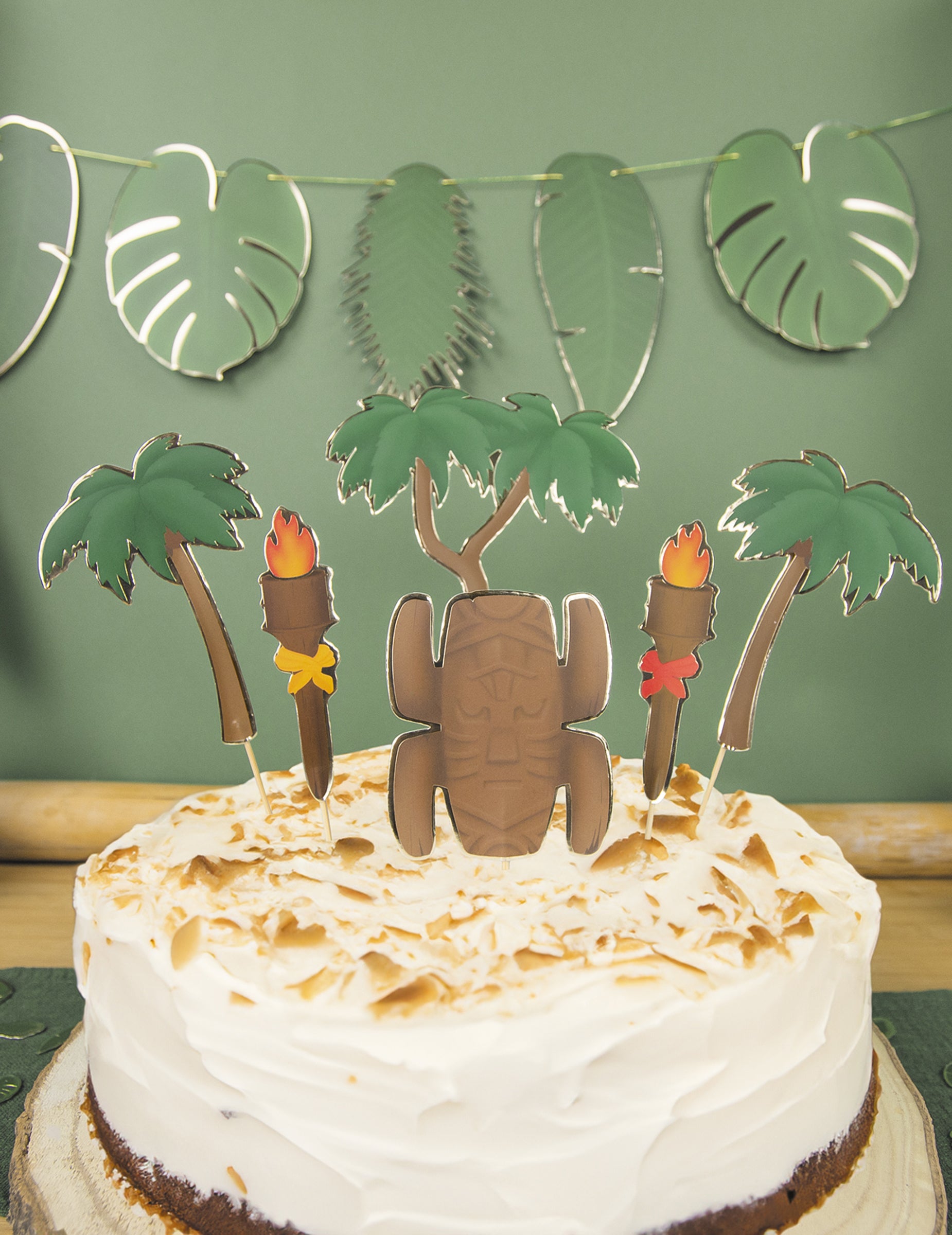Acest lot include 6 decorațiuni pentru tort: ​​- 1 reprezentând un totem - 2 reprezentând torțe - 3 palmieri Acești decorațiuni sunt în carton, iar vârfurile sunt confecționate din lemn. Acest set va fi perfect pentru decorarea tortului tău cu ocazia zilei tale de naștere!