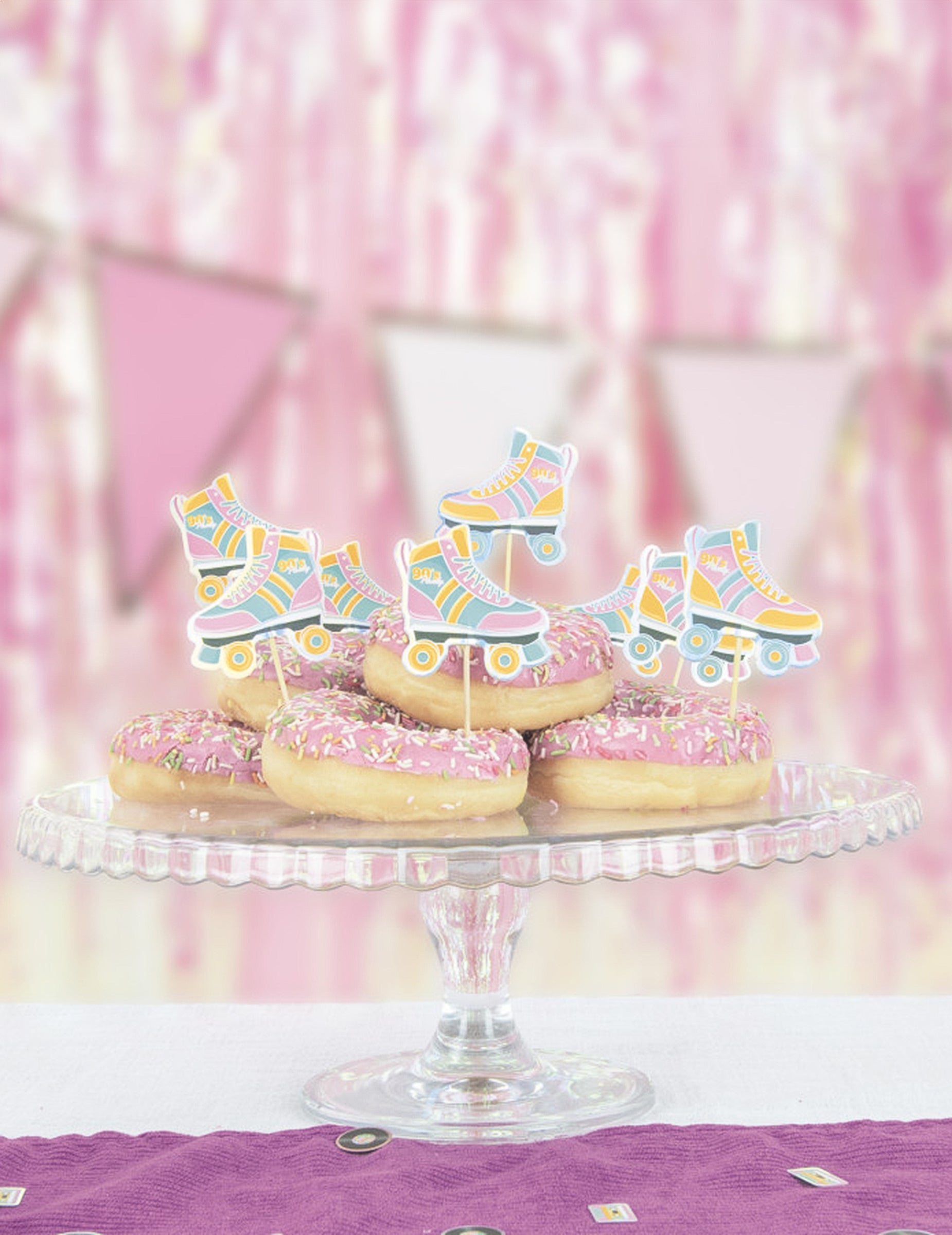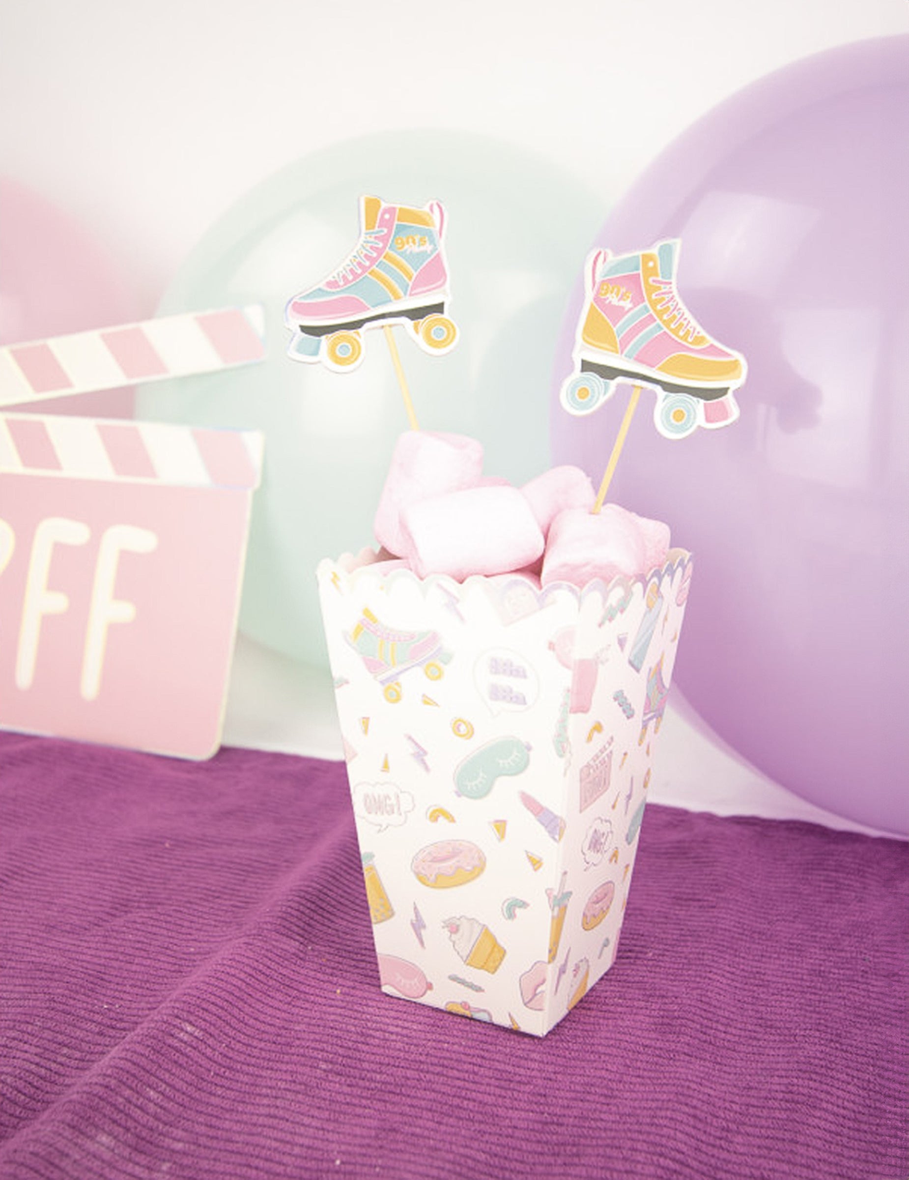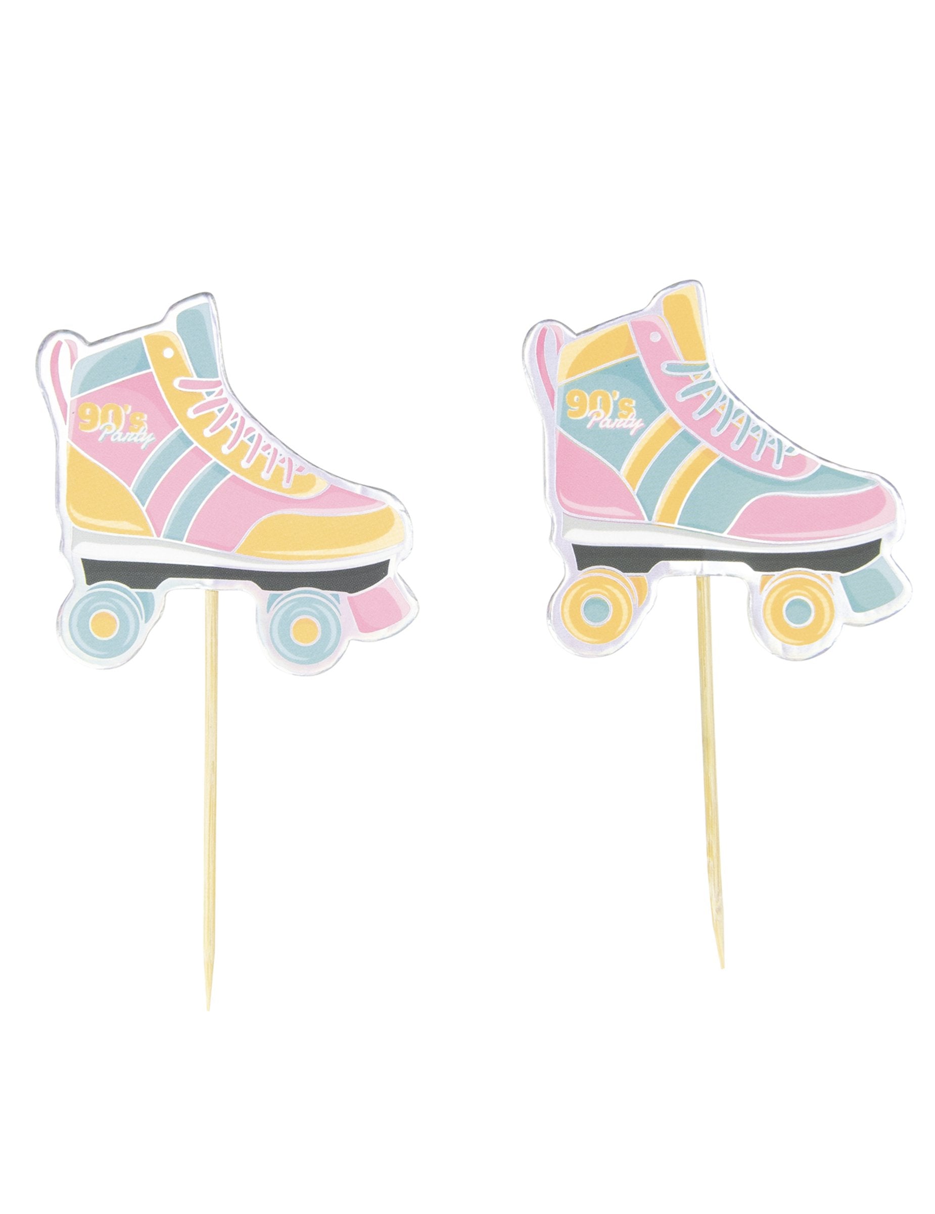 Acest lot este format din 10 vârfuri de lemn care măsoară aproximativ 9 cm. Pe tema anilor 90, acestea sunt decorate cu un rollerblading în culori pastelate. Acest lot de vârfuri va fi perfect pentru decorarea tabelului de naștere în anii 90!