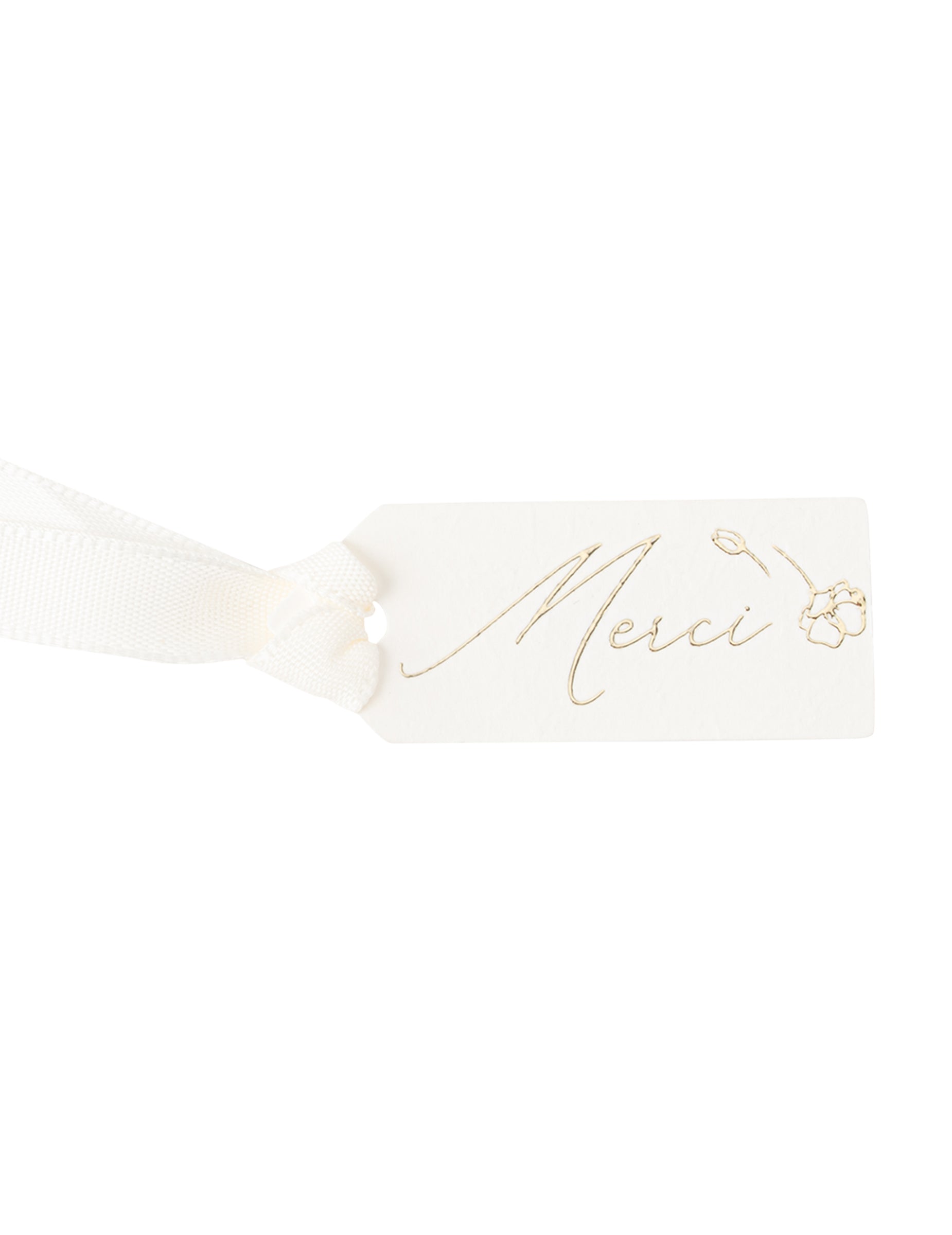 Acest set conține 10 etichete de carton cu dimensiunile de 5 x 2. cm. Aceste suporturi dreptunghiulare albe poartă inscripția MULŢUMESC cu litere aurii, împodobită cu două frumoase flori Asortată. Cravata este ușor de realizat datorită unei elegante panglici de satin crem incluse. Este o alegere rafinată pentru a-ți arăta aprecierea în timpul unei petreceri. căsătorie, A botez sau o sărbătoare de ziua de naștere.