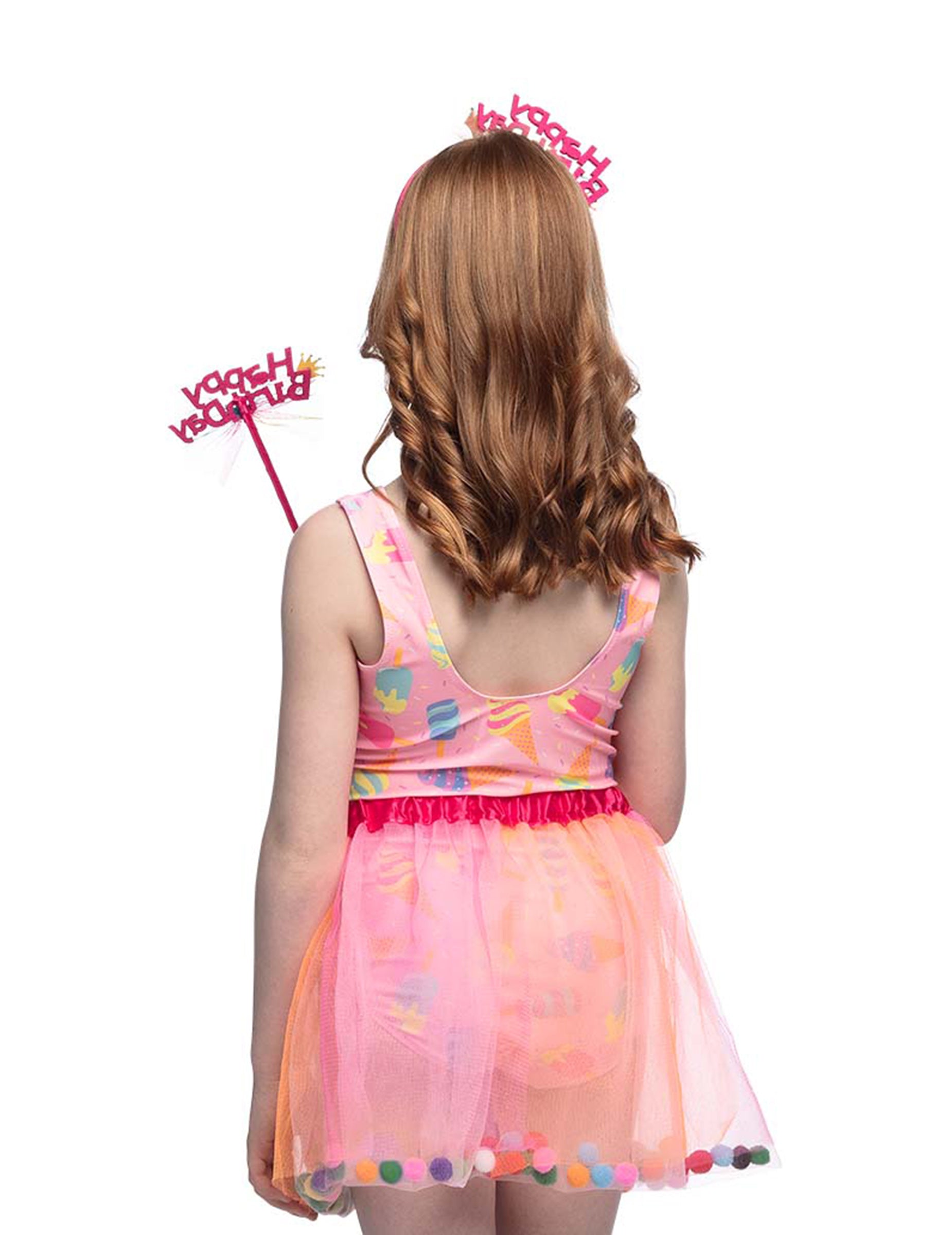 Acest set de zână la mulți ani include o tiara, un tutu și o baghetă. Tiara și bagueta au culori strălucitoare și poartă inscripția „La mulți ani”. Tiara este o bandă de cap, iar bagueta este decorată cu tul. Tutu este format din tul transparent roz și este decorat cu un nod magnific pastel roz la dimensiune. Acest set de basm la mulți ani va fi perfect pentru a sărbători ziua de naștere a fiicei tale!