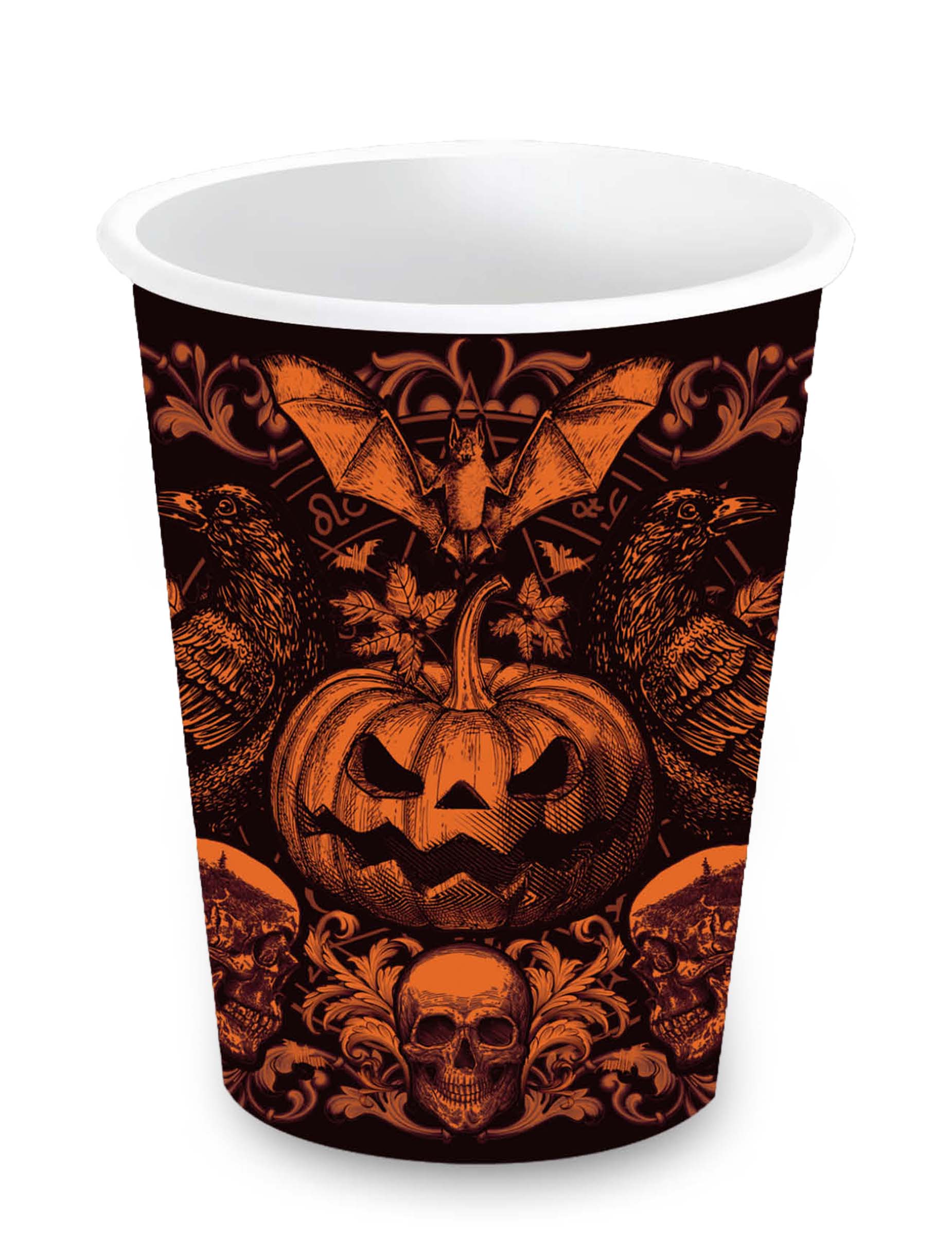Acest pachet conține 6 căni de carton de 240 ml, decorate cu modele gotice de dovleac. Practică și ecologică, sunt ideale pentru a -ți servi băuturile în timp ce sunt ecologice. Dovlecii portocalii ies în evidență pe un fundal negru, adăugând o notă izbitoare decorului tău. Perfect pentru a stabili o atmosferă misterioasă, aceste goblete vă vor completa perfect decorarea de masă pentru Halloween.