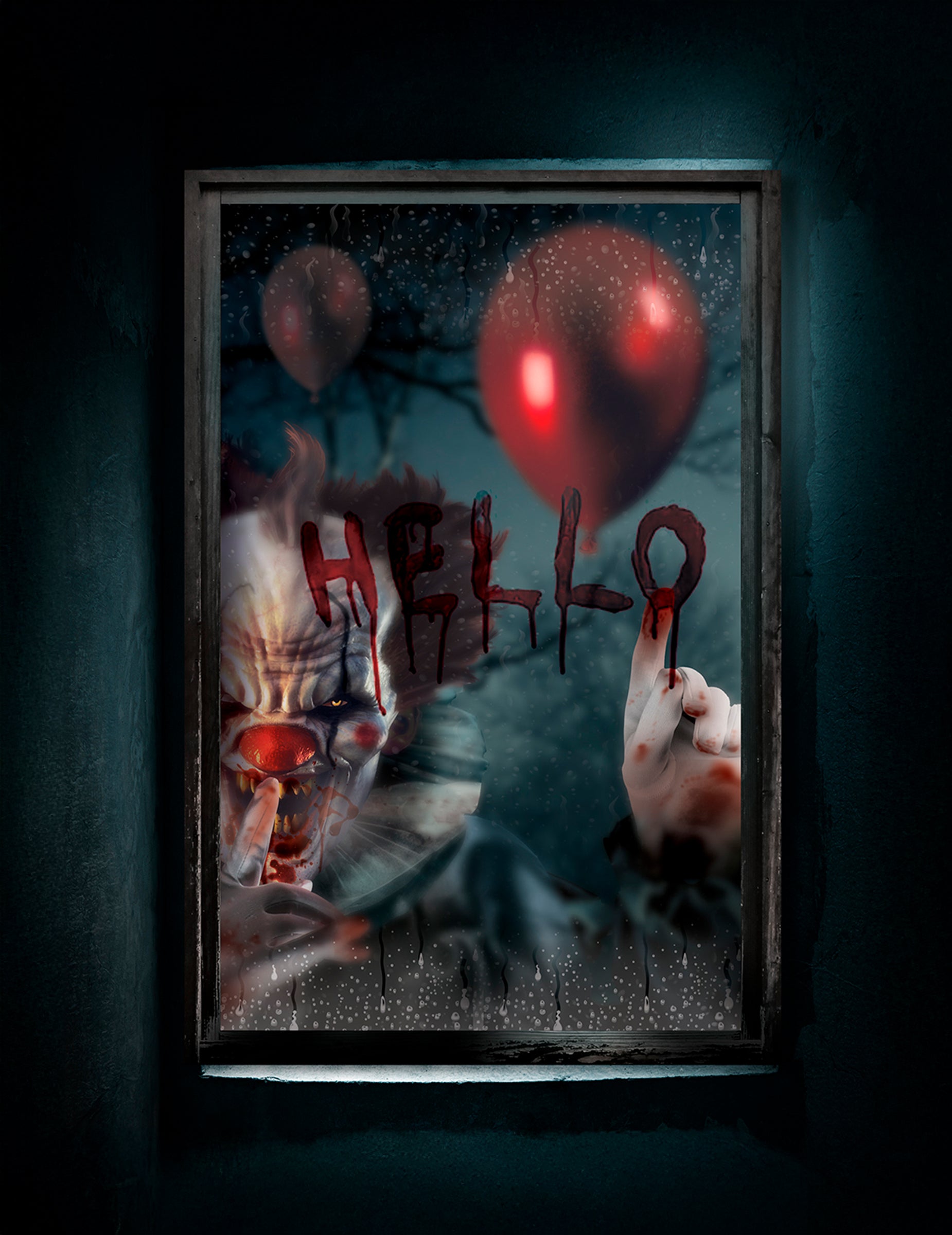 Această decorare a ferestrei măsoară aproximativ 80 x 120 cm și reprezintă un clovn asasin. În această imagine terifiantă, un clovn amenințător scrie cu sânge „Hello” pe fereastra. Va fi un decor înfricoșător perfect pentru o petrecere tematică de groază sau pentru Halloween!