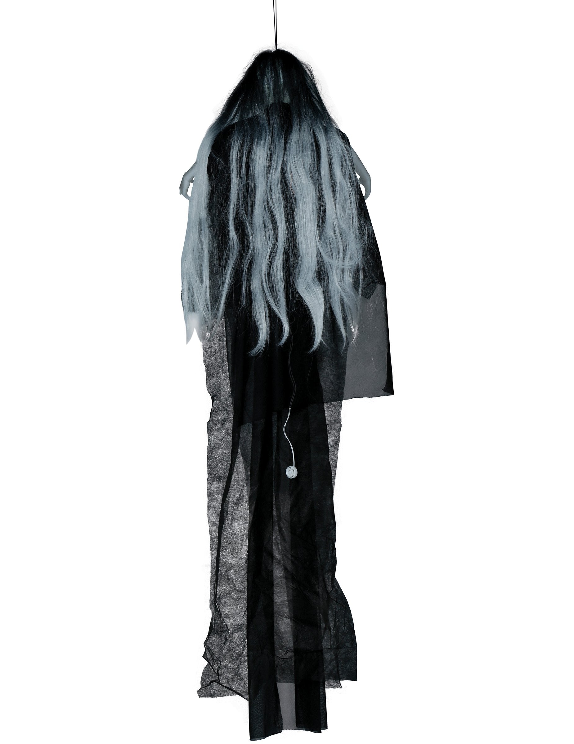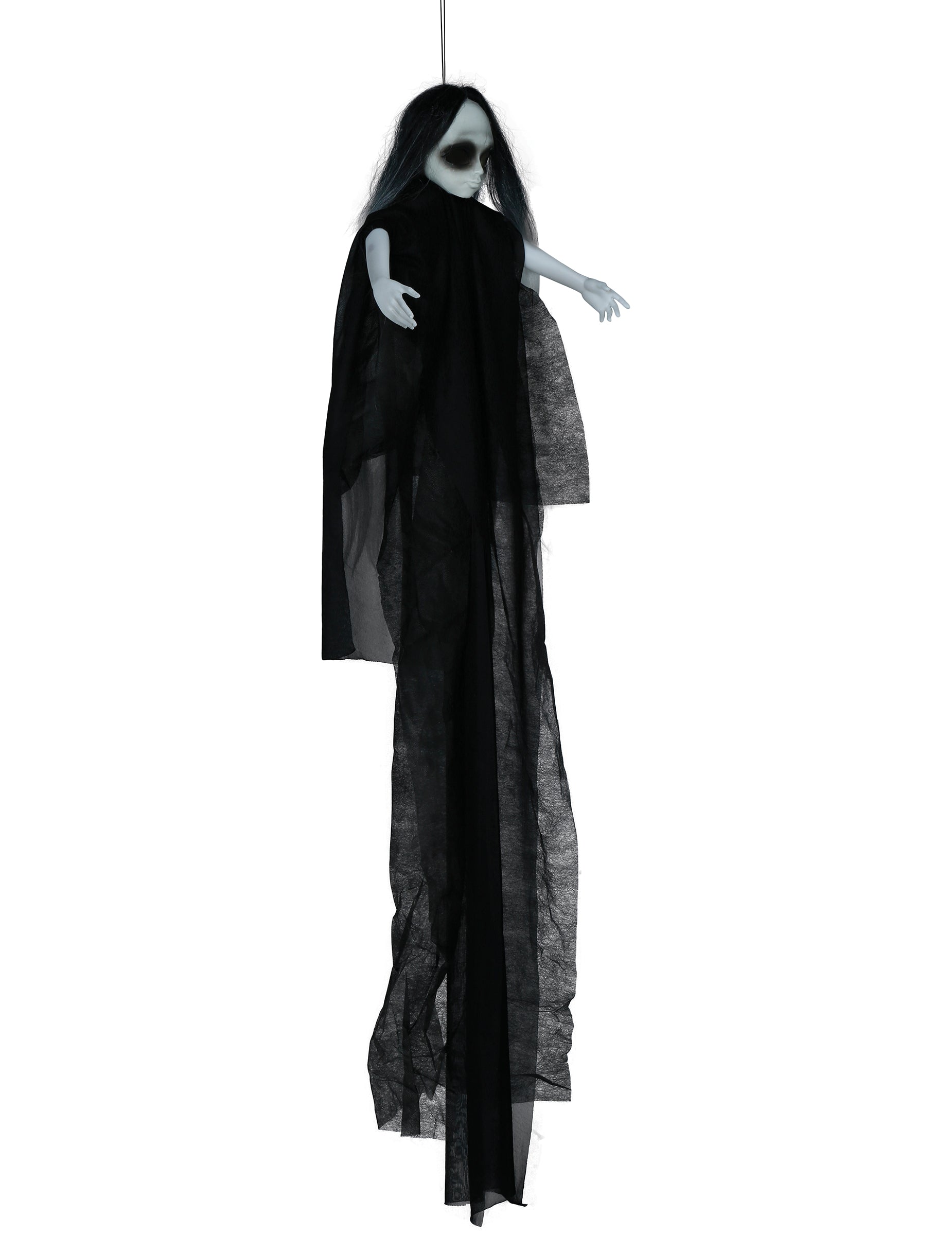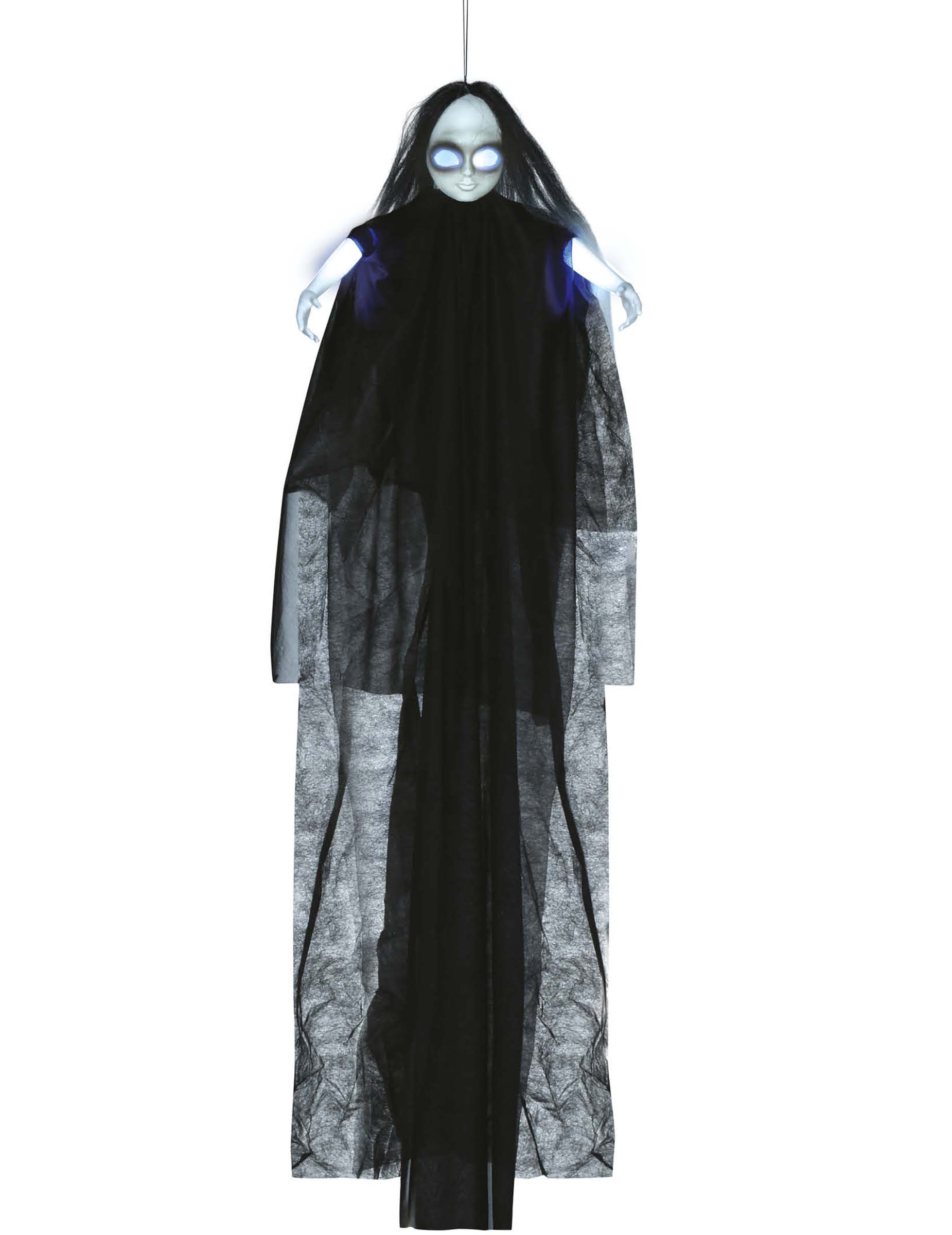 Această păpușă înspăimântătoare măsoară aproximativ 130 cm și este echipată cu caracteristici de lumină și sunet, cu 3 baterii furnizate pentru utilizare imediată. Proiectată cu detalii realiste și sinistre, păpușa are ochi care strălucesc în albastru în întuneric. Efectele sonore adaugă o notă de teroare suplimentară la acest decor. Perfect pentru sărbătorile de Halloween, serile tematice de groază sau atracții de casă bântuită, această păpușă înspăimântătoare este ideală pentru crearea unei atmosfere tulburătoare. Agățați -l într -o intrare, pe o terasă sau într -o cameră întunecată pentru a vă surprinde și speria oaspeții.