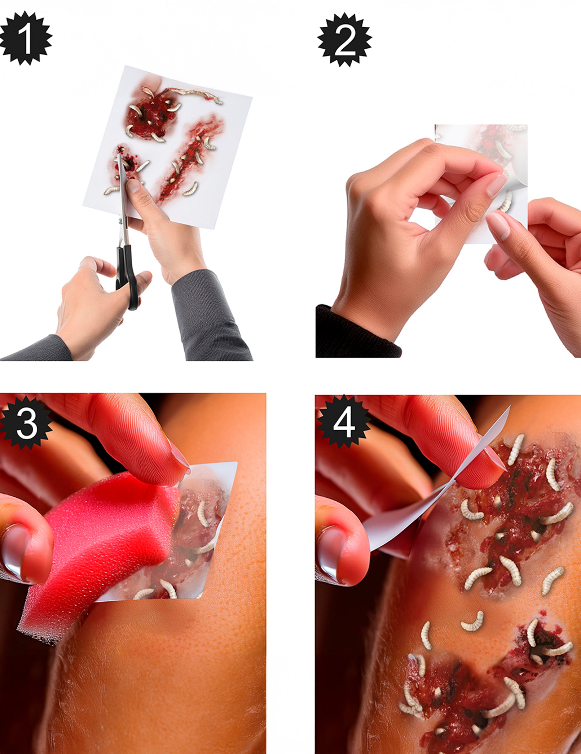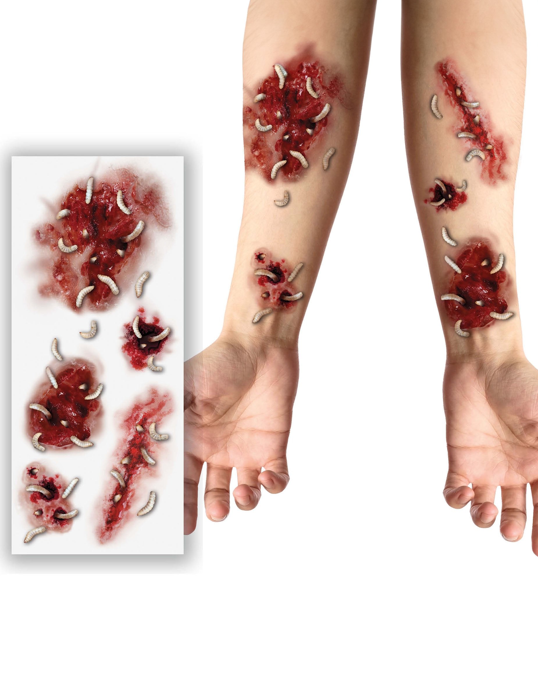 Această placă de tatuaje reprezentând răni cu versete 30 x 13 cm. Oferă motive pentru vătămarea viermilor infestați, ideală pentru o redare înfricoșătoare și realistă. Tatuajele prezintă tăieturi și răni adânci, înfrumusețate cu versete ramping și detalii sinistre. Fiecare design este dezvoltat meticulos pentru un efect vizual izbitor. Ușor de instalat și îndepărtat, permit o transformare rapidă. Aceste tatuaje cu rani cu Vers vor aduce o notă terifiantă costumului tău de Halloween!
