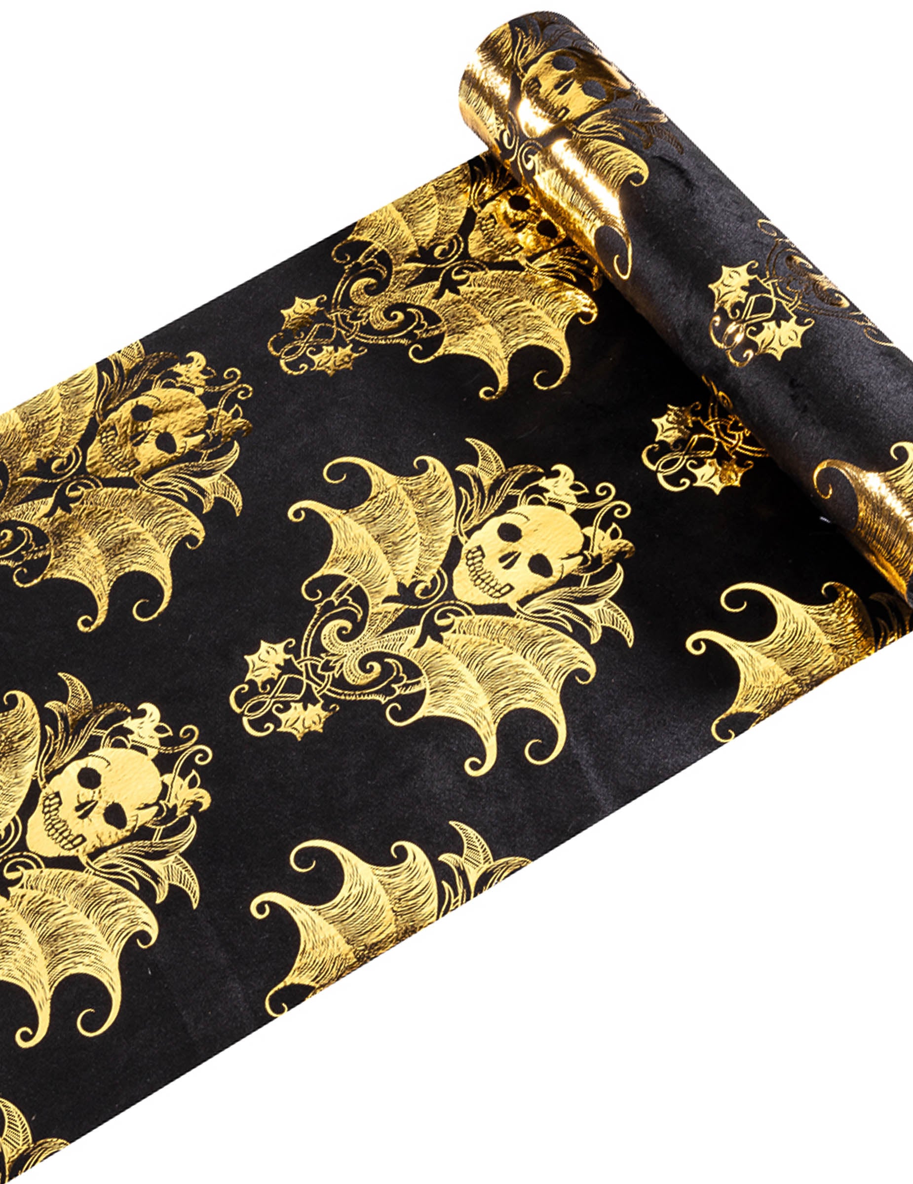 Această decorare a tabelului reprezintă un alergător de masă schelet și măsoară aproximativ 3 m lungime și 23 cm lățime. În catifea neagră în ansamblu, se caracterizează prin ornamente în formă de cranii aurii cu un stil baroc frumos. Consumatorul dintre cele două culori vă va face masa cea mai frumoasă a serii! Această masă de la masă va fi ideală pentru a vă perfecționa decorarea mesei în timpul serii de Halloween!