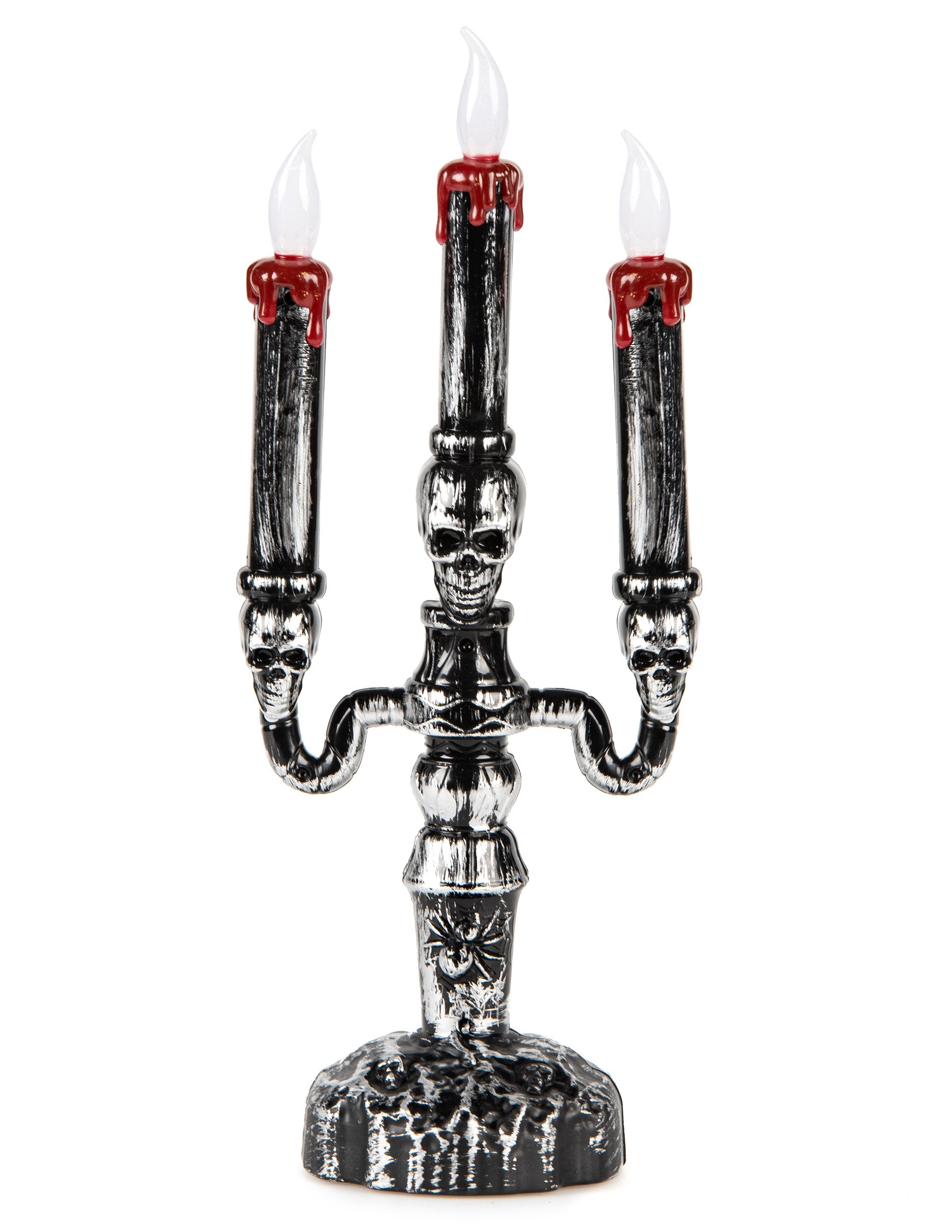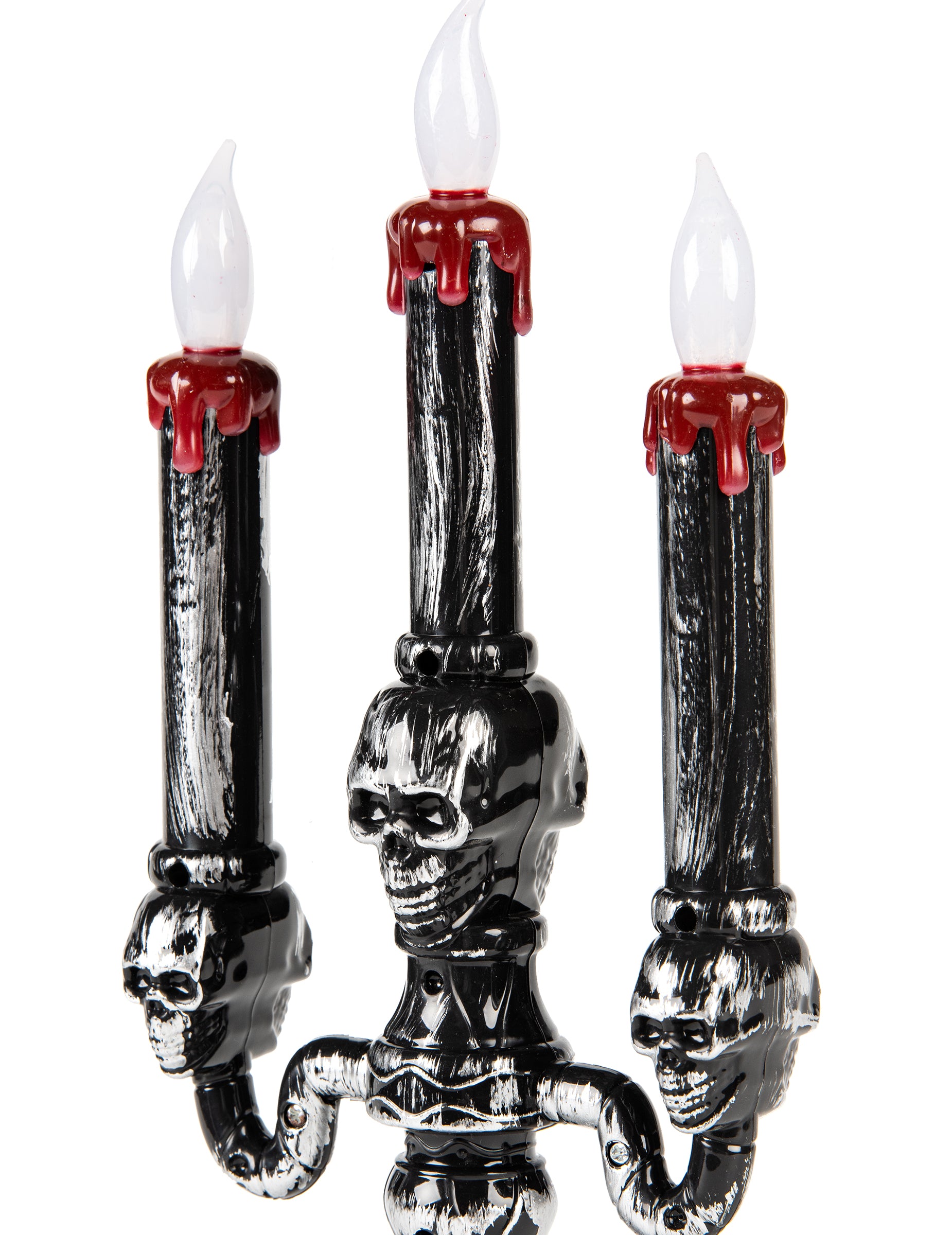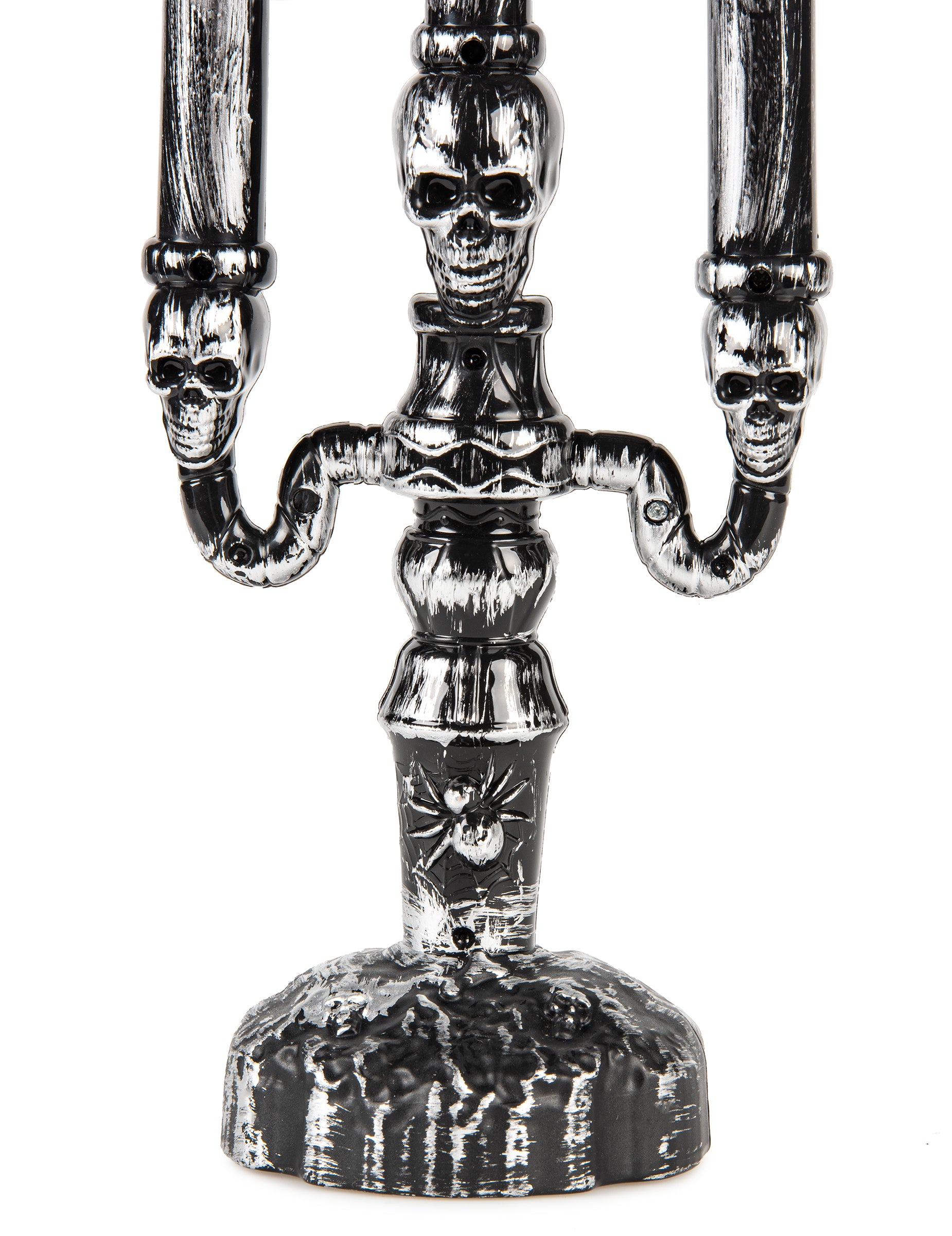 Acest decor reprezintă un sfeșnic LED. Cu o măsură de aproximativ 32 cm, are 3 ramuri cu capete false de morți ca decorare. Cu un aspcet cenușiu și îmbătrânit, este decorat de o flacără LED foarte realistă, care va funcționa folosind două baterii AALR6 (nu sunt incluse). Acest decor de sfeșnic va fi perfect pentru a -ți finaliza decorarea interioară în timpul serii de groază de Halloween!