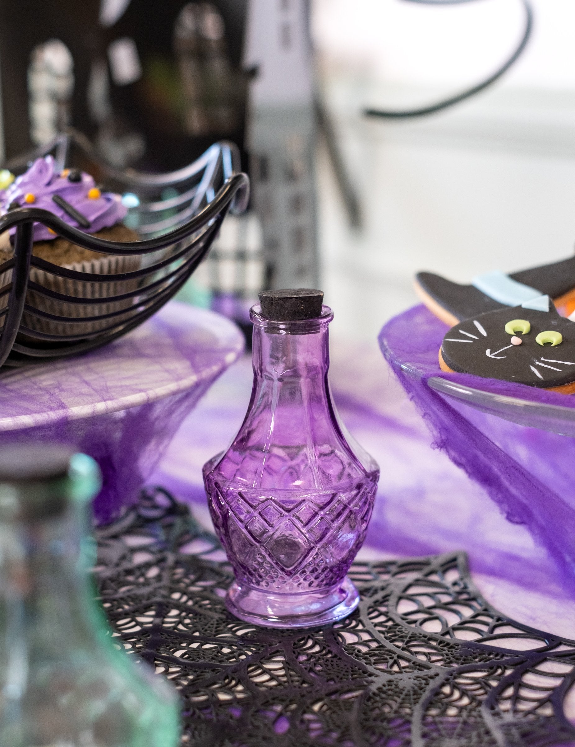 Această fiolă de sticlă măsoară 6,5 cm diametru și 11,5 cm Este înaltă și are o nuanță violetă. Un dop mic, cu aspect rustic, din plută neagră sigilează ermetic sticla, fiind ideală pentru depozitarea poțiunilor mistice. Această sticlă violetă este perfectă ca piesă centrală sau accesoriu într-un laborator de vrăjitorie. Adăugați o notă de magie petrecerii dvs. de Halloween cu această mică sticlă. Perfectă pentru a crea o atmosferă fermecătoare la adunările dvs. festive sau de Halloween.