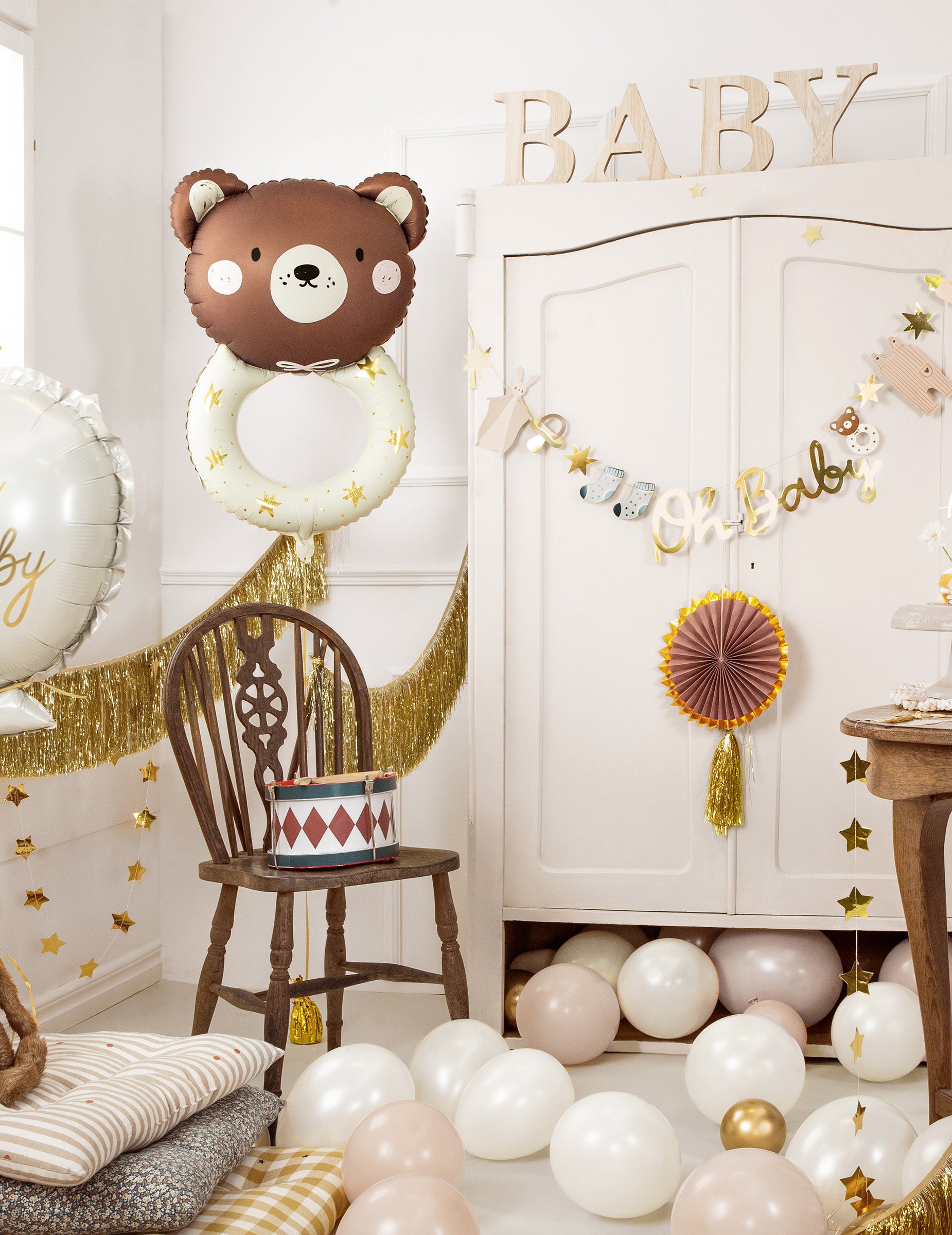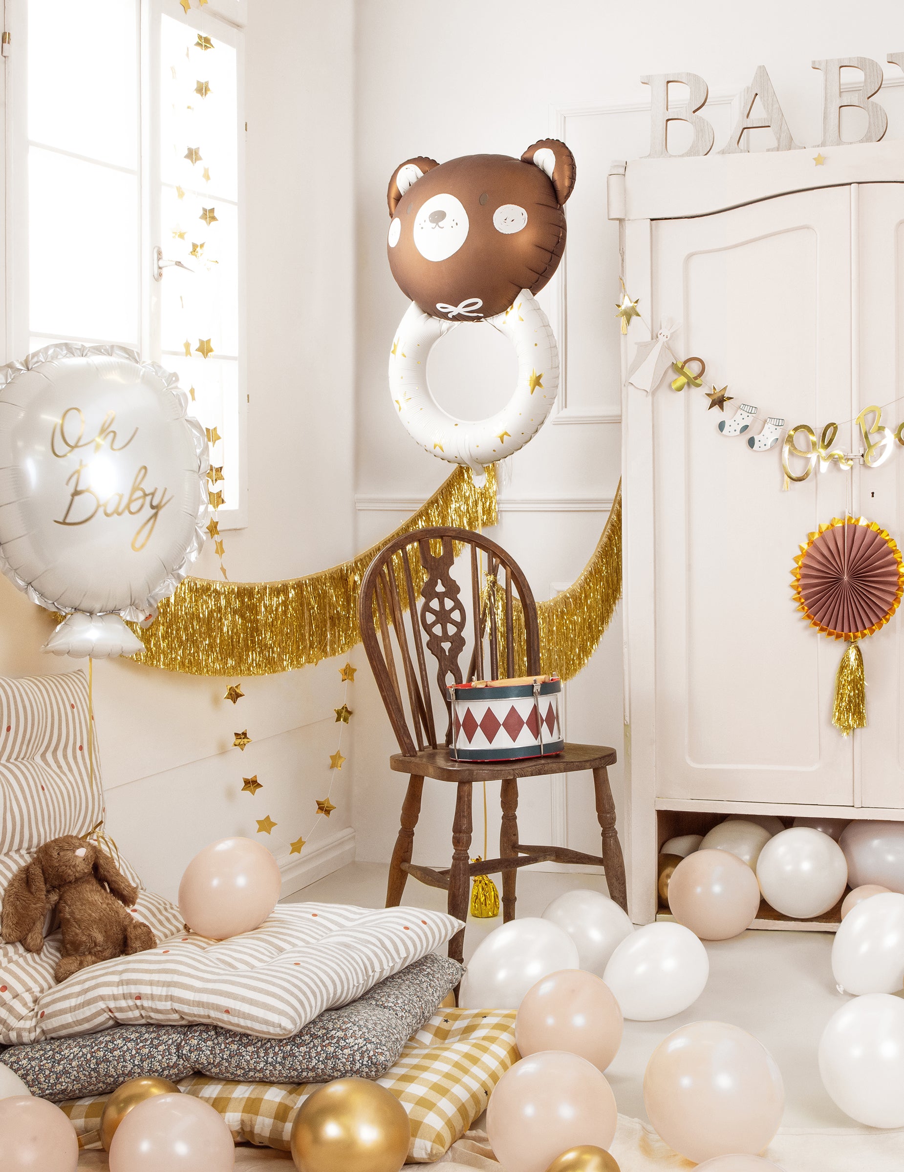 Acest balon Hochet Ourson măsoară aproximativ 61 x 88 cm și 45 x 67 cm odată umflat. Mingea reprezintă zgomotul unui copil depășit de un cap de urs. Puteți umfla balonul sau aerul cu paiele furnizate. Va fi o minge de urs perfectă pentru o primă zi de naștere, un duș pentru copii sau o dezvăluire de gen!