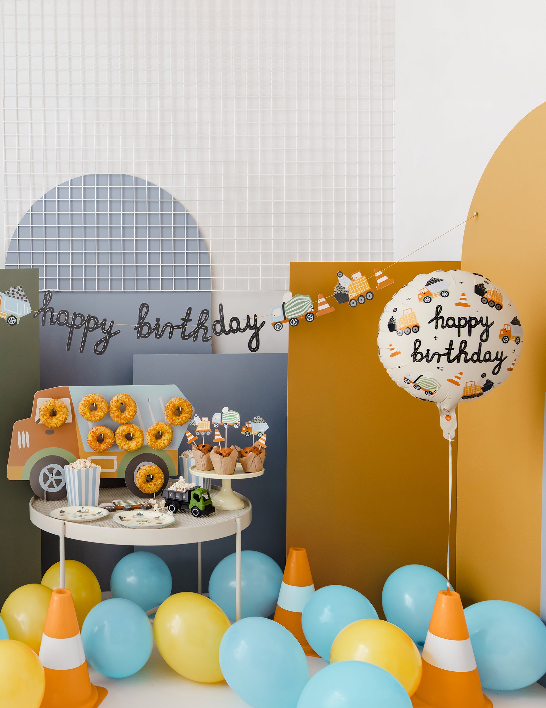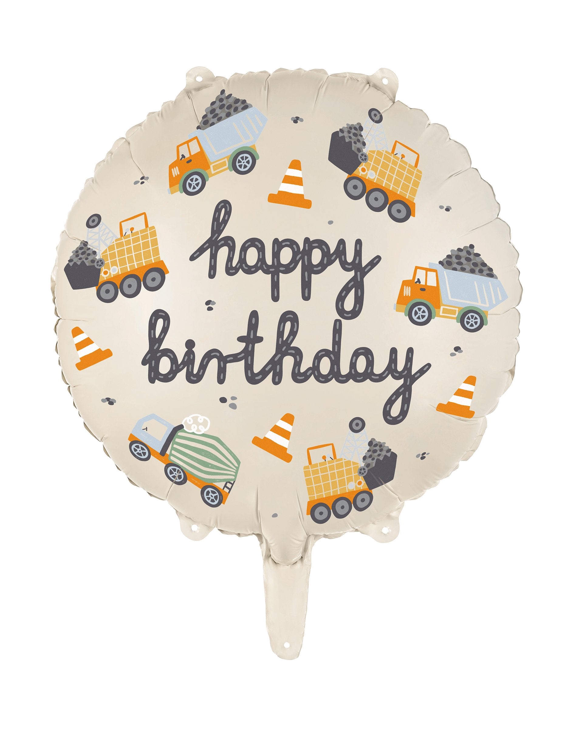 Acest balon de naștere din aluminiu are o formă rotundă și măsoară aproximativ 45 cm în diametru. Este tipărit cu mesajul „La mulți ani” înconjurat de camioane colorate și conuri de semnal, toate pe un fundal alb. Perfect pentru sărbătorile tematice, se umflă până la aproximativ 35 cm și este livrat cu o paie pentru o inflație ușoară în aer sau heliu.
