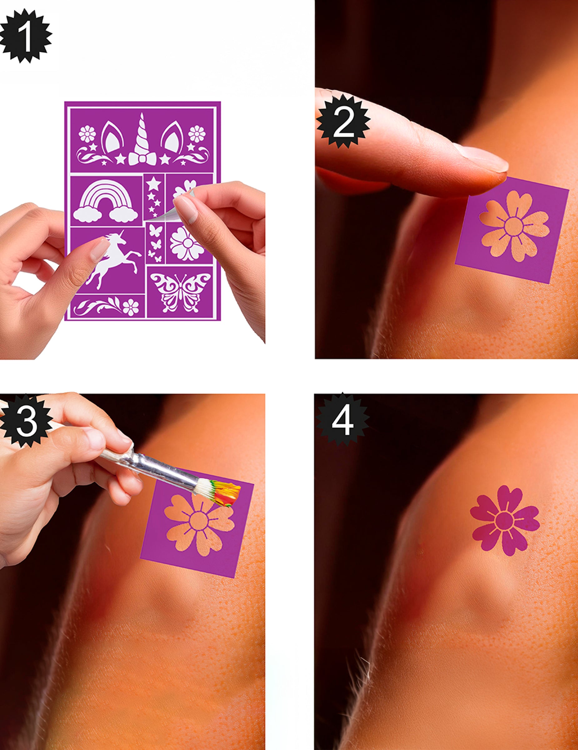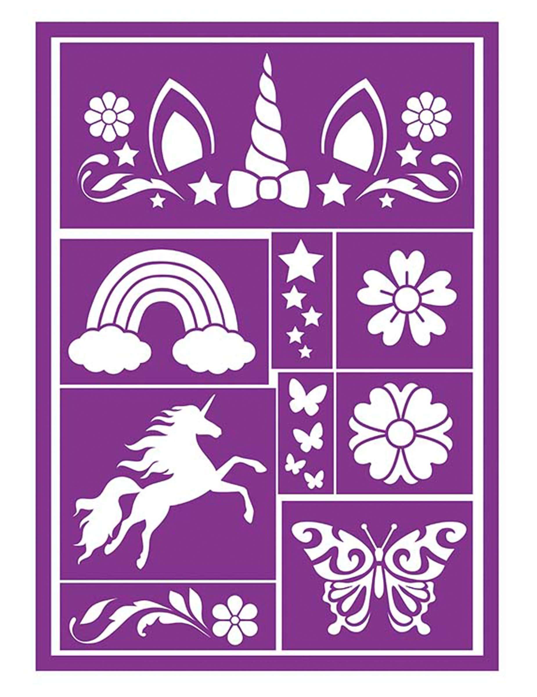 Acest stencil de machiaj are mai multe modele amintind de lumea minunată a unicornilor și a curcubeului. Veți găsi pe stencil un curcubeu, un unicorn, fluturi și alte modele care vă permit să vă transformați copilul într -un adevărat unicorn. Acest stencil va fi perfect pentru a face un machiaj unicorn magnific copilului tău pentru carnaval!