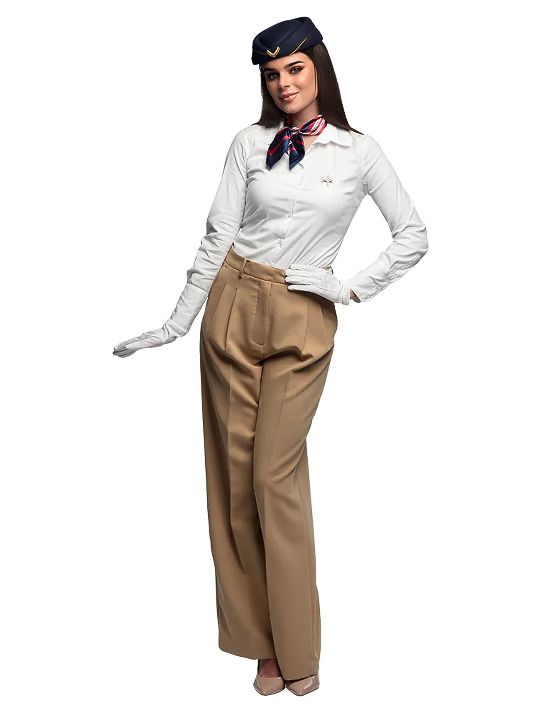 Acest set de accesorii pentru însoțitor de bord conține o pălărie, eșarfă, mănuși și ecuson. Șapca albastră este decorată cu o linie aurie elegantă și o insignă care evocă prestigiul și lumea companiilor aeriene. Eșarfa tricoloră de albastru, roșu și alb este legată în jurul gâtului, adăugând o notă de autenticitate și rafinament ținutei. O pereche de manusi albe completeaza ansamblul pentru un stil rafinat. În cele din urmă, o insignă distinctă completează aspectul de însoțitor de bord. Acest kit este ideal pentru o seară tematică sau pentru a străluci în timpul carnavalului.