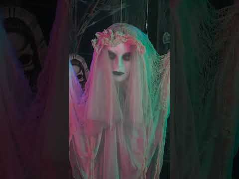 Această fantomă animată, suspendată, coboară și se ridică încet prin aer, dând impresia că plutește între două lumi. Draperia sa albă, învechită, părul zdrențuit și privirea absentă îi sporesc caracterul straniu. Măsoară aproximativ 120 x 65 cm. cm. De îndată ce este detectat un sunet, corpul său începe să se miște vertical, însoțit de un țipăt spectral care răsună prin cameră. Necesită 4 baterii AA (incluse). Ideal pentru a crea o atmosferă supranaturală demnă de cele mai bântuite case.