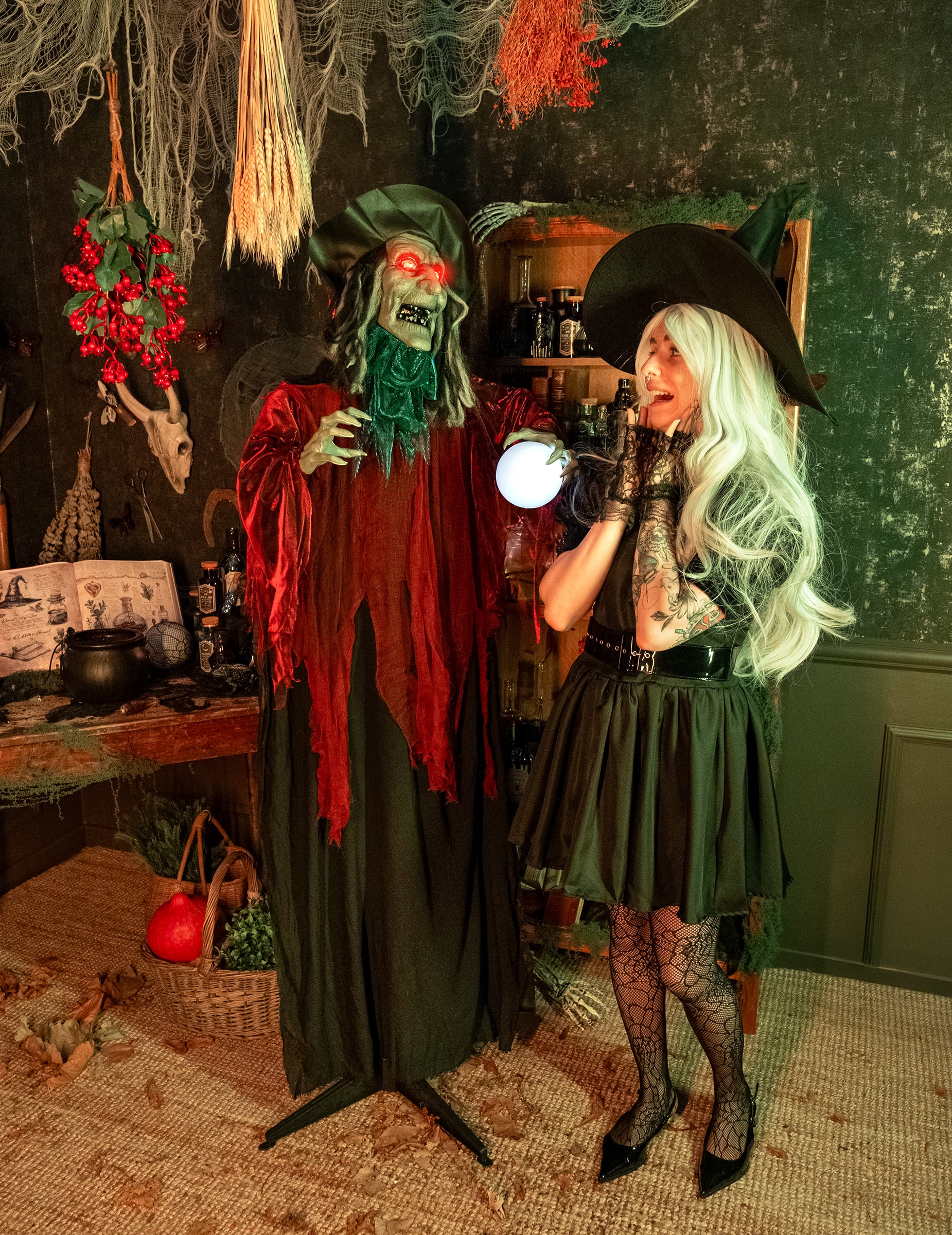 168 de înălțime cm, Această vrăjitoare animată atrage atenția prin prezența ei tulburătoare. Fața ei strâmbă, părul închis la culoare și ținuta mov și neagră zdrențuită îi întăresc imaginea de preoteasă întunecată. Se trezește la sunete ambientale: capul i se învârte, brațele i se mișcă în jurul sferei luminoase și un țipăt malefic răsună imediat. Necesită 3 baterii AA (incluse). O decorațiune vie pentru o seară de Halloween memorabilă și terifiantă.