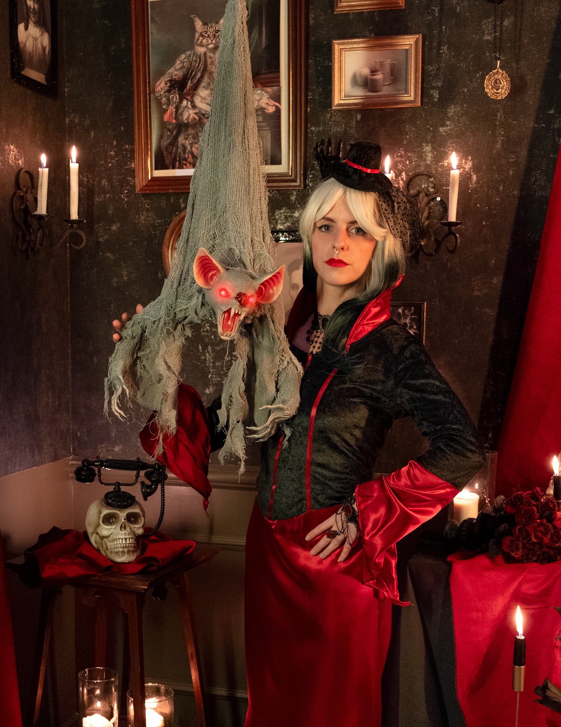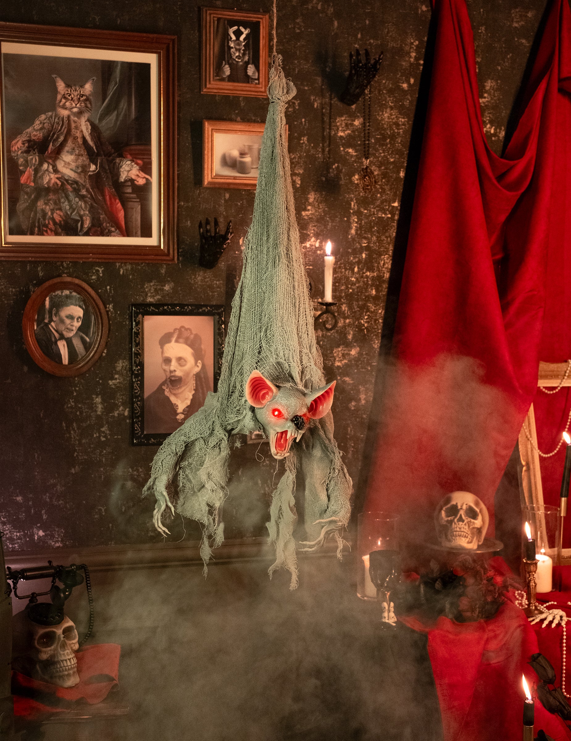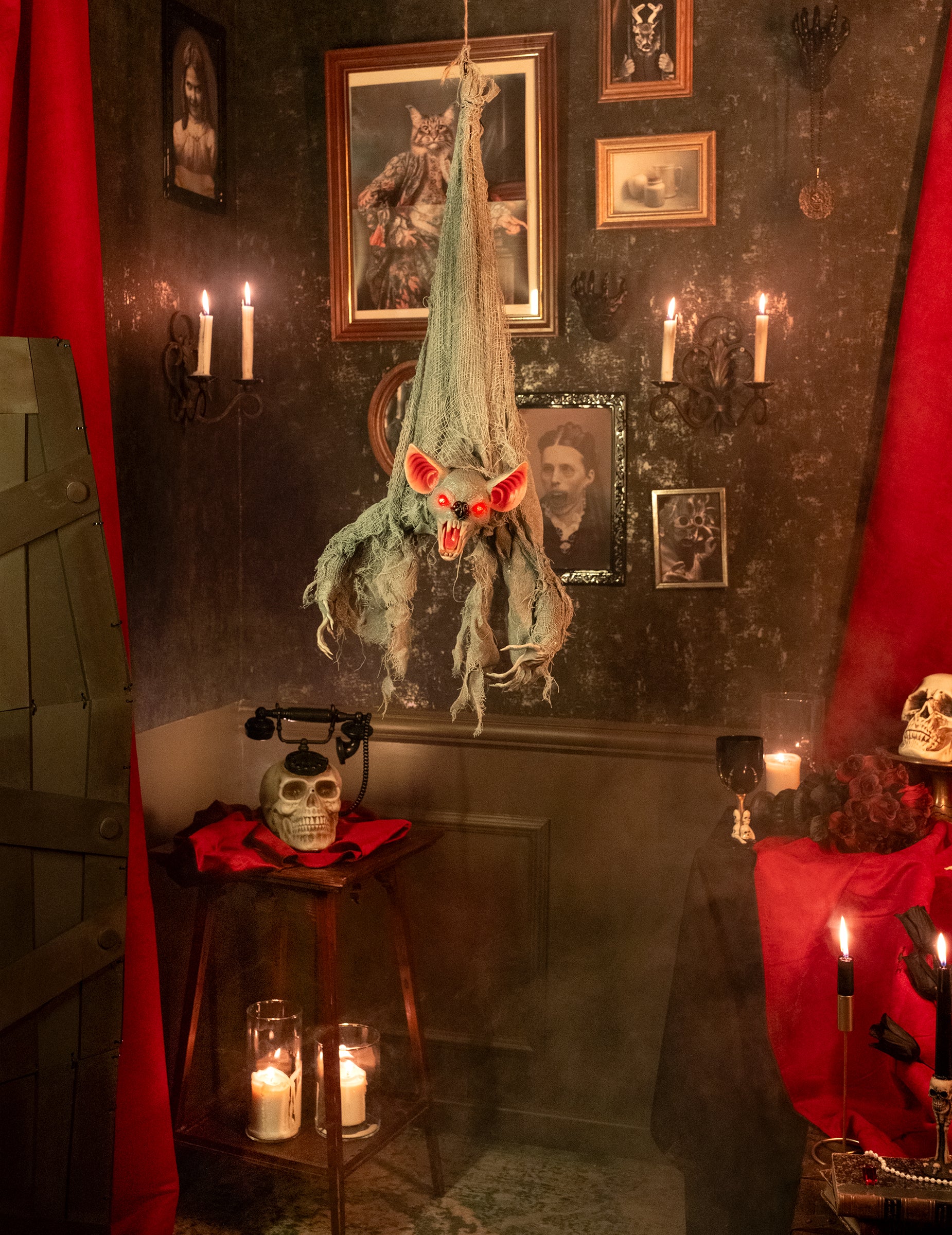 Acest liliac animat de 100 cm Această figurină atrage atenția cu corpul său zdrențuit, urechile proeminente și ochii roșii strălucitori. Suspendată cu susul în jos, prinde viață imediat ce detectează sunet: capul său începe să se miște, brațele îi flutură și un țipăt terifiant erupe. Aspectul său uzat și mișcările sacadate o fac perfectă pentru un efect vizual izbitor, fie în interior, fie la intrarea într-un local. Necesită 3 baterii AA (incluse). Ideală pentru o scenă de groază suspendată.