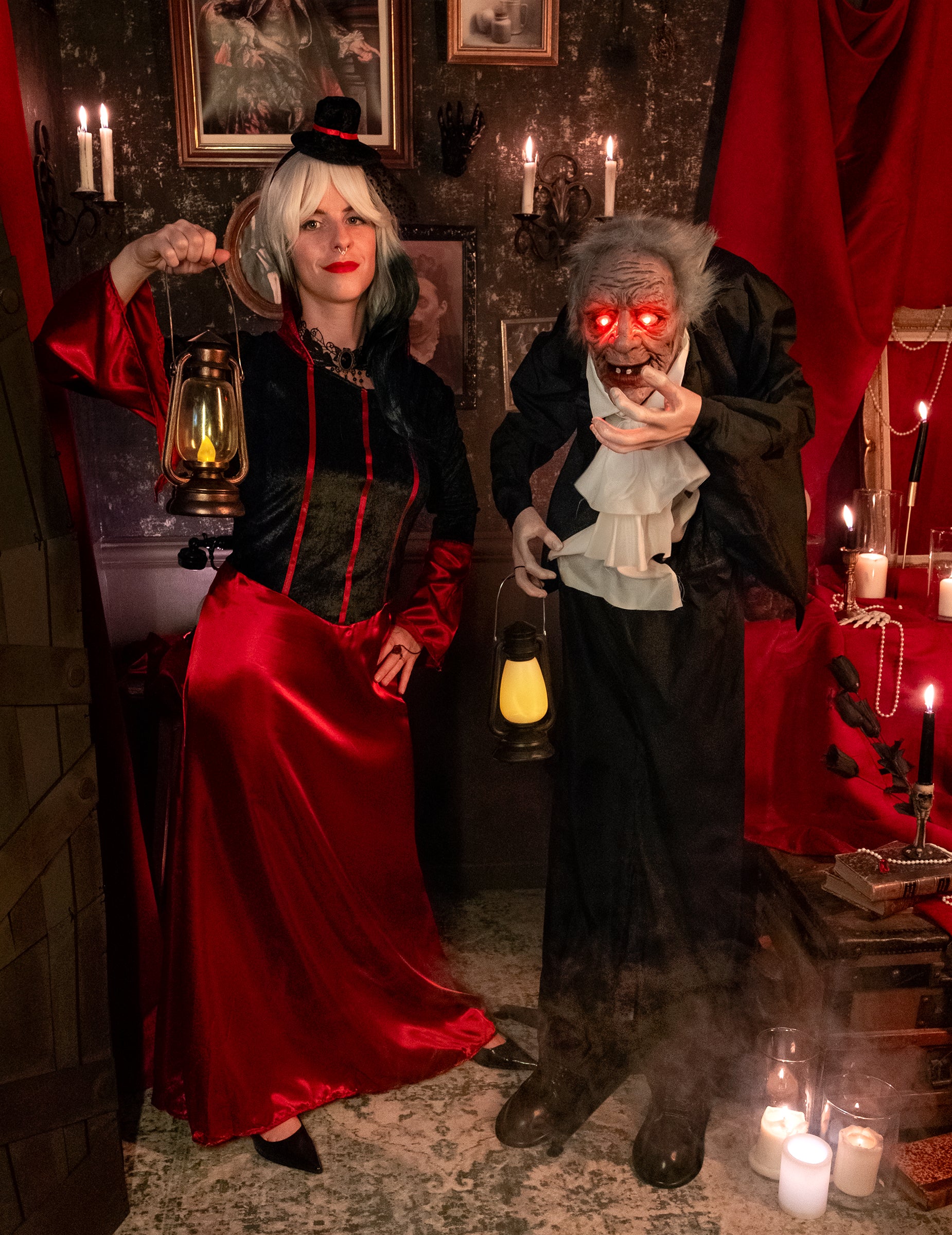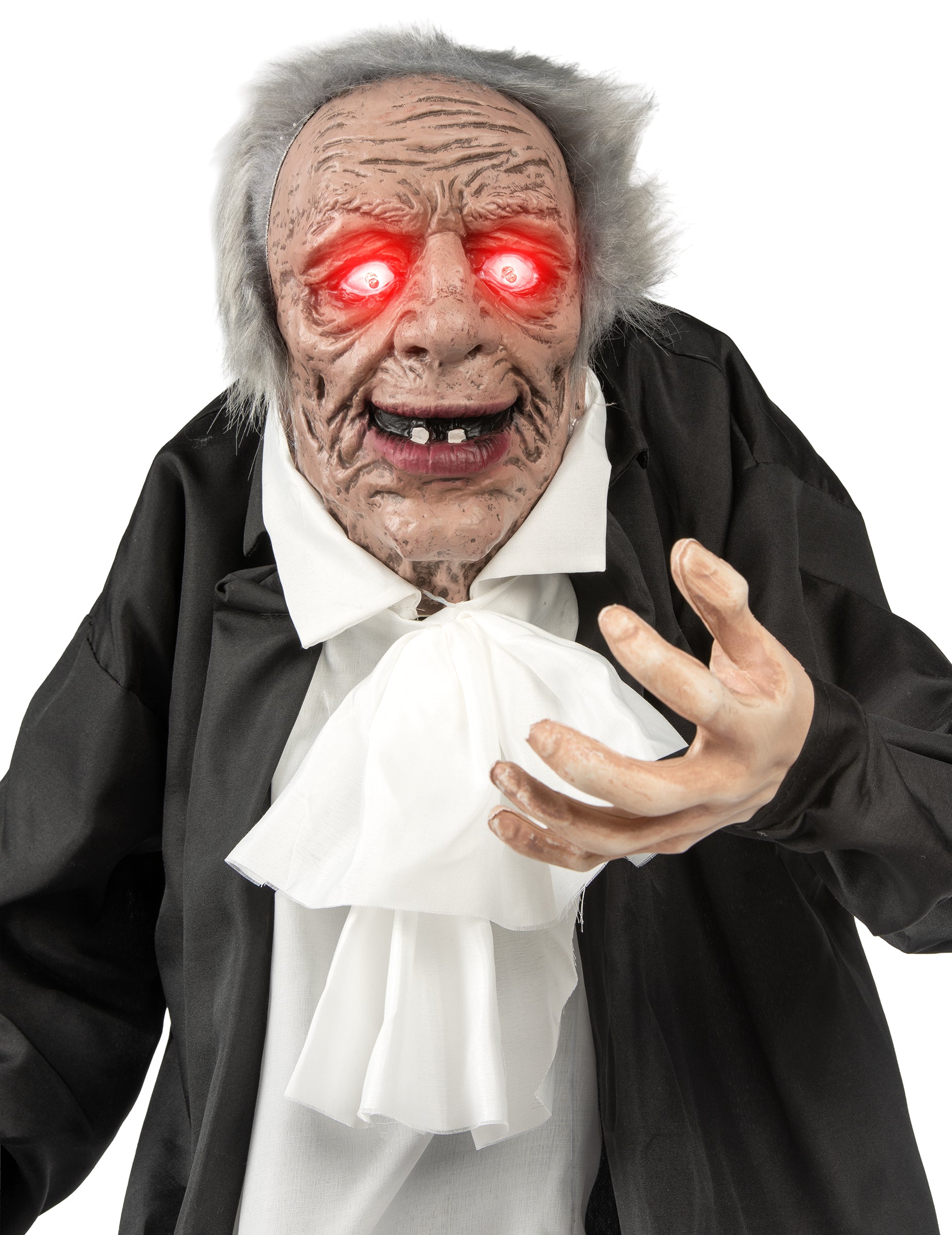 Acest Gardian Blestemat cu Lanternă, 158 x 120 cm, Dă senzația tulburătoare a vegherii asupra unui loc abandonat. Chipul său tulburător, trăsăturile obosite și postura cocoșată inspiră imediat neîncredere. Îmbrăcată în haine închise la culoare, contrastate de o cămașă cu volane, flutură un felinar sumbru, gata să se aprindă. Când se aude un zgomot, izbucnește un strigăt sinistru, ca și cum s-ar fi trezit un blestem. Bateriile incluse în figurină și lampa sa sunt ideale pentru activarea acestei prezențe macabre, perfecte pentru o prezentare captivantă și terifiantă.