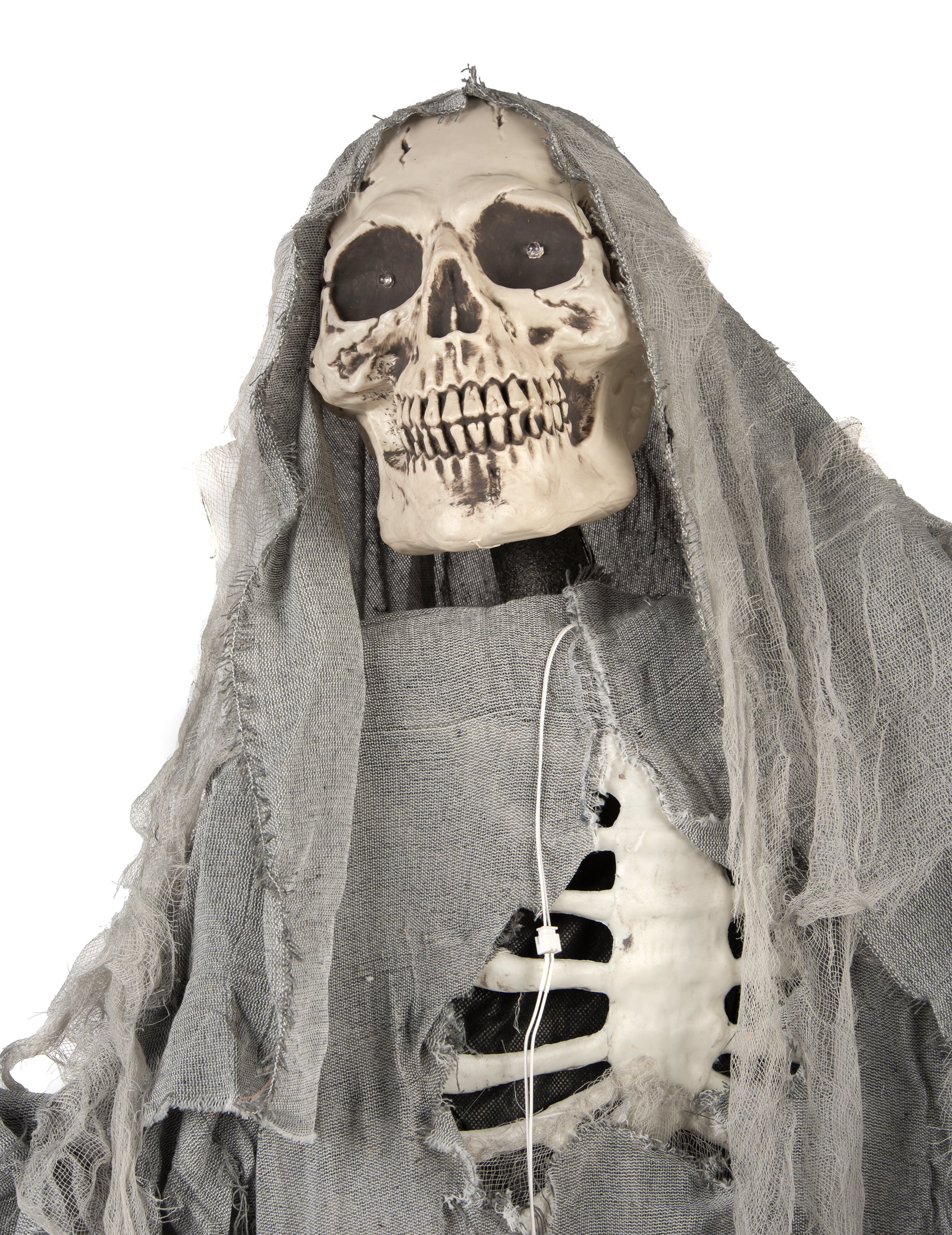Cu cele 183 de cm În picioare, Secerătorul Plutitor Înfricoșător atrage atenția. Învelit în văluri gri zdrențuite și mânuind o coasă neagră impunătoare, creează iluzia unui spirit plutind în aer, gata să atace. La cel mai mic sunet, capul său prinde viață, ochii roșii i se aprind și izbucnește un țipăt sinistru. Este activat de un comutator, care îl pune în modul standby cu o simplă mișcare. Decorațiunea funcționează cu 3 baterii AA (incluse). Așezați-o pe un hol sau într-un colț întunecat pentru a crea o atmosferă izbitoare de fiecare dată când cineva trece pe acolo. (3 baterii AA incluse)