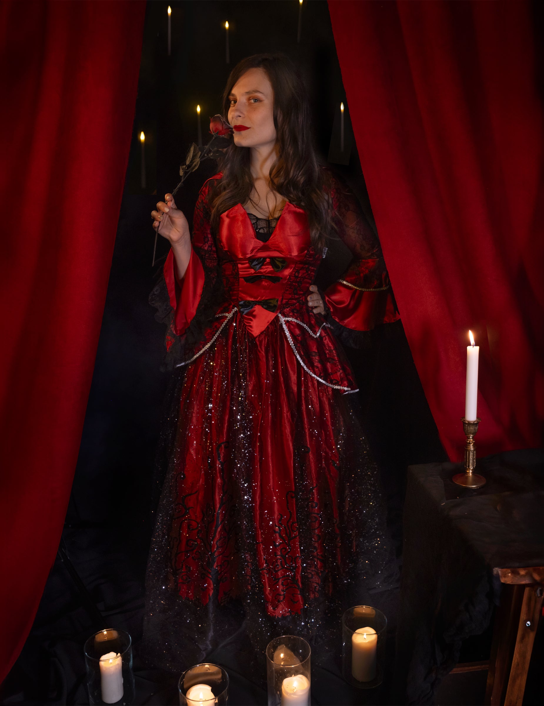 Acest costum de regină vampir de lux pentru femei este format dintr -o rochie somptuoasă și o petticoat voluminoasă, pentru un elegant, așa cum se îngrijorează. Rochia, cu un roșu intens, cu reflecții din satin, este sublimată de un bust reglat care evidențiază silueta. Decolteul plonjat, încadrat de o trecere rigidă înaltă, aduce o atingere regală și misterioasă. Mici noduri negre decorative situate în față, adaugă un finisaj rafinat întregului. Mânecile lungi și evazate afișează un stil gotic cu panourile de dantelă și granițele lor din tul negri. Între timp, partea inferioară a rochiei este acoperită cu un voal de tul negru vaporos, ceea ce sugerează modele subtile întunecate și oferă ținutei un efect plutitor și spectral. În cele din urmă, petticoat -ul integrat aduce volum rochiei, garantând o prezență regală la fiecare dintre aparițiile tale. Ideal pentru Halloween, o minge gotică sau o seară tematică, acest costum te va transforma într -o regină a întunericului la fel de maiestuos pe cât de înspăimântător!