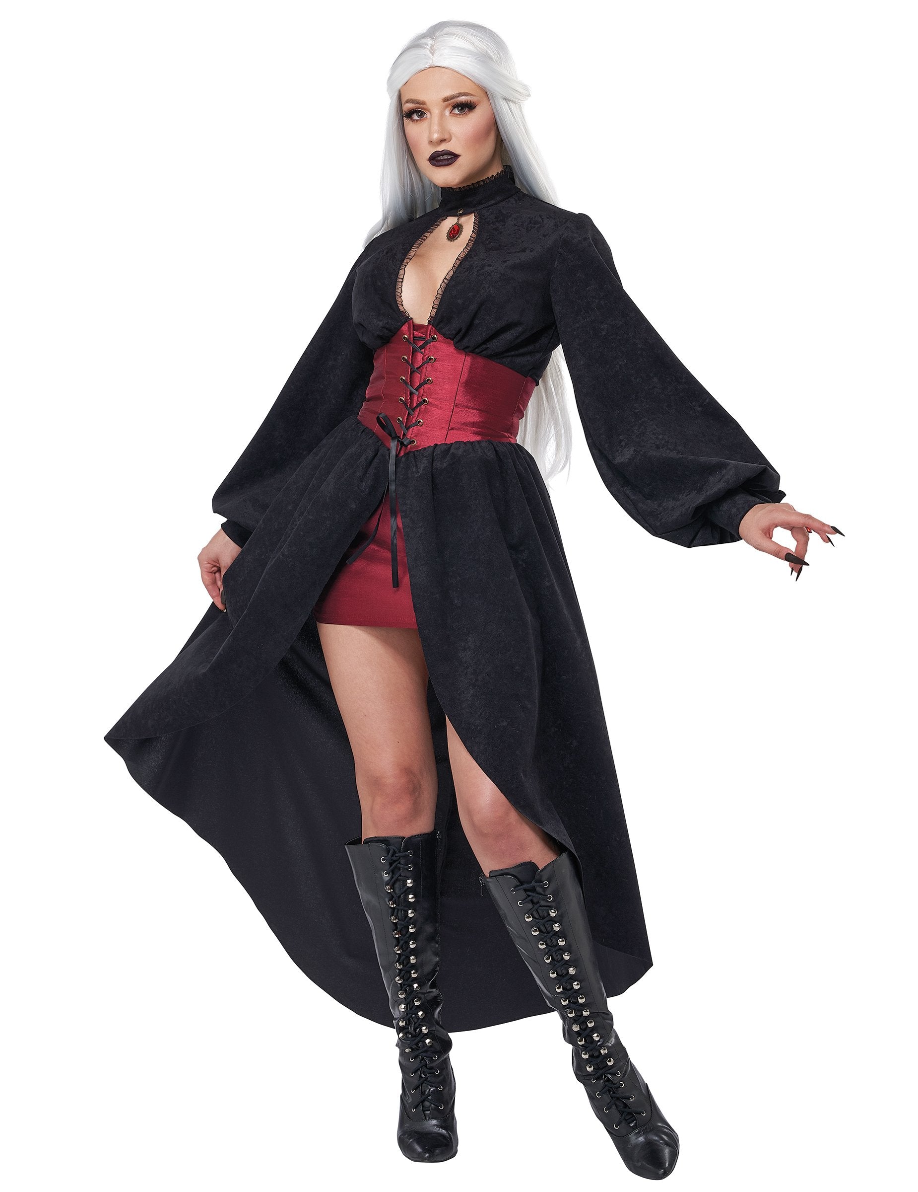 Ce déguisement élégant et ténébreux vous transforme en une vampire charismatique et séduisante, parfaite pour hanter les soirées déguisées. Il se compose d’un manteau long noir à manches bouffantes, au tissu texturé et fluide, apportant une allure mystérieuse et majestueuse. L’élément phare de cette tenue est son corset rouge à lacets, qui sublime la silhouette et ajoute une touche de sensualité. La jupe courte assortie, associée à des bas résille et des bottes noires, renforce le style gothique et séduisant du costume. Idéal pour Halloween, une soirée vampire ou un bal gothique, ce déguisement vous garantit une prestance envoûtante. Associez-le à un maquillage sombre et des accessoires comme un collier en velours ou une canne élégante pour un effet encore plus saisissant !