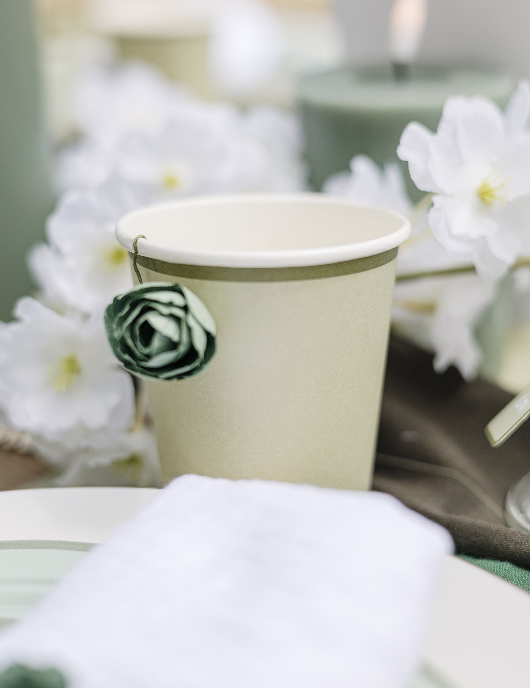 Sublimez votre table de fête avec ce lot de 6 gobelets en carton aux nuances apaisantes de vert de gris et vert sauge. Leur design bicolore minimaliste et tendance s'harmonise parfaitement avec une décoration champêtre, bohème ou naturelle. Conçus pour servir tout type de boissons, ils marient élégance et fonctionnalité. Ces accessoires sont les compagnons idéaux pour un mariage , une baby shower ou un baptême aux inspirations végétales et douces.